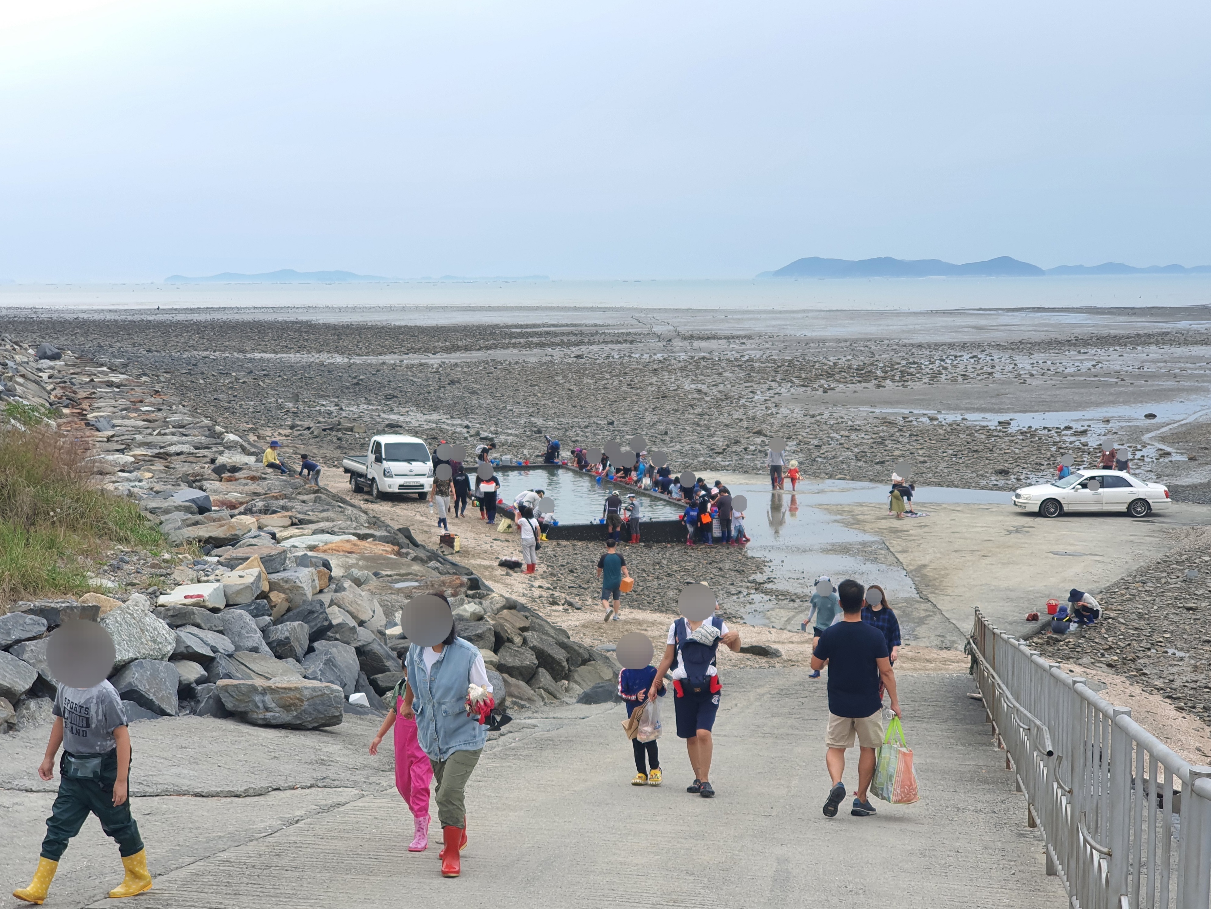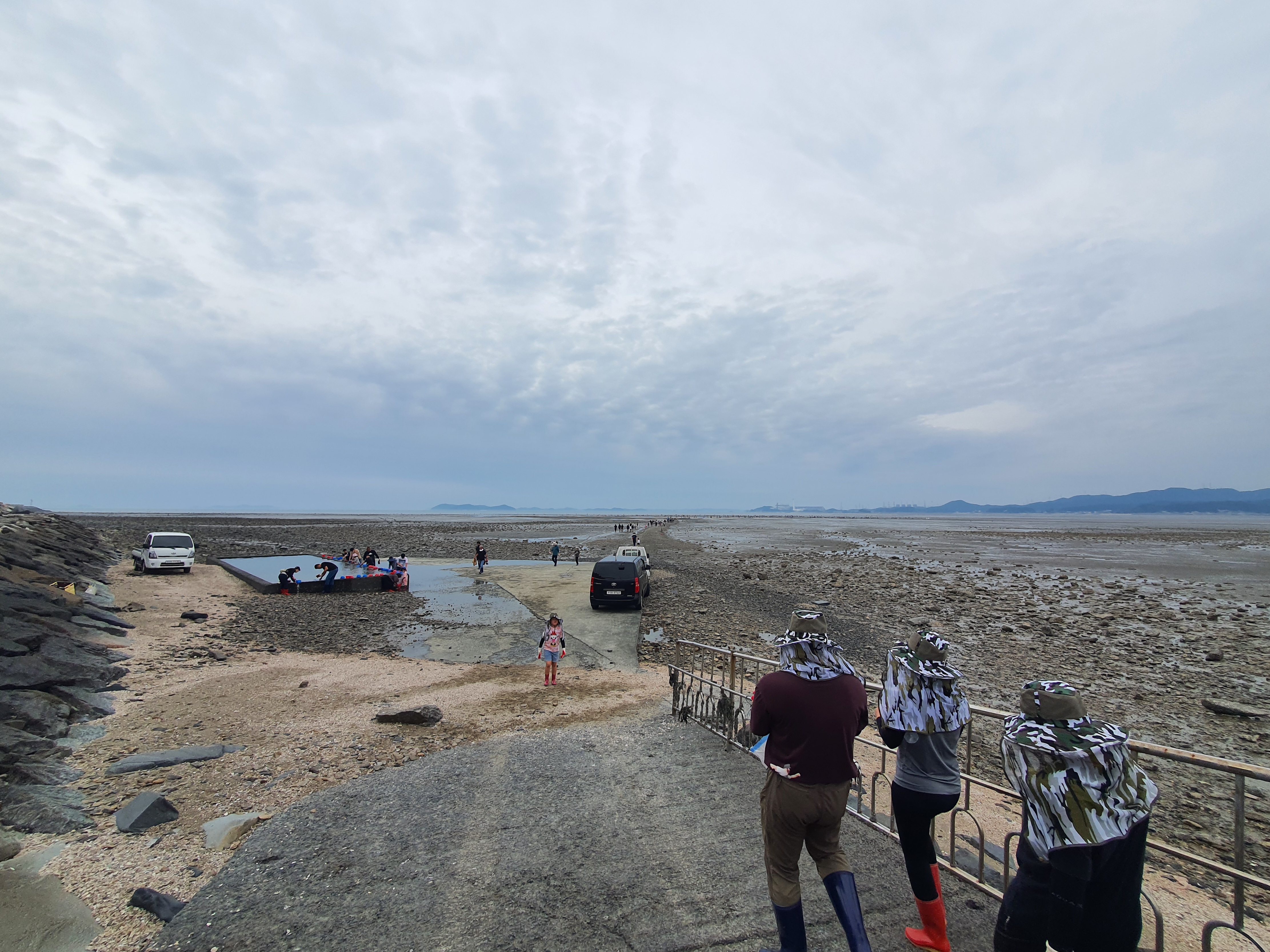 준비가 완료되면 길 건너 갯벌로 걸어갑니다. 들어가기 좋게 자갈을 깔아둔건지 자연스럽게 만들어진 건지 모르겠지만 300m정도 빨간 깃발을 따라 들어갑니다. 빨간 깃발을 벗어나면 발이 빠질 수 있는 갯벌이라 계속 주의를 주더군요.