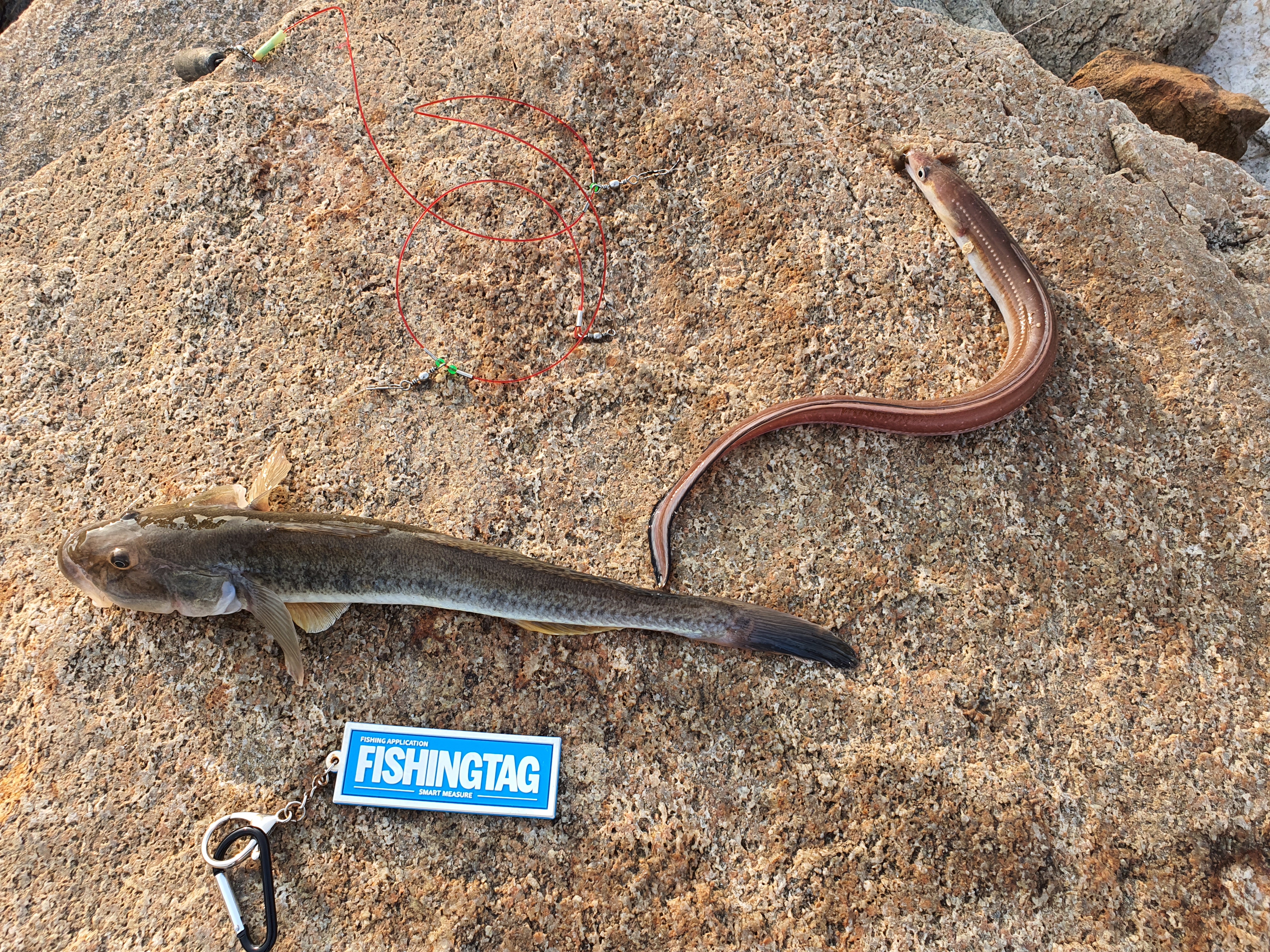 그래서 다시 캐스팅하니 또다시 입질 반응이 옵니다. 이번에는 좀 더 확실히 물었다 싶을때까지 기다려 챔질하니 묵직한 손맛이 전해 오네요. 일타이피! 장어와 망둥어 쌍걸이입니다.
