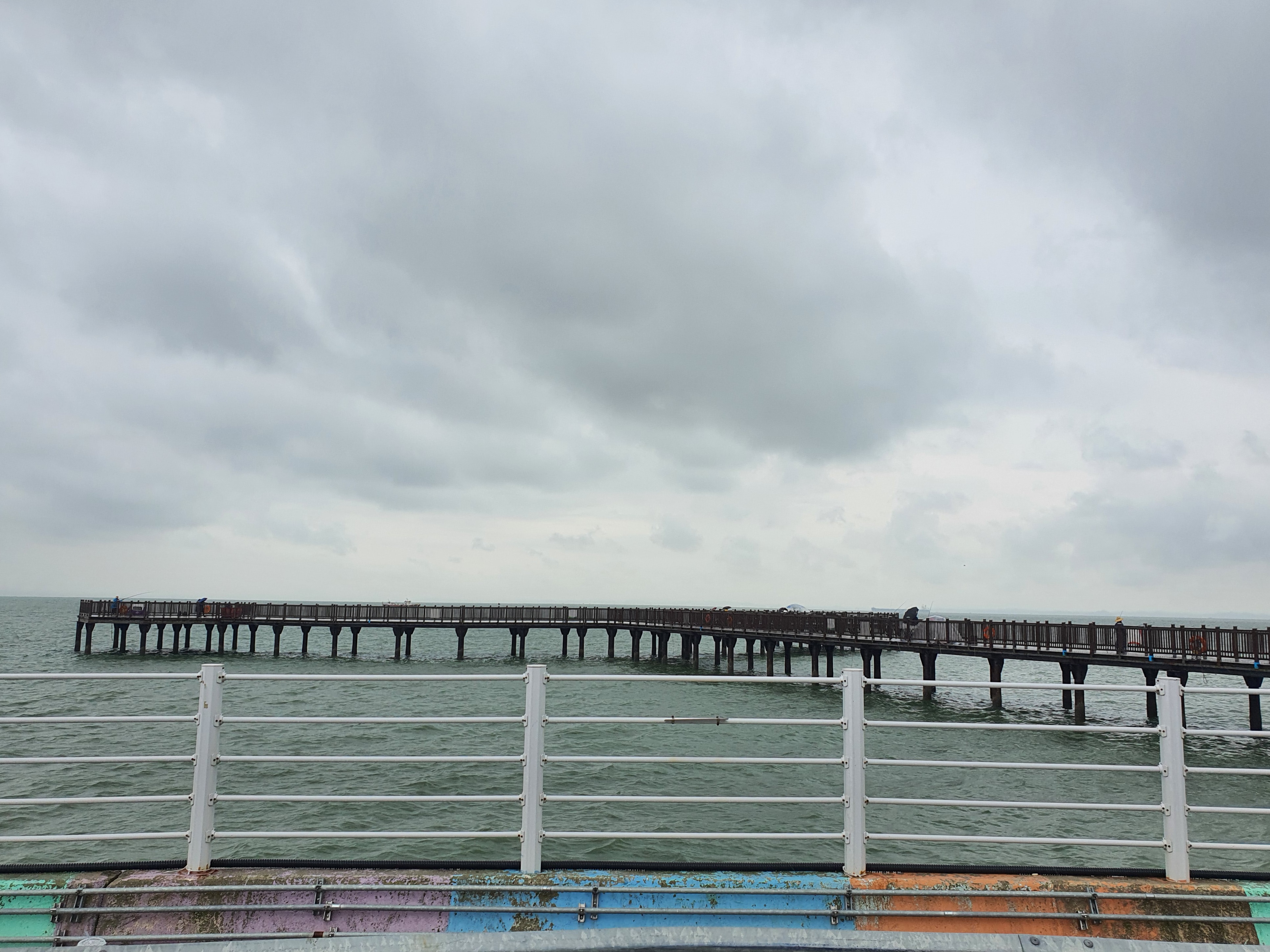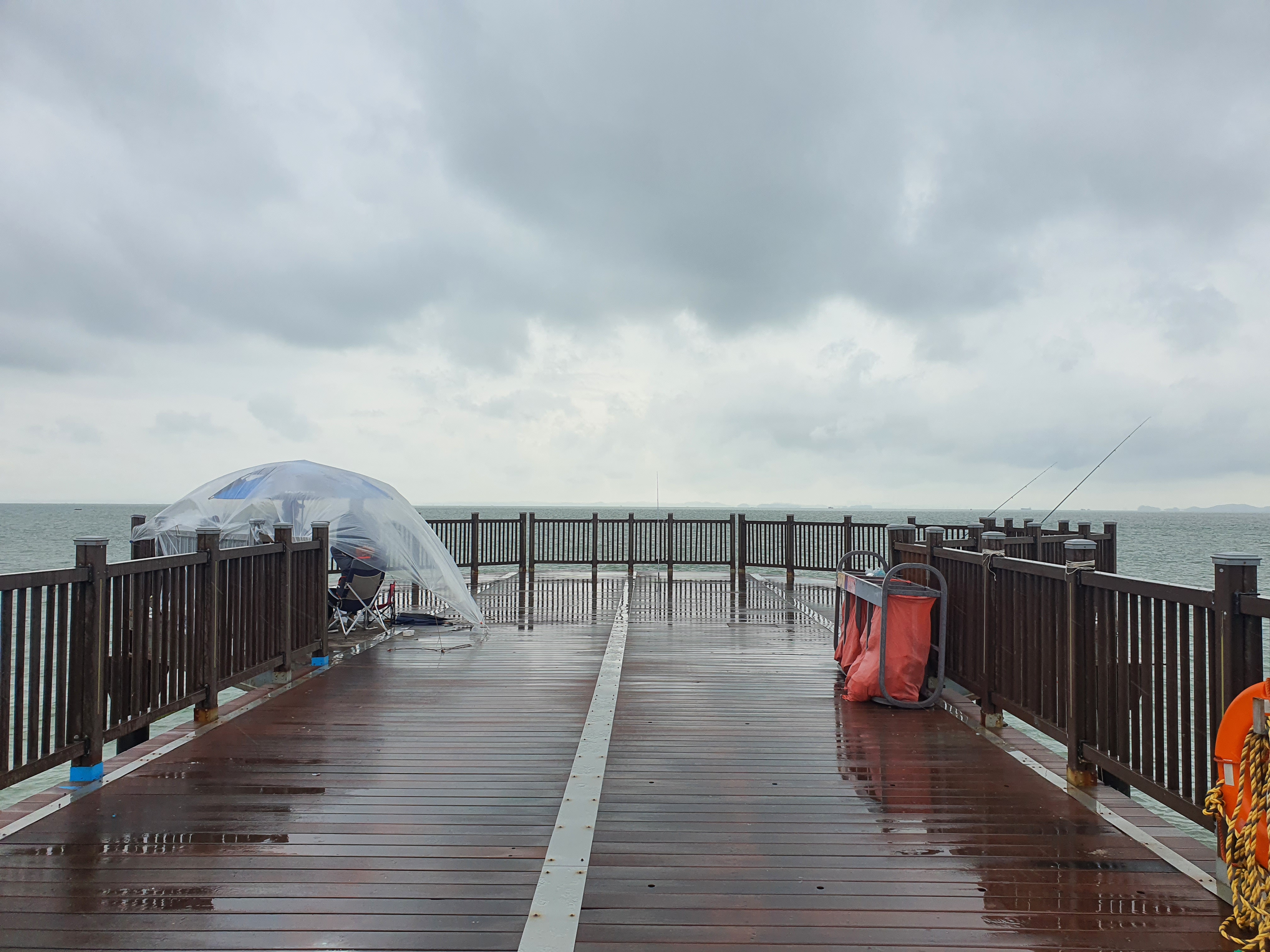 피싱피어 전경입니다. 물이 완전히 빠지는 간조때에도 물이 있어서 언제나 낚시가 가능한 곳이죠. 다만 간조때에는 수심은 그다지 나오지 않습니다. 그리고, 생활낚시를 하시는 분들이 많아 맑은날이었다면 자리가 없었을겁니다.