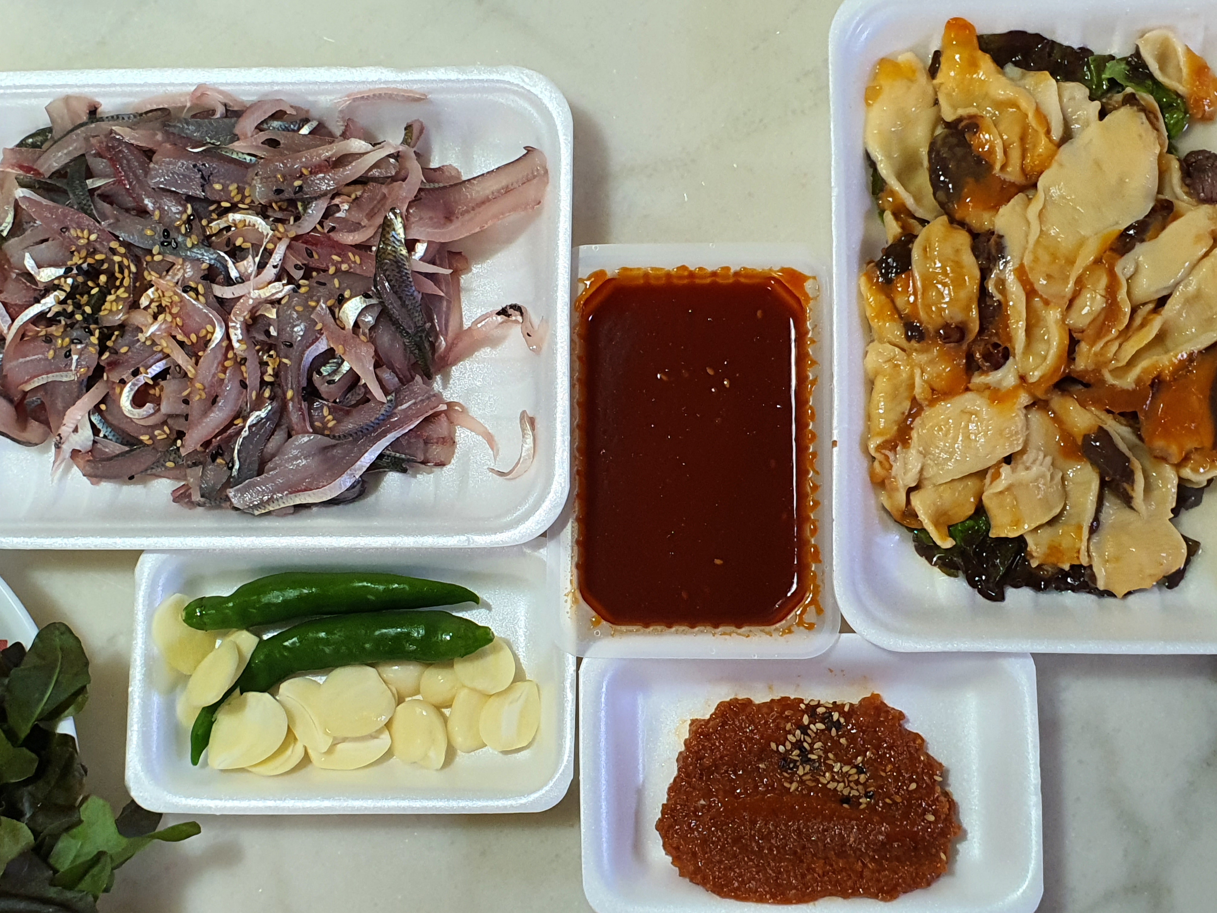 각각 1.5만, 1만으로 계산한 것으로 기억하는데, 포장을 해 왔지만, 기본적인 초장과 고추, 마늘등은 챙겨주더군요. 둘이서 먹기에는 꽤 많은 양이었습니다.