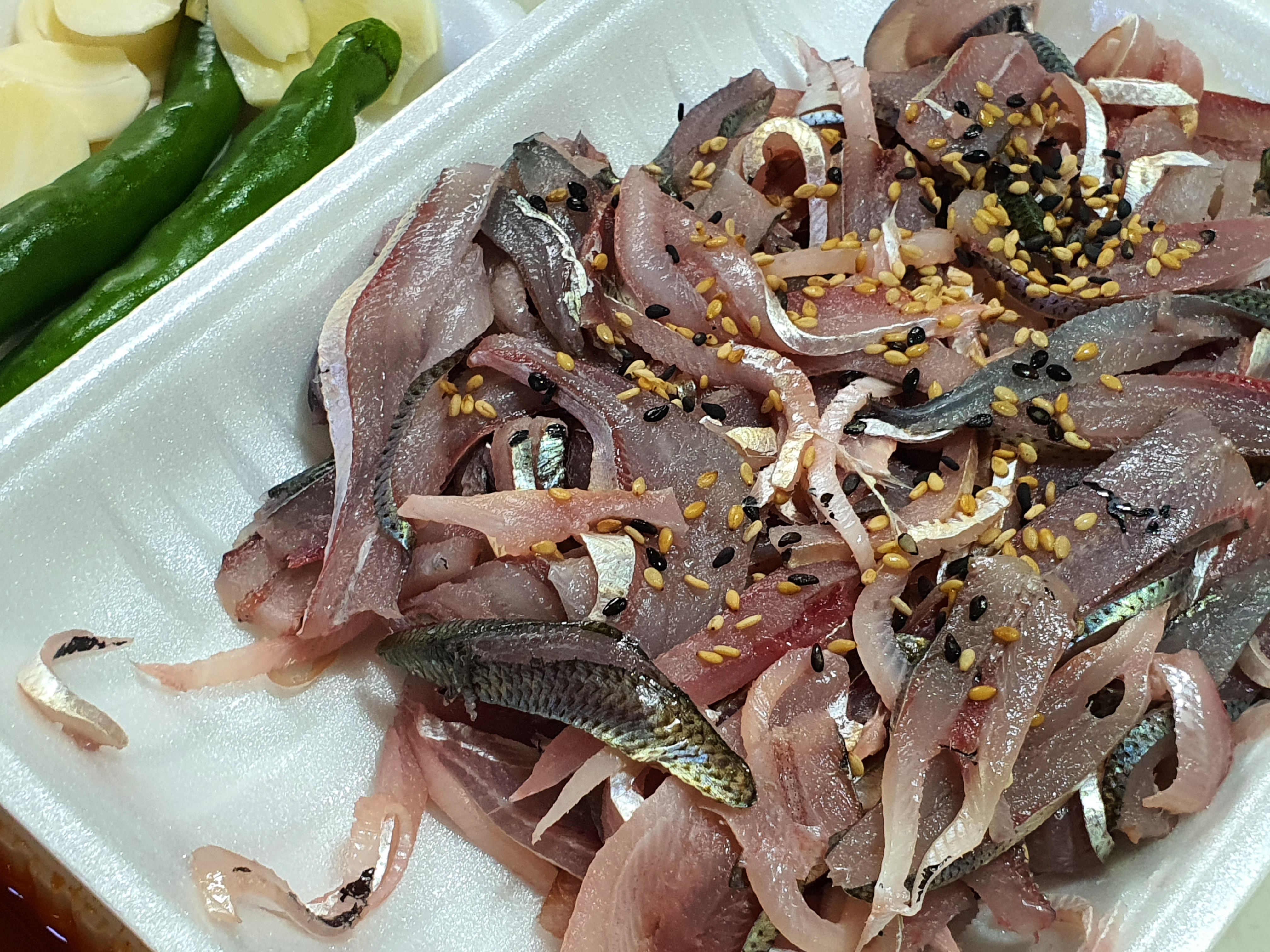 어느새 새꼬시로 손질된 전어와 먹음직스럽게 손질된 멍게입니댜.
