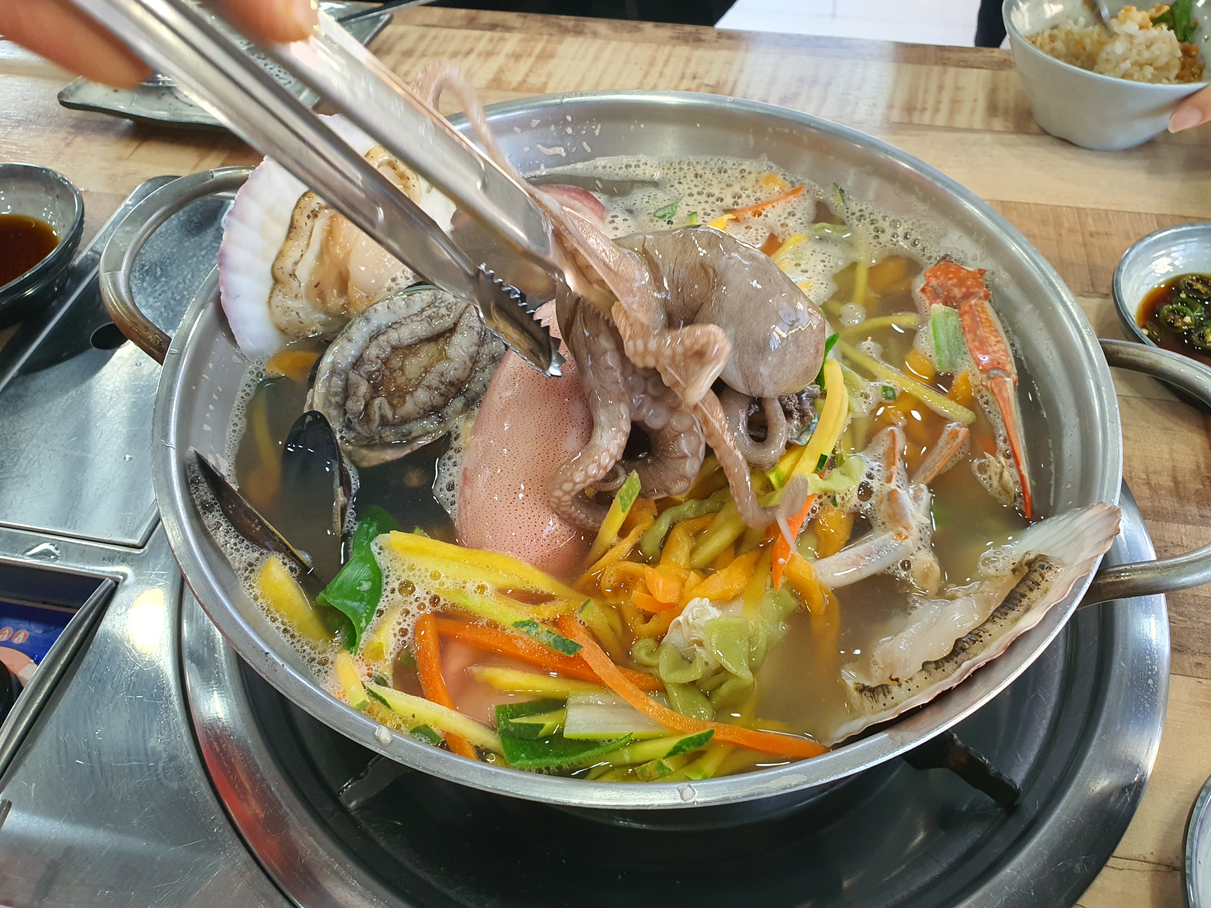 해물칼국수가 바로 나옵니다. 낚지, 전복, 가리비와 참게등의 해산물과 칼국수가 맛들어지게 요리됩니다.