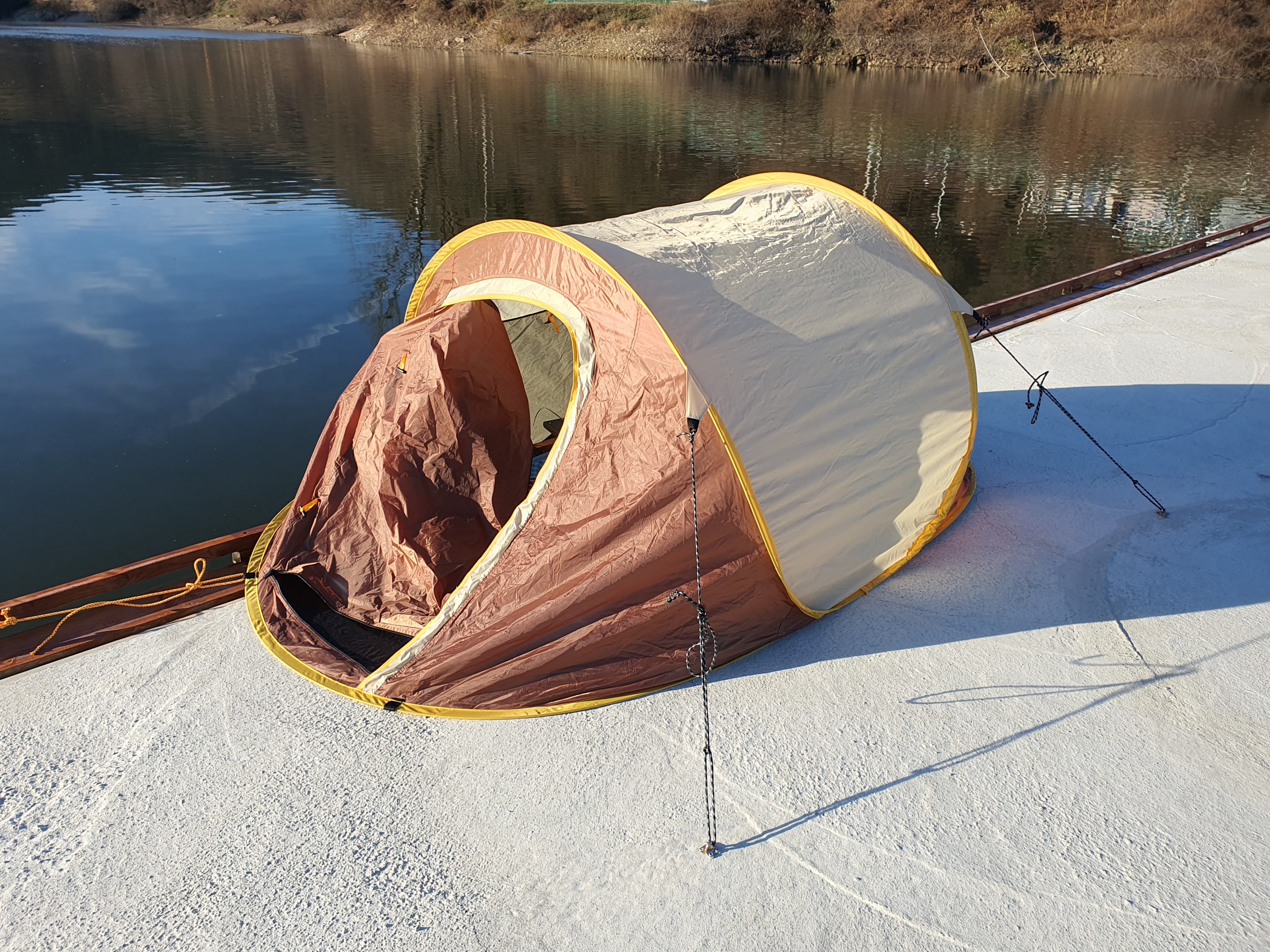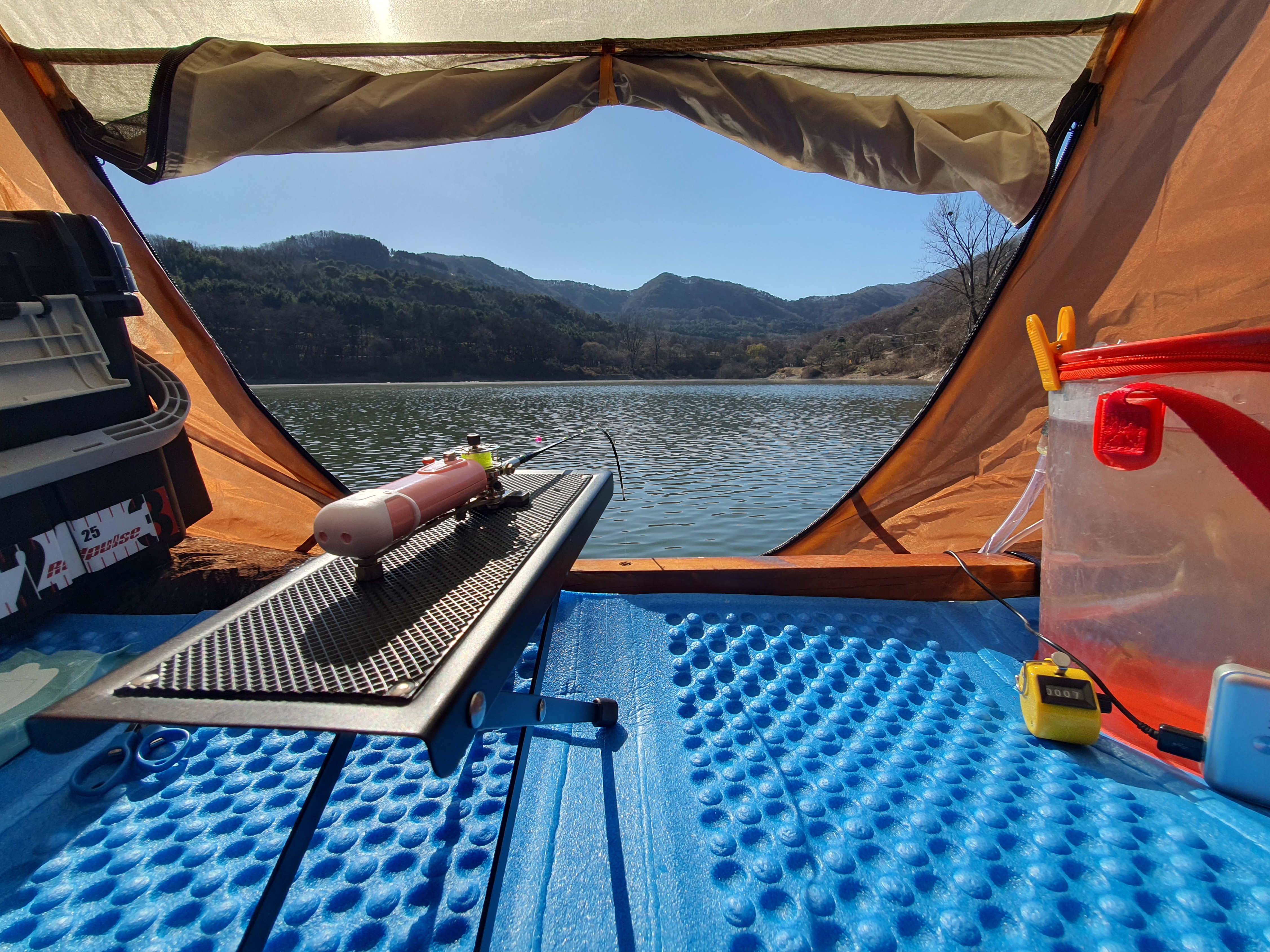 텐트는 낚시터 방침상 2×2m 이내 사이즈만 설치 가능합니다. 큐브텐트 2.4m이상은 아쉽지만 설치 불가하다고 하더라구요. 원터치 텐트라 문제없이 설치합니다.