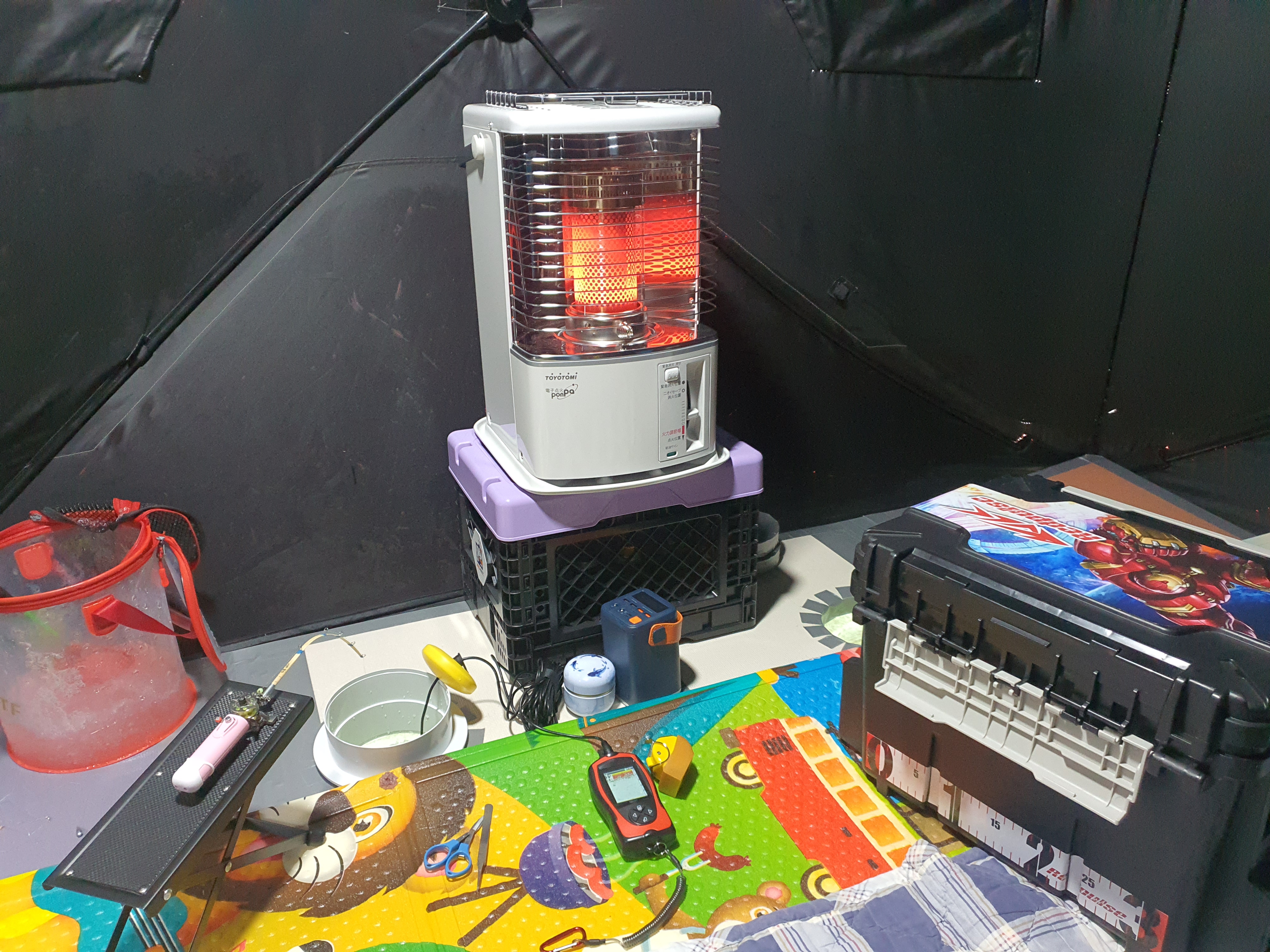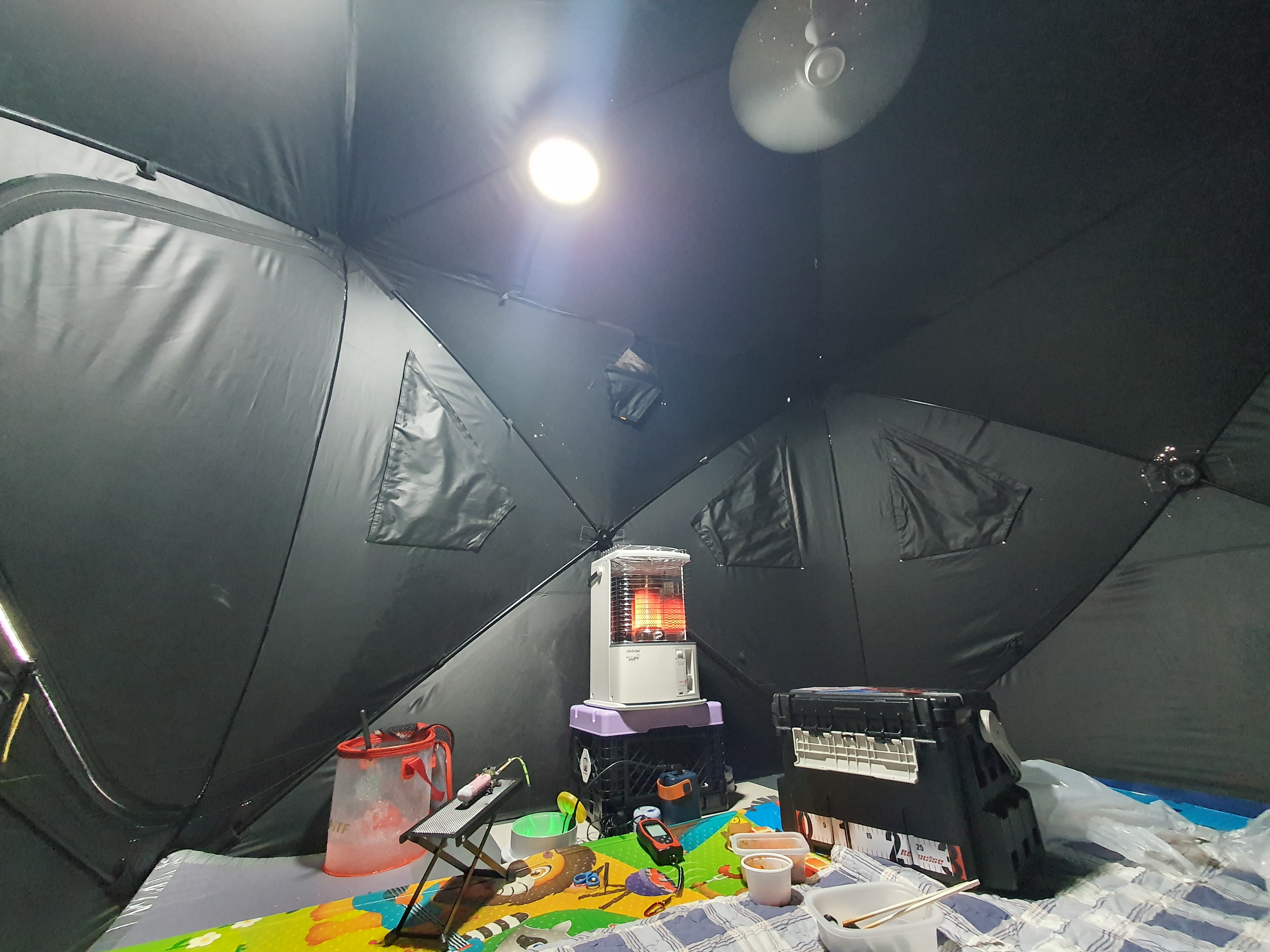 아이는 피래미 소식에 낚시는 관심없고 게임만 합니다. 그래도 알리에서 구매한 랜턴와 공기 순환을 위한 타프팬도 사용기에 전혀 무리가 없어서 따뜻한 탠트 안에서 시간을 보낼 수 았어서 다행이었습니다.