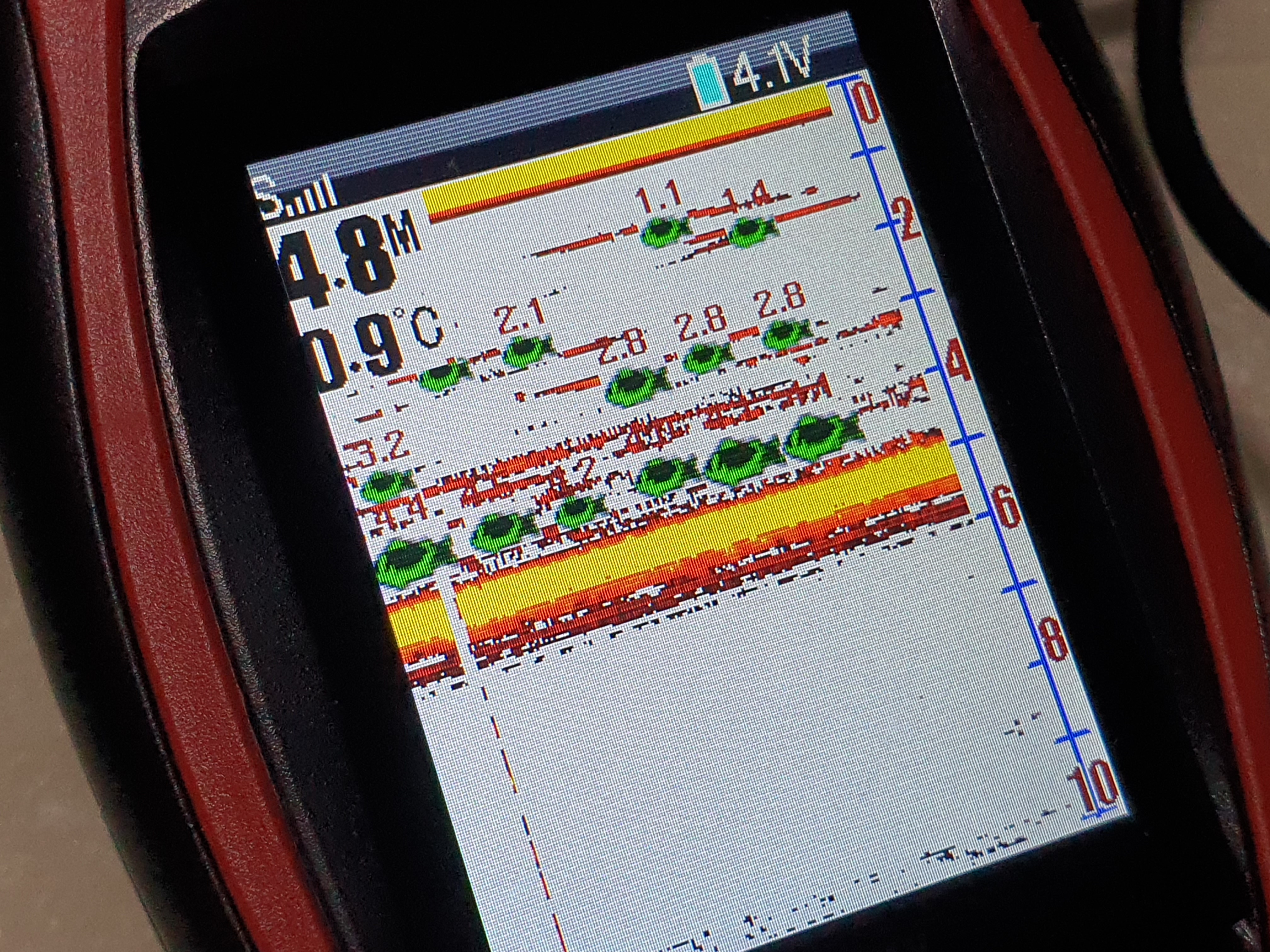 모든 준비를 마치고 어탐기로 찍어보니 상류인데도 수심이 5m정도로 꽤 나오더군요. 어군도 엄청납니다.