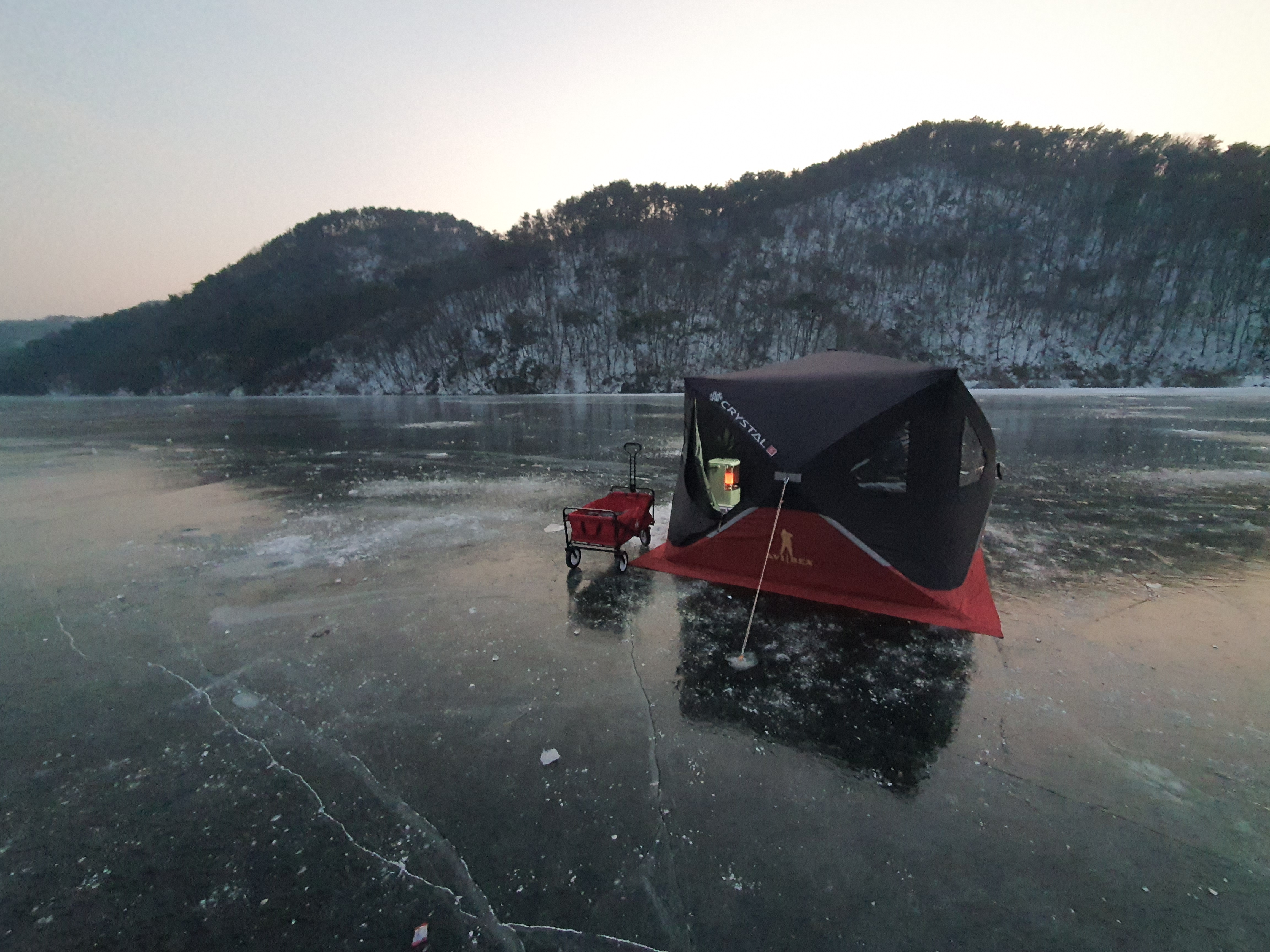 오후 느즈막히 도착한 반계지 상류에 다행히 텐트 몇 동이 보입니다. 두동은 장박용 텐트로 보이고, 다른 텐트 두동은 빙박을 하려는 듯 보이기도 하고, 그곳에 빙어가 나온다는 철수하시는 분 조언으로 근처에 텐트를 설치합니다.