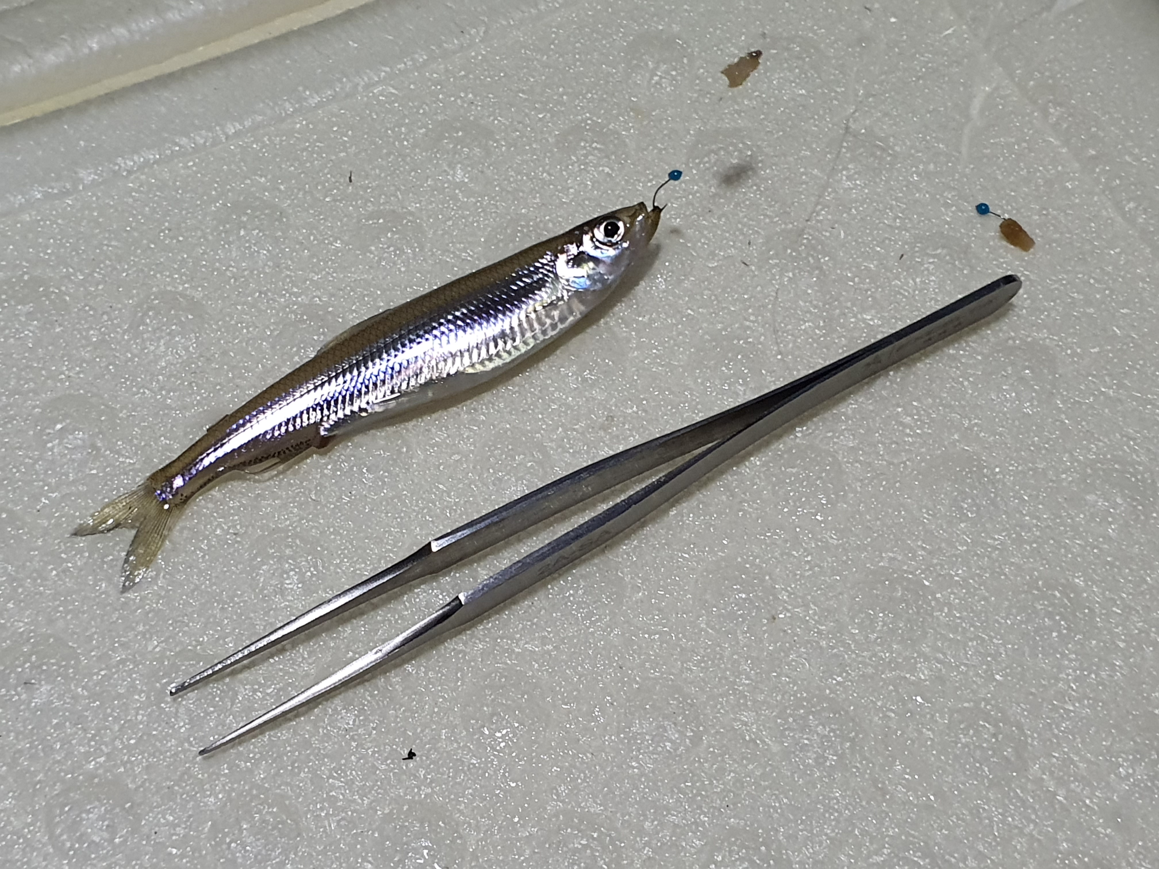밤이 깊어졌는데, 빙어 입질이 줄어들고 간간히 올라오는건 피래미들이네요. 집어등 근처에 고기가 보여서 올렸는데, 빙어는 안 물고 피래미만 달려 들더군요.