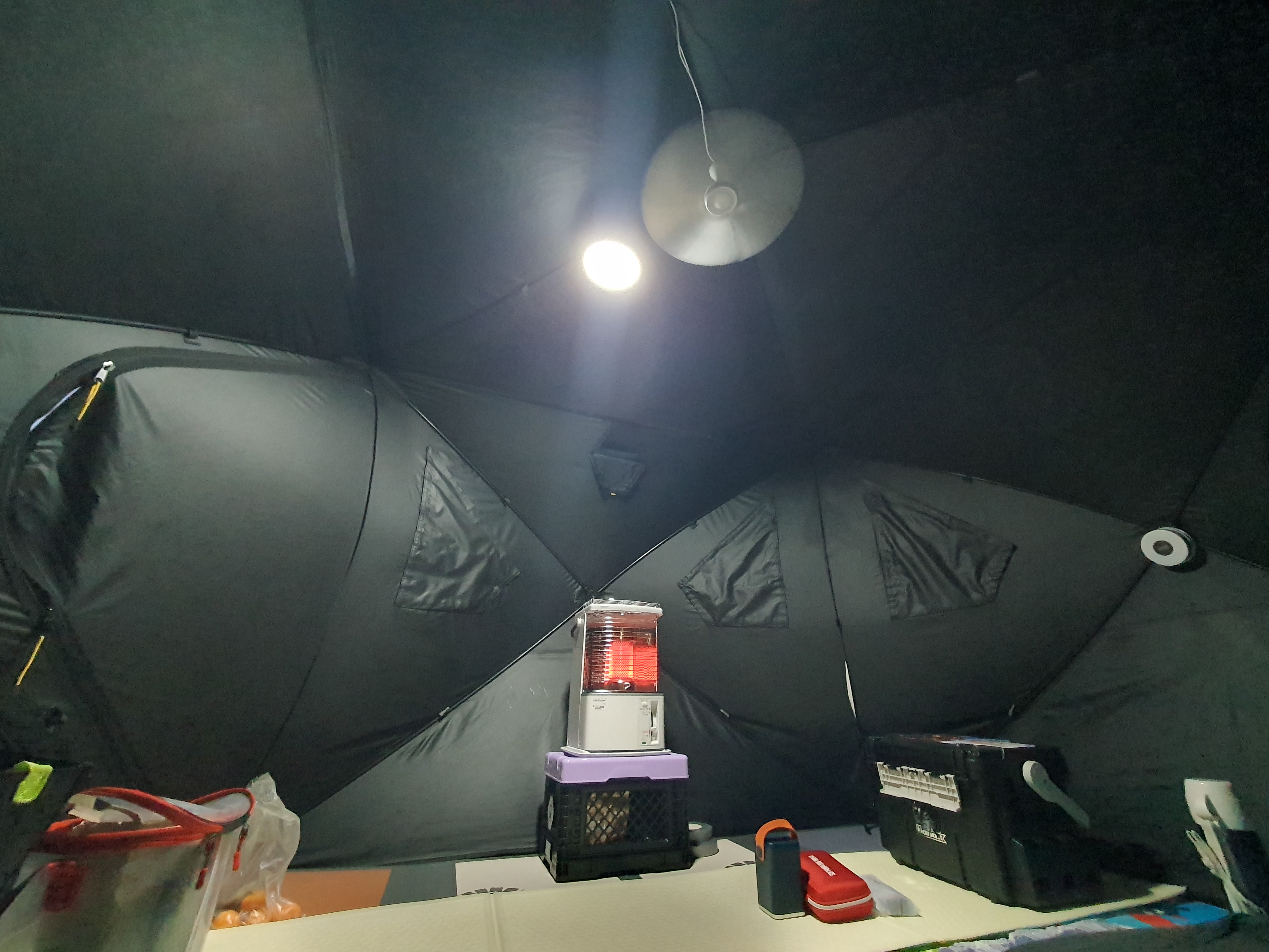 텐트가 크다보니 토요토미 RS-H291 반사식 난로가 충분하지 않는건지 바닥이 부실해서인지 등뒤로는 한기가 느껴집니다. 새벽에 잠깐 눈을 붙였는데, 다리쪽 한기가 크더군요. 다음에는 침낭과 온열 조끼도 함께 해야겠네요.