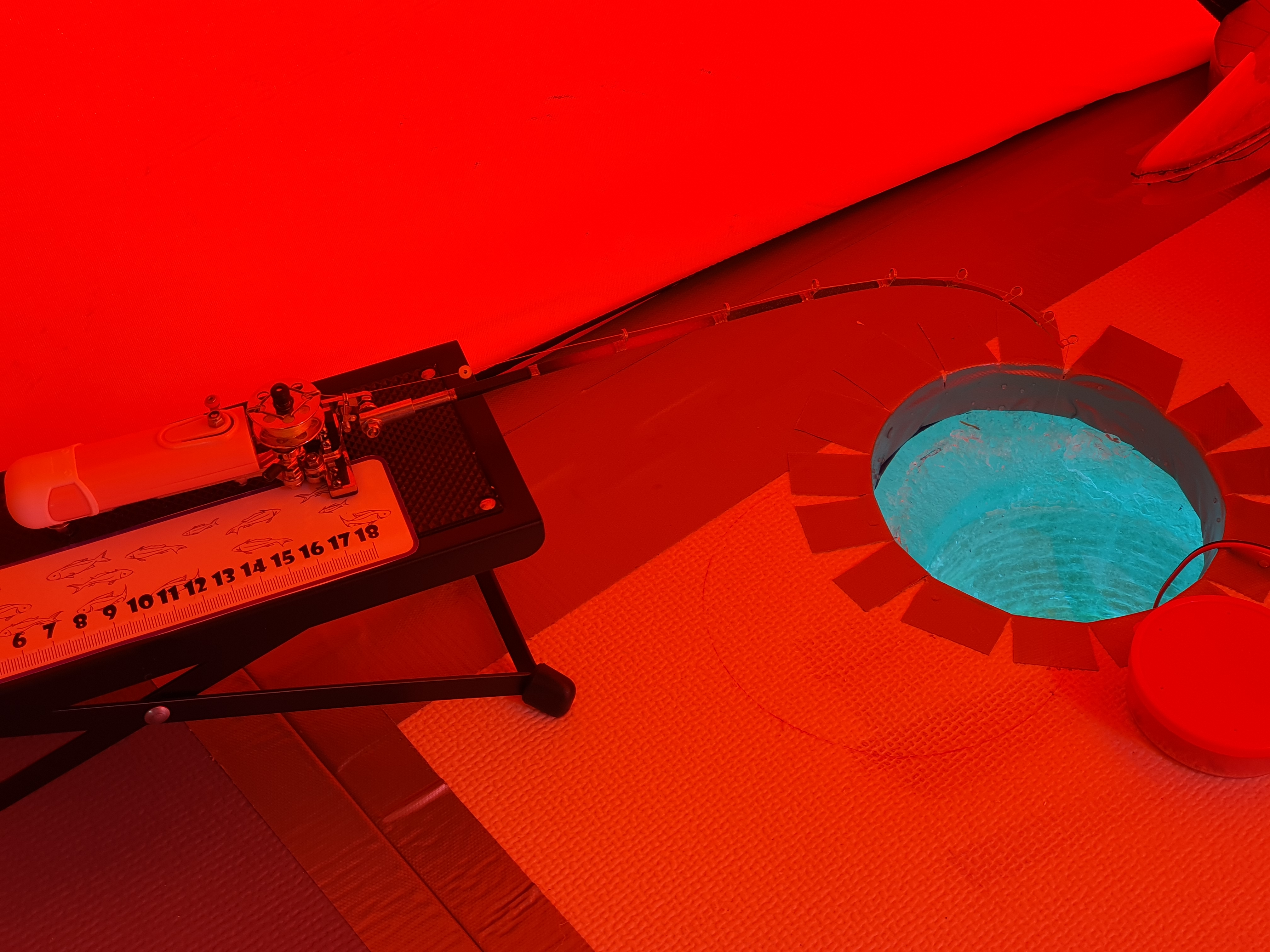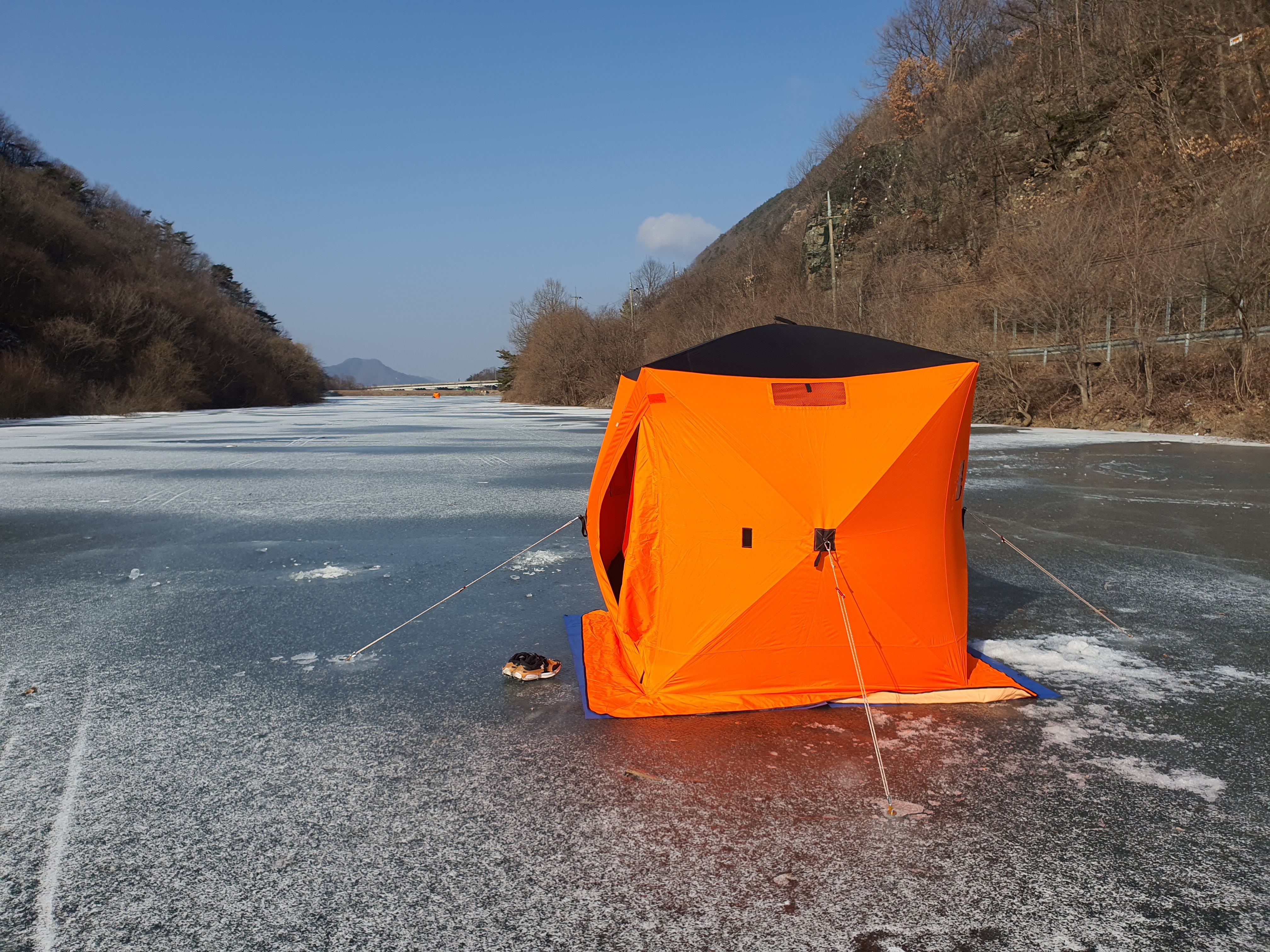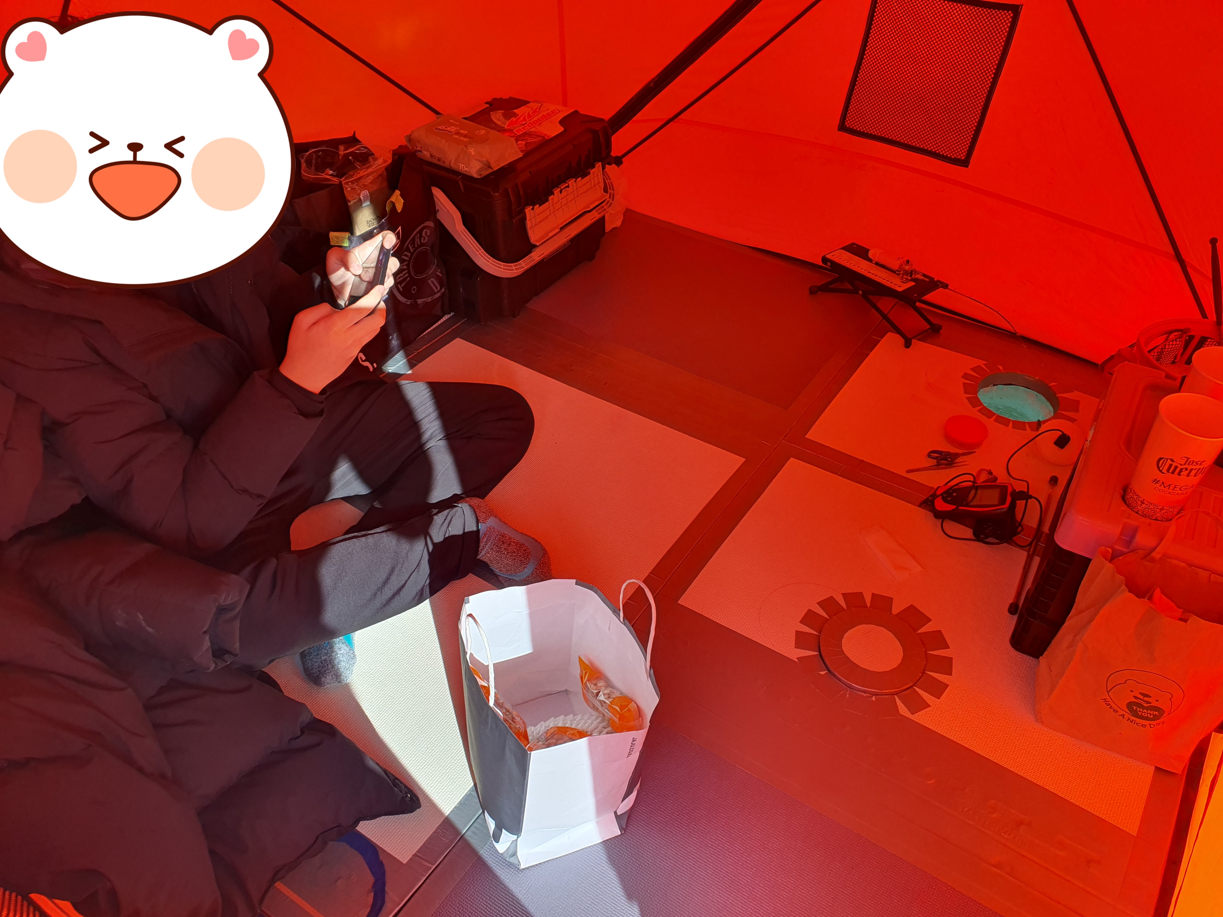 텐트 피칭한 포인트에서는 빙어는 고사하고 물고기가 전혀 보이지 않았지만, 텐트 근처에 어느샌가 오셔서 하시던 분이 빙어를 올리시더군요. 양해를 구하고 구멍을 하나 뚫어 채비를 내리니 바로 입질이 옵니다.