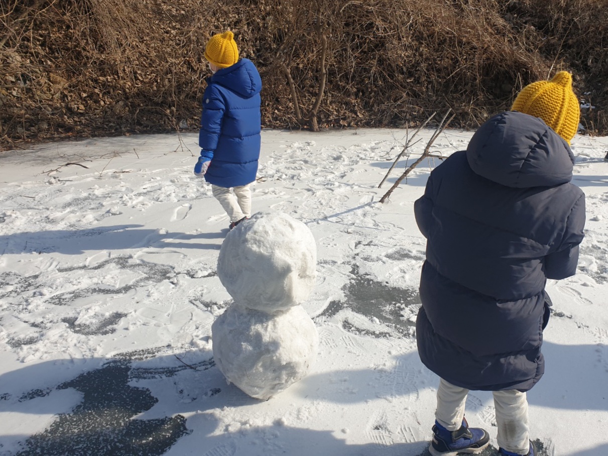 처제네에서 연락이 와서 합류하기로 하였기에 텐트 피칭하고, 정리하는 사이에 도착을 했습니다. 녹지 않고 쌓인 눈을 굴려 눈사람도 만들고
