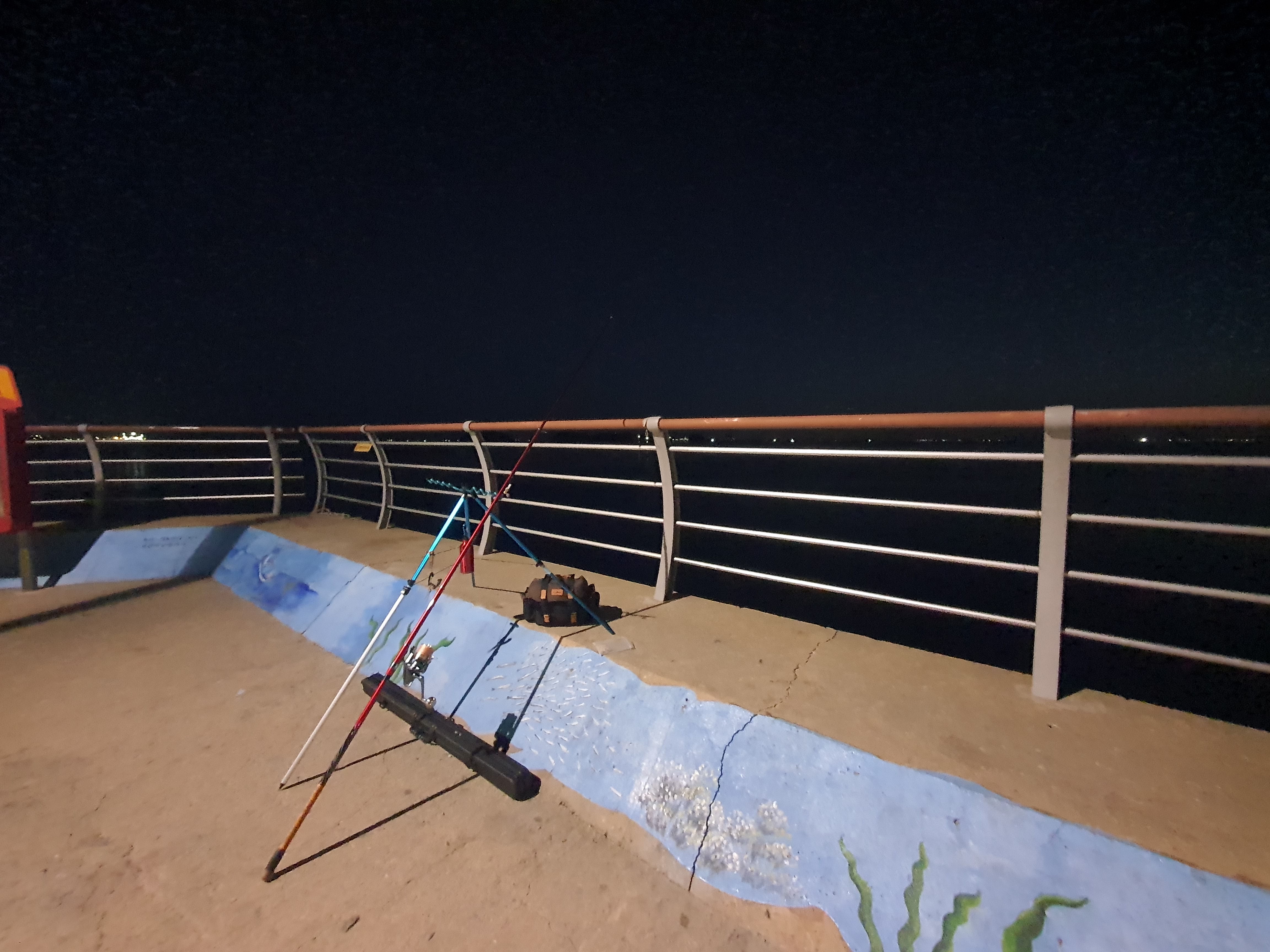 8시30분 만조전인 6시30분경 도착하니 아무도 없어 자리를 잡아 던져봅니다. 자리 잡은 위치는 일출 전이지만 가로등 불빛이 충분해서 랜턴 없이도 준비가 가능하더군요.