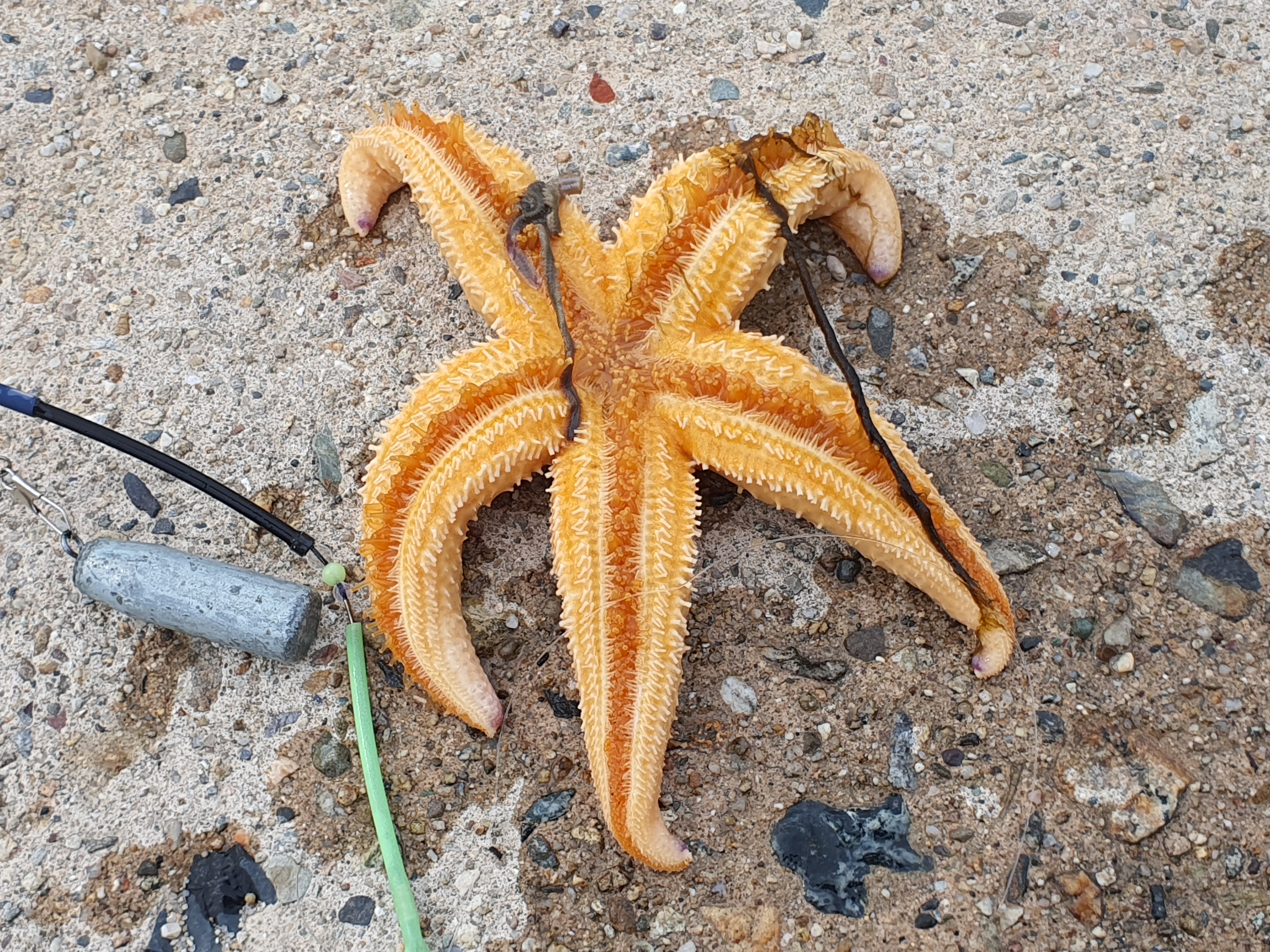 묵직하지만 까불지도 않고 끌려오기에 밧줄이나 통발에 걸렸나 생각했는데 커다란 불가사리가 걸려있네요. 손맛은 징하게 볼 수 있었네요.