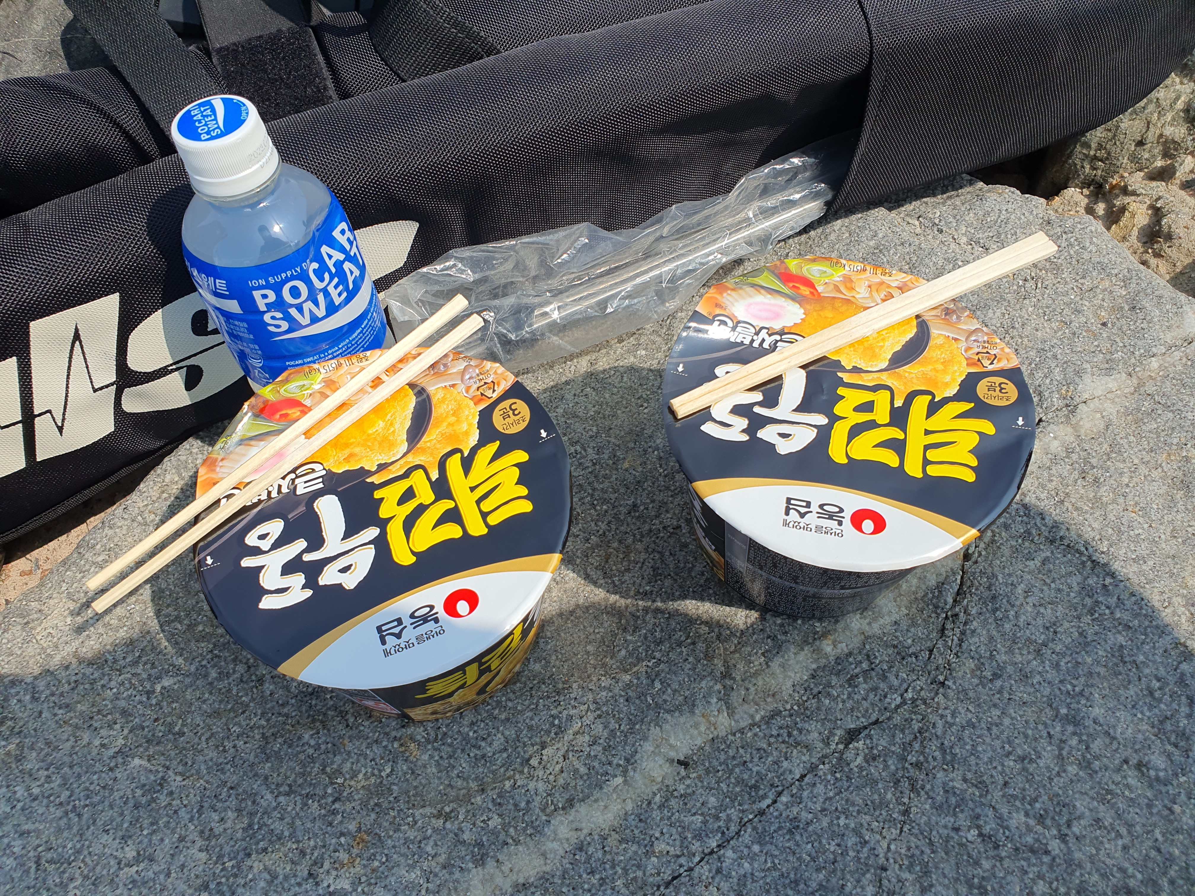 입질은 없지만, 체셈도리가 챙겨온 튀김우동으로 점심식사를 합니다.