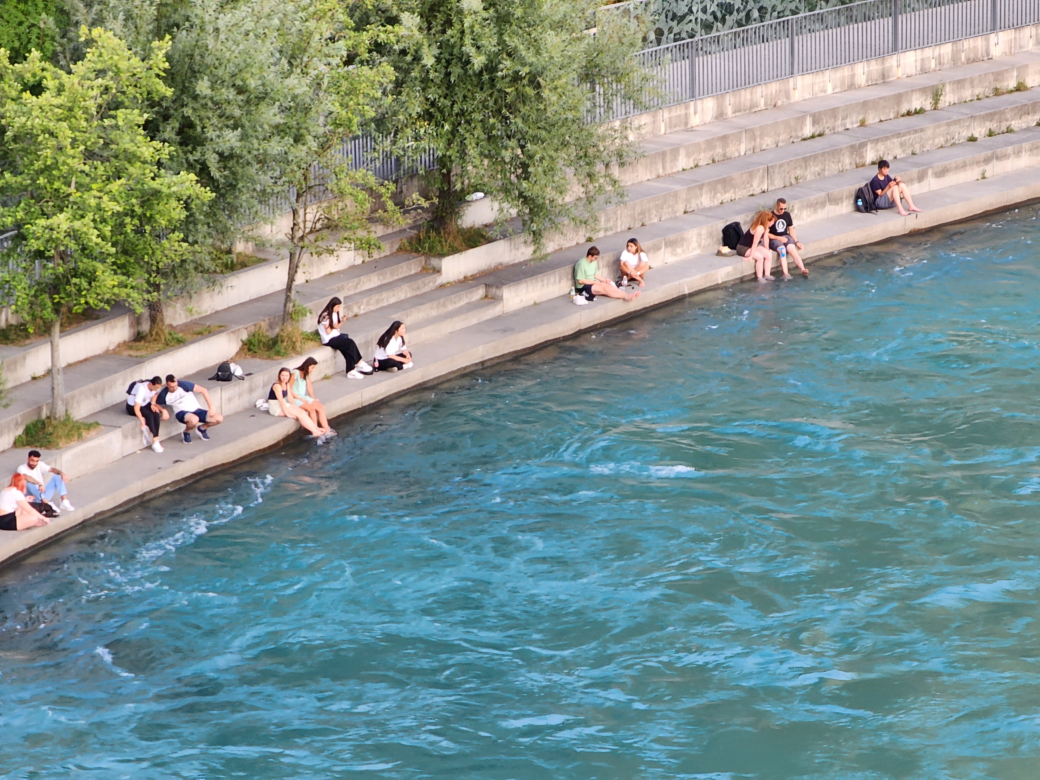 아레강에 발을 담그며 쉬고 있는 사람들이 평화로워 보이네요.