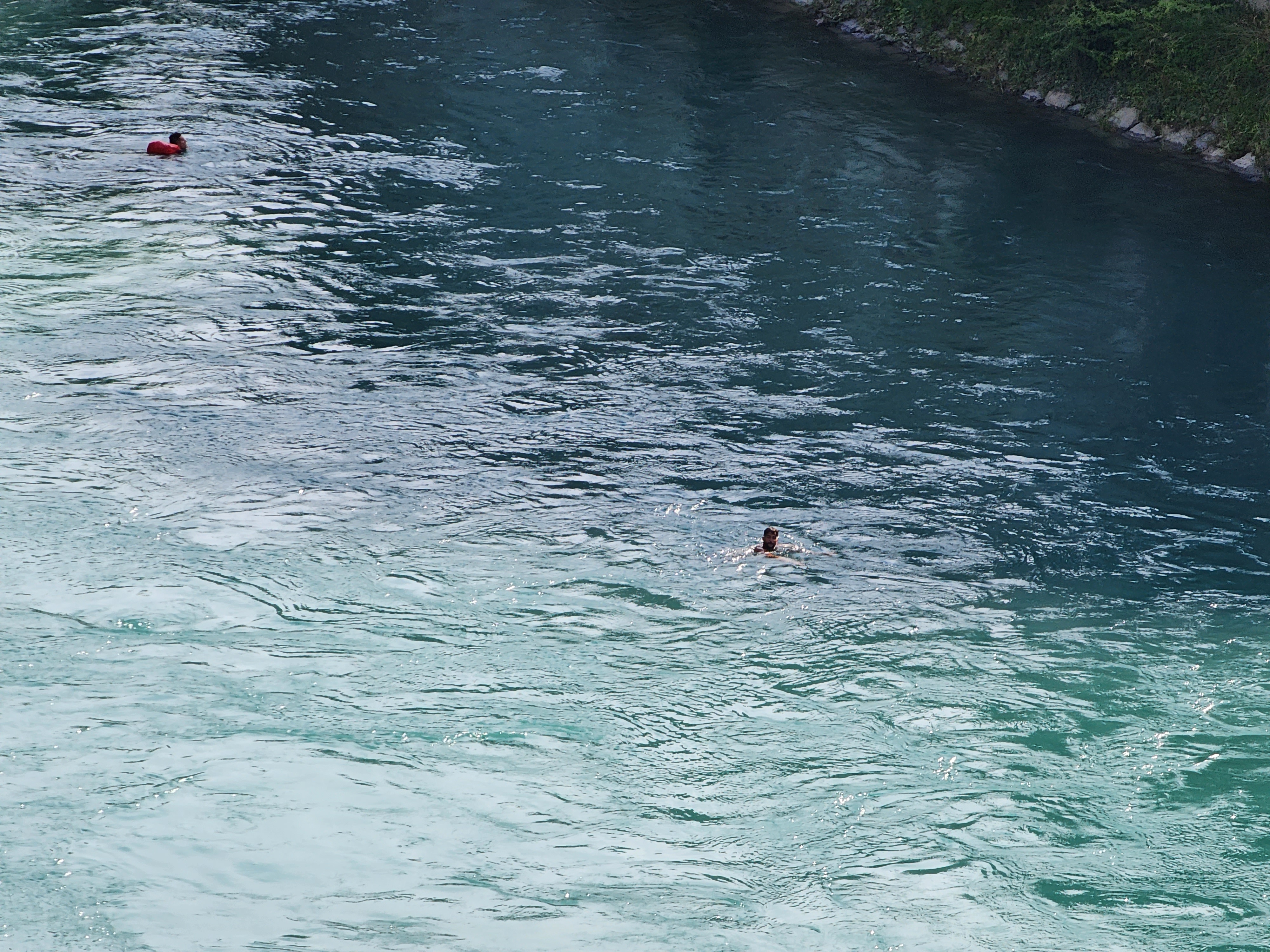 에메랄드 빛 아레강이 깨끗한지 수영을 하시는 분들이 계시더라구요. 물살이 꽤 있어 헤엄을 치는 것인지 떠 내려가는건지 다리 건너편까지 가시더군요.