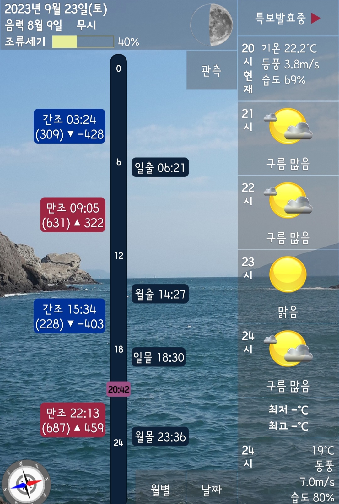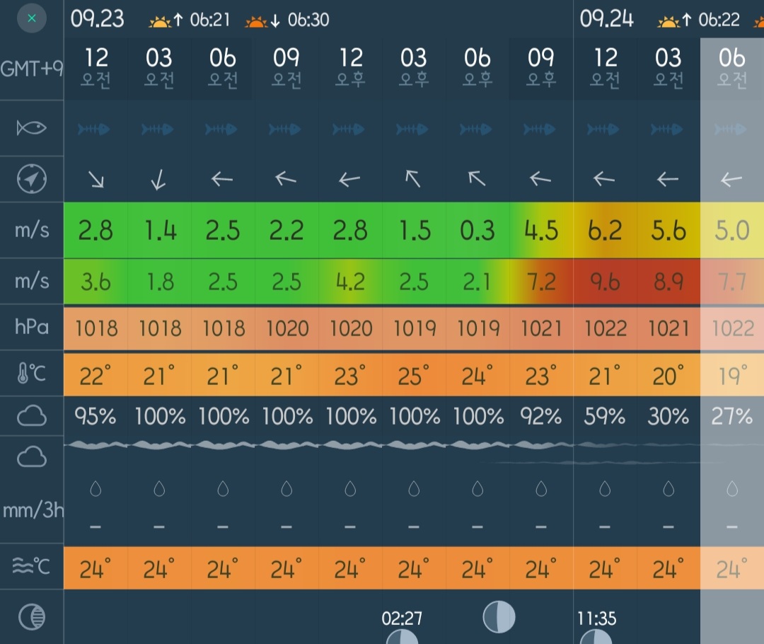 물때가 무시 물때라 좀 애매하기는 했지만, 일단 무시하고 출발했는데, 정작 바람을 확인하지 않고 출조지에서 확인한 바람을 확인하니 저녁에 바람이 터지더군요.