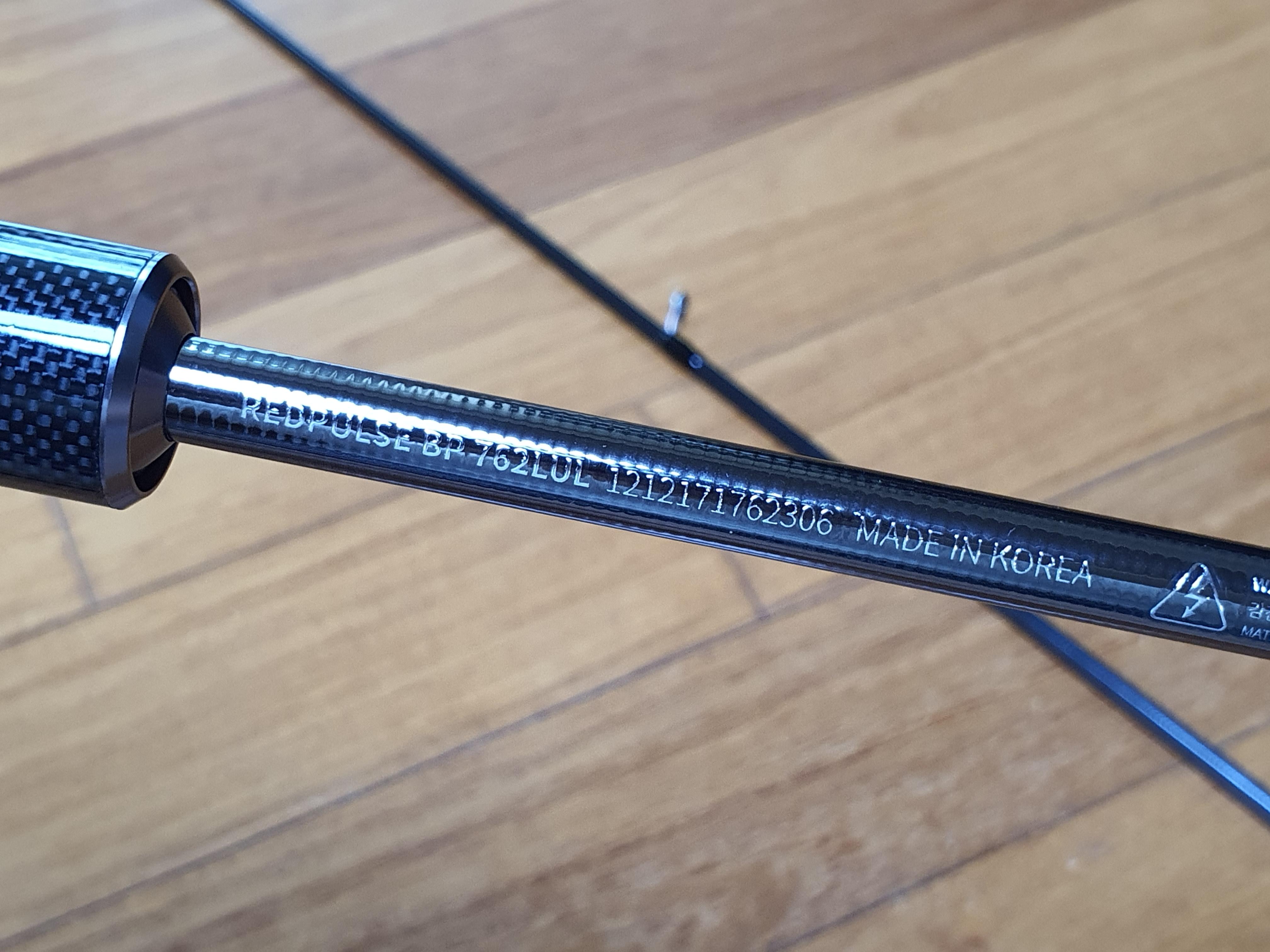 블랭크는 카본 블랙 유광에 로드의 모델명과 레드펄스 로고를 볼 수 있습니다.