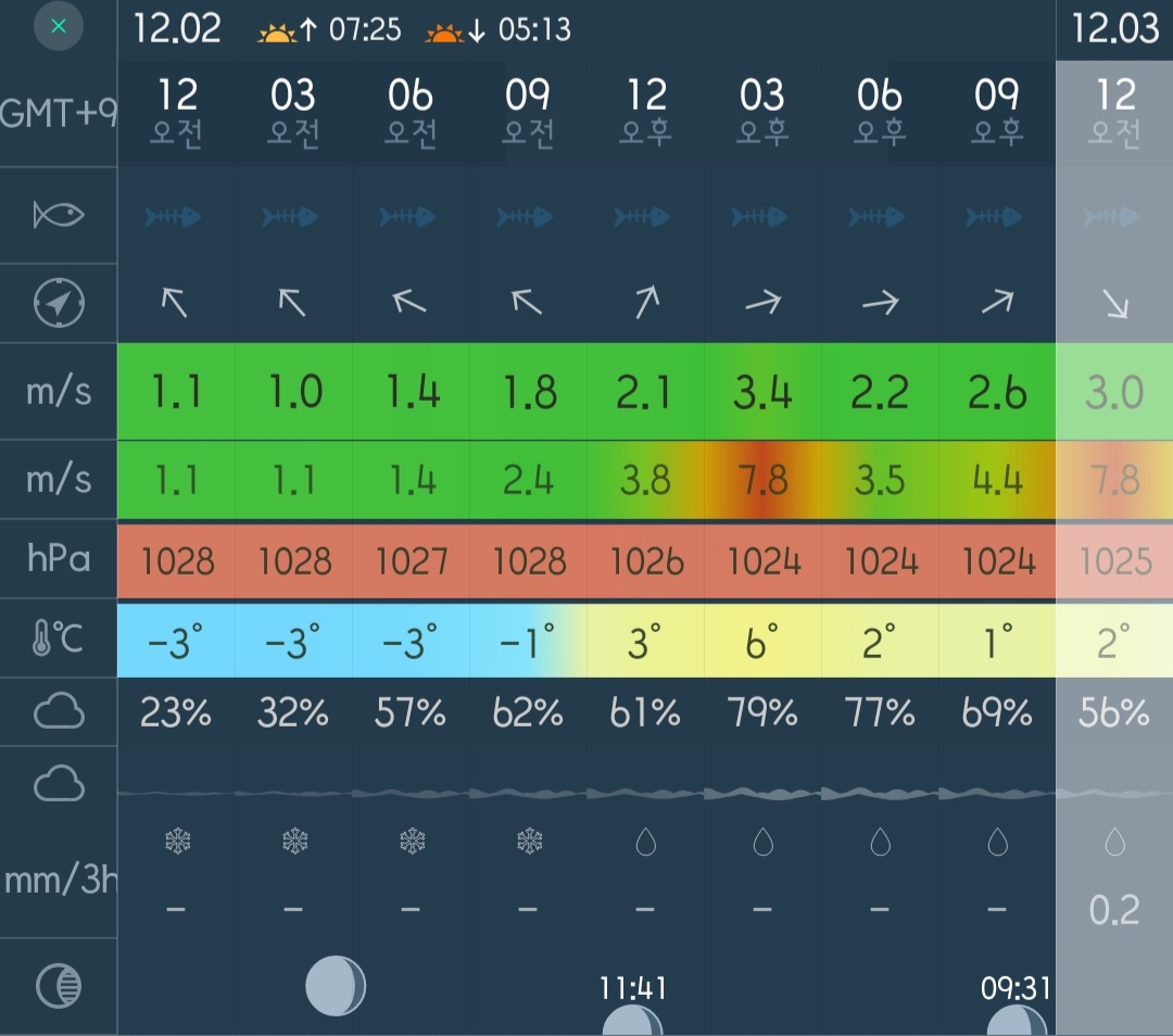 □ 날씨 : 바람 3단 이하, 영상 5도 이하, 흐리고 가끔 비