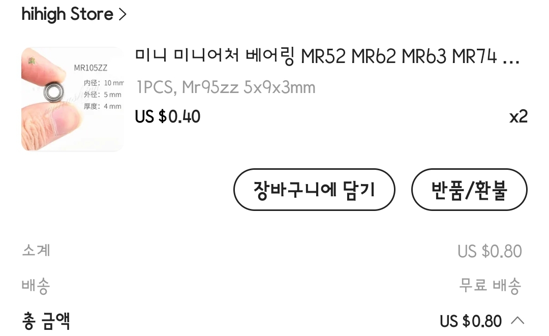 호환되는 베이링은 MR95ZZ로 5×9×3mm 규격입니다. 국내 쇼핑몰에서도 구매가 가능하지만, 단가와 배송비가 있어서 2개만 필요해도 몇천원이 넘어가더군요.