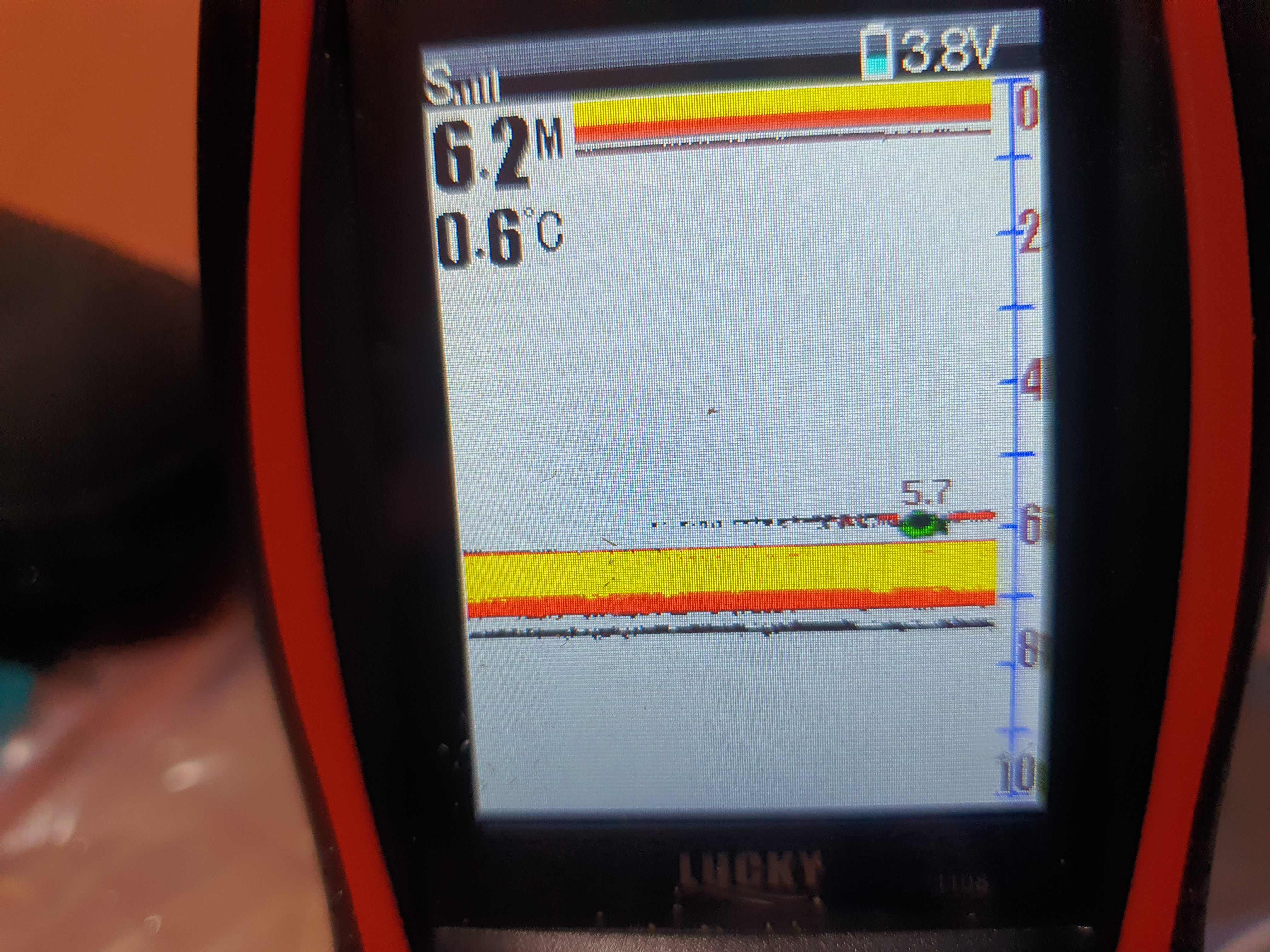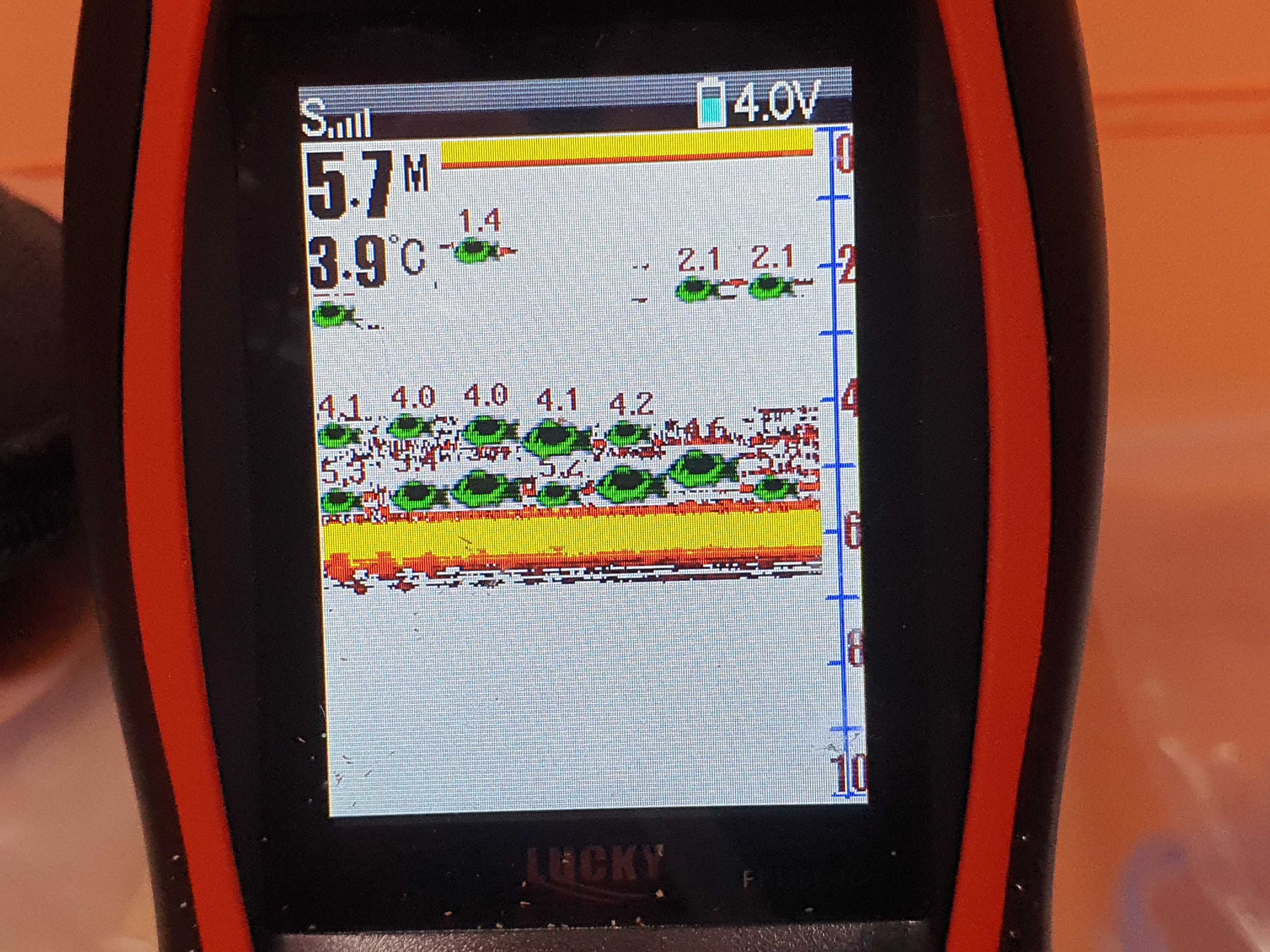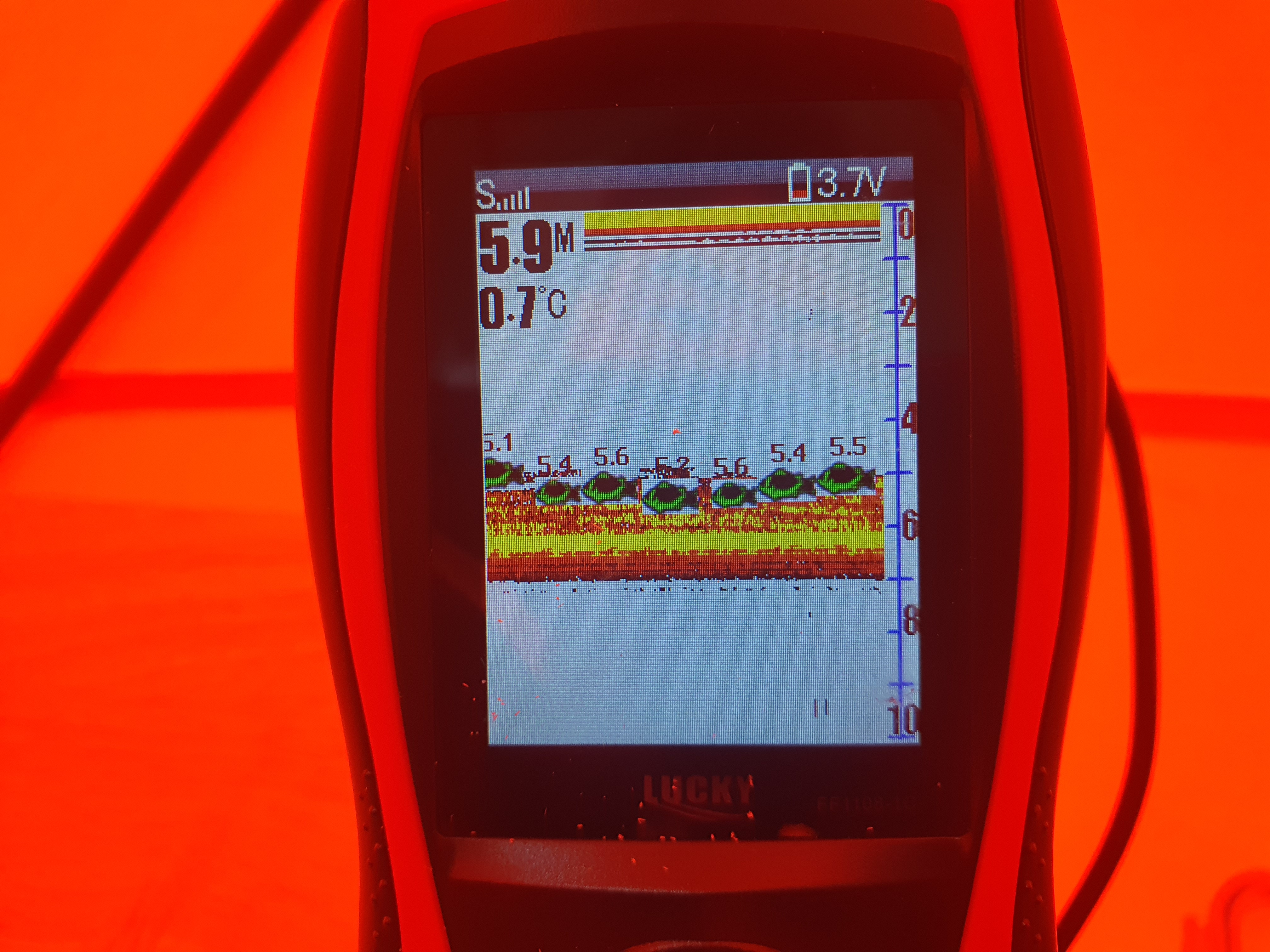 온열조끼와 온열매트로 따뜻하게 잠을 자고 5시경에 일어나 피딩타임을 노려봅니다. 바닥권에서 많은 어군이 보였고, 바닥에서 1m정도 띄우니 어제와는 달리 활발하게 입질이 오더군요.