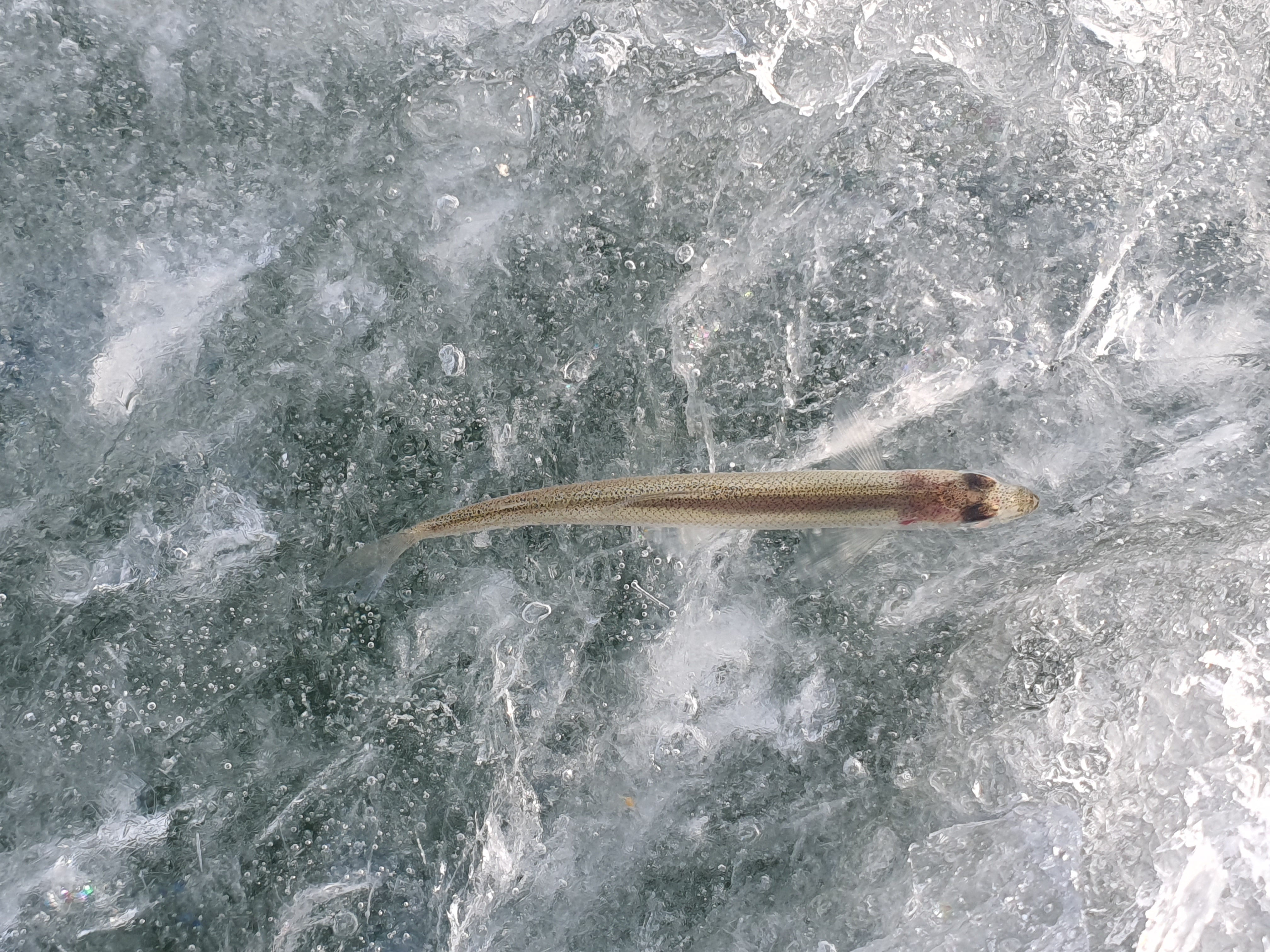 바닥권에서 입질이 바로 오더군요. 지난번 손을 봤던 동파님전동릴이 이상하게 제대로 작동을 하지 않더군요. 비정상적으로 작동하던 전동릴로 몇 차례 빙어가 빠지다 귀운지 첫 빙어를 올려봅니다.