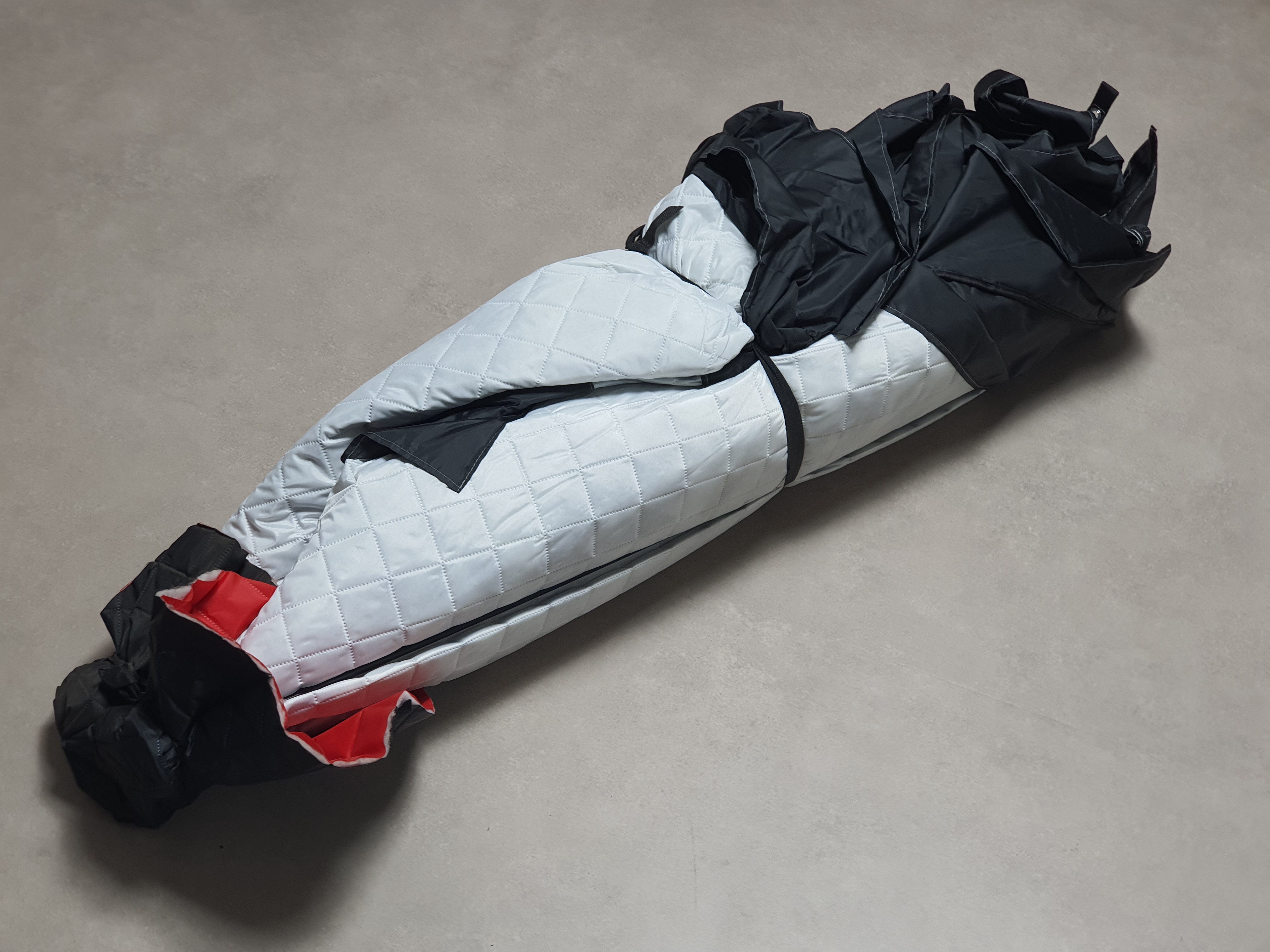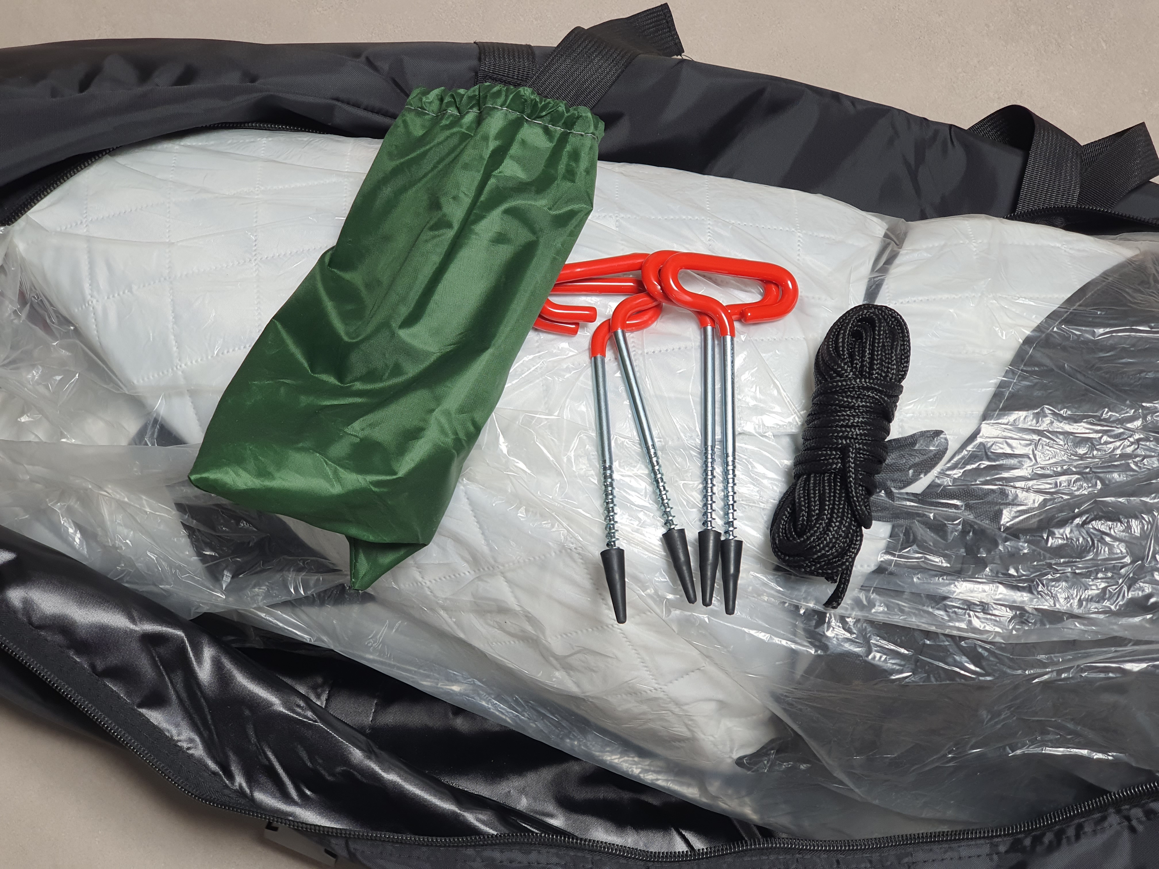 택배 박스에서 누빔텐트를 꺼내니 묵직한 무게의 검정색 텐트 가방에 누빔텐트와 텐트 피칭을 위한 로프와 얼음팩이 구성품으로 들어있네요.