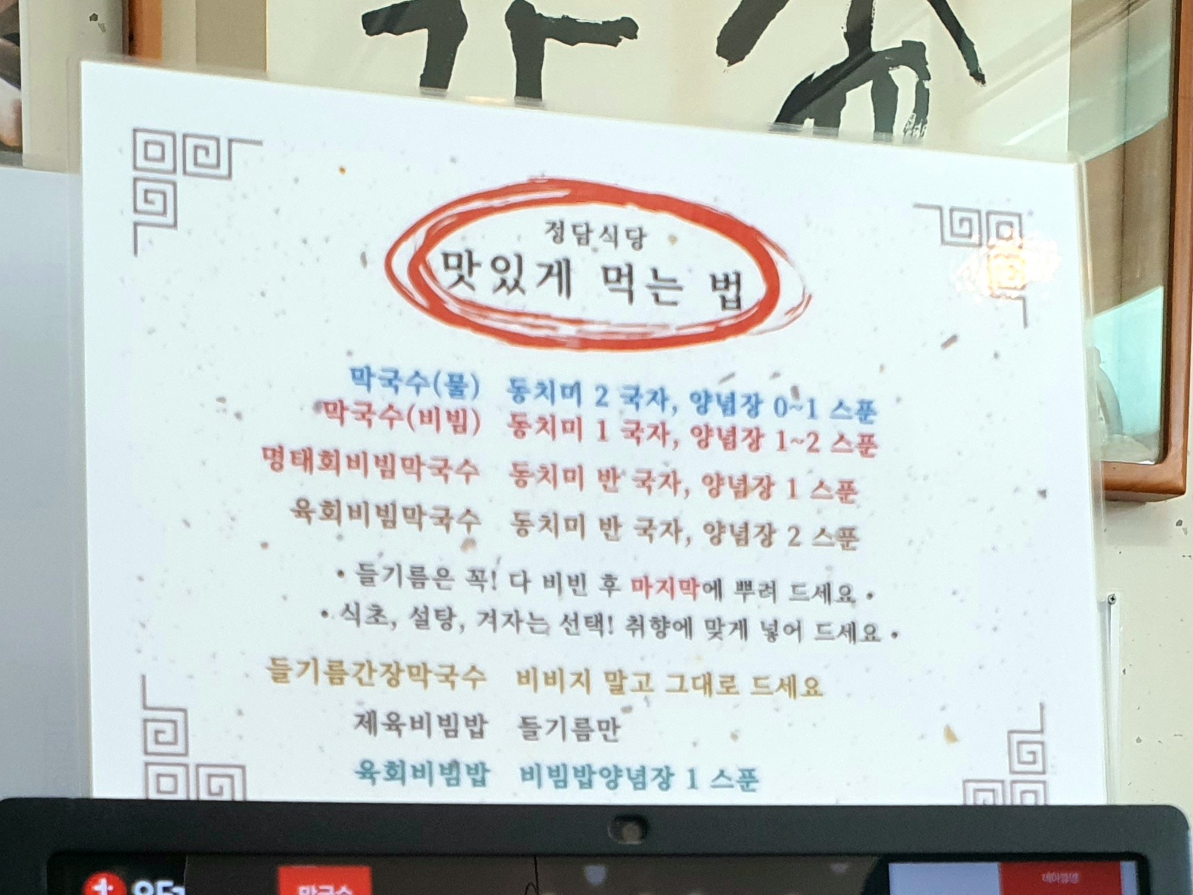 T오더 기기 위쪽에는 막국수와 비빔밥을 맛있게 먹는 방법이 적혀 있습니다. 막국수는 기본적으로 동치미와 양념장으로 맛을 더해서 맛나게 먹을 수 있더군요.