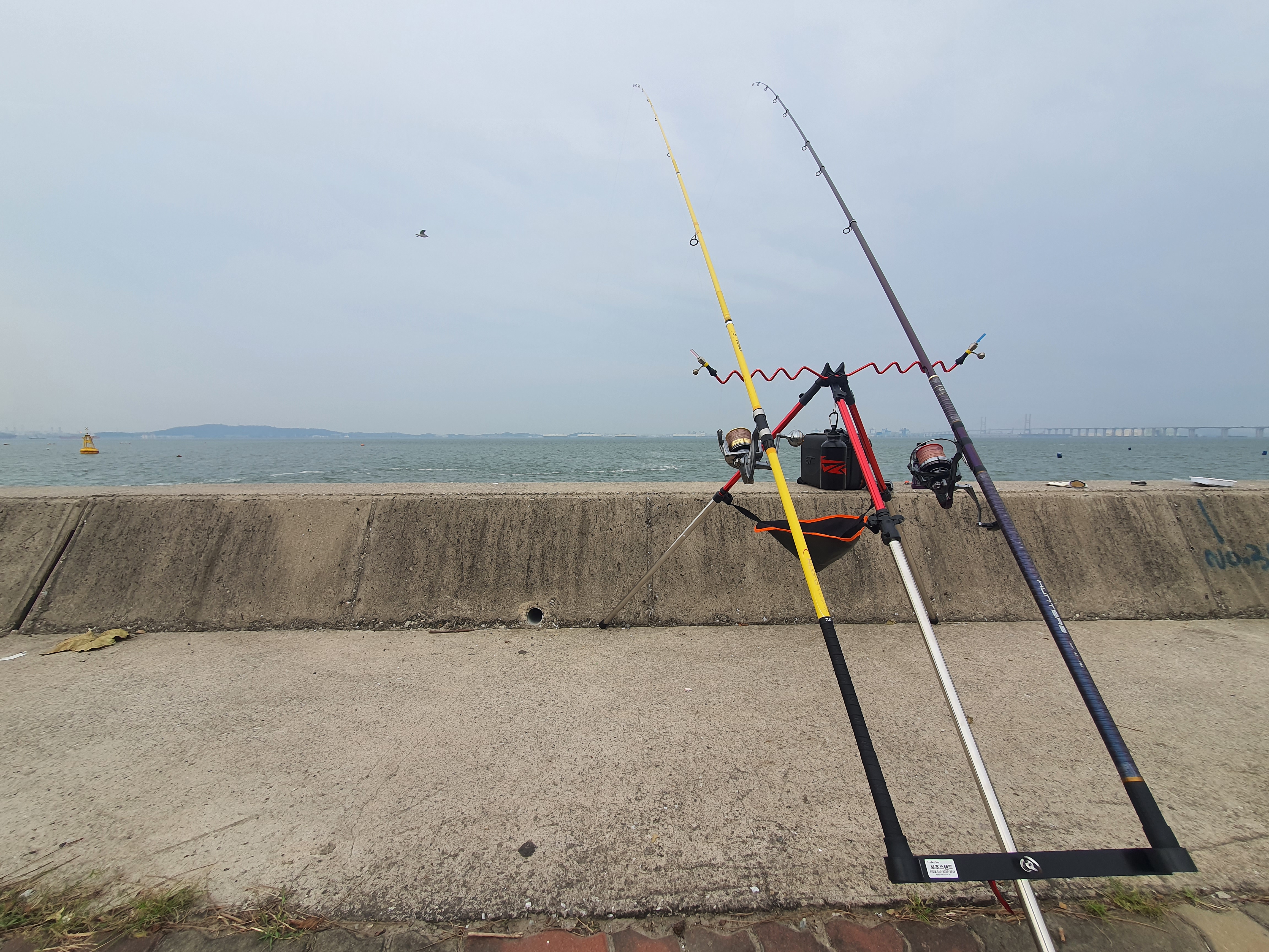 물살이 조금 약해져 헌터 27H-485 하이브리드도 준비해 쌍포를 운영합니다. 새로 영입하여 2회 출조한 다이와 750과 인오토 스탠드 조합으로 전체컷도 찍어 봅니다.
