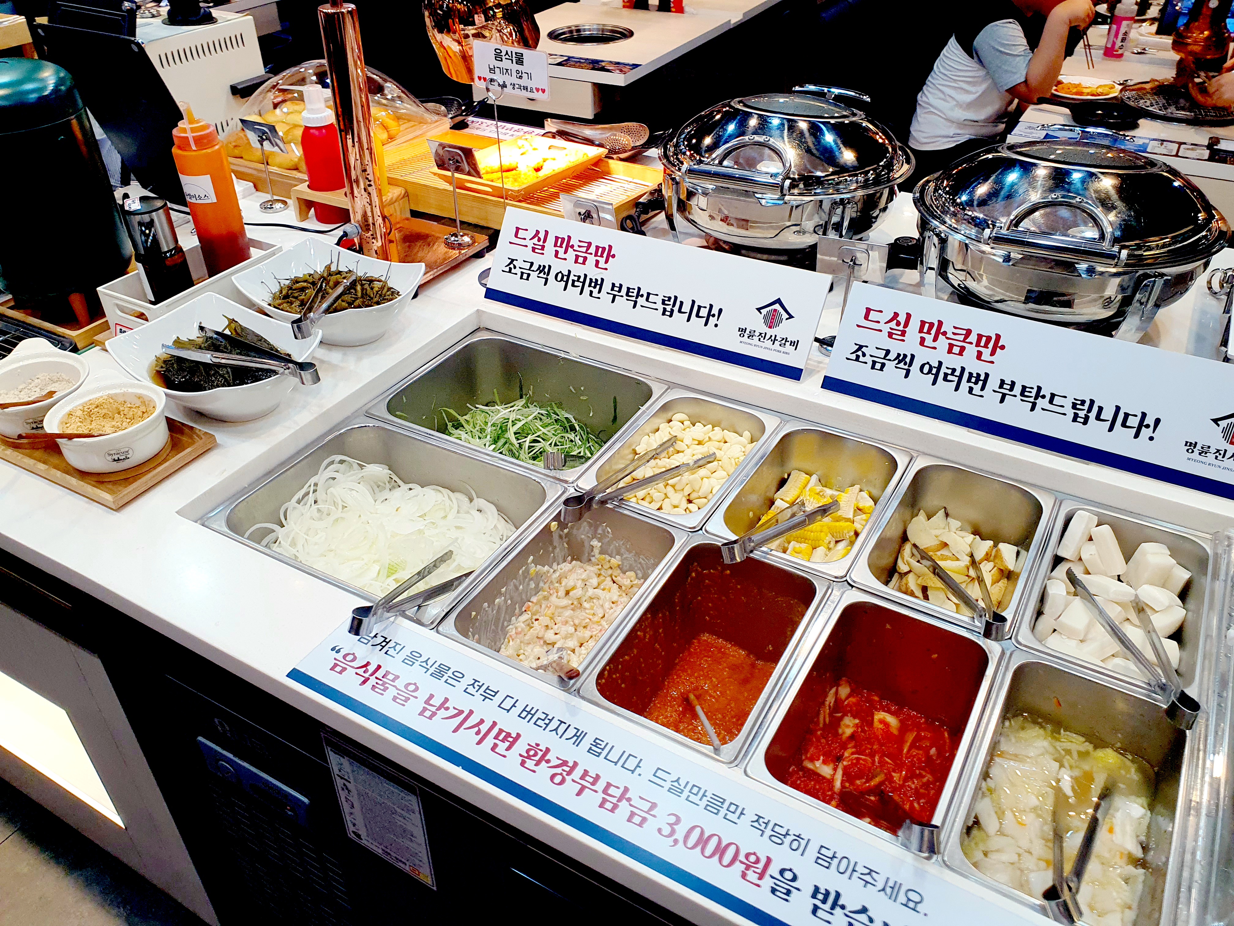 중앙에 위치한 각종 반찬, 소스, 야채뿐만 아니라 밥, 떡볶이, 잡채등의 음식도 무제한으로 즐길 수 있습니다.