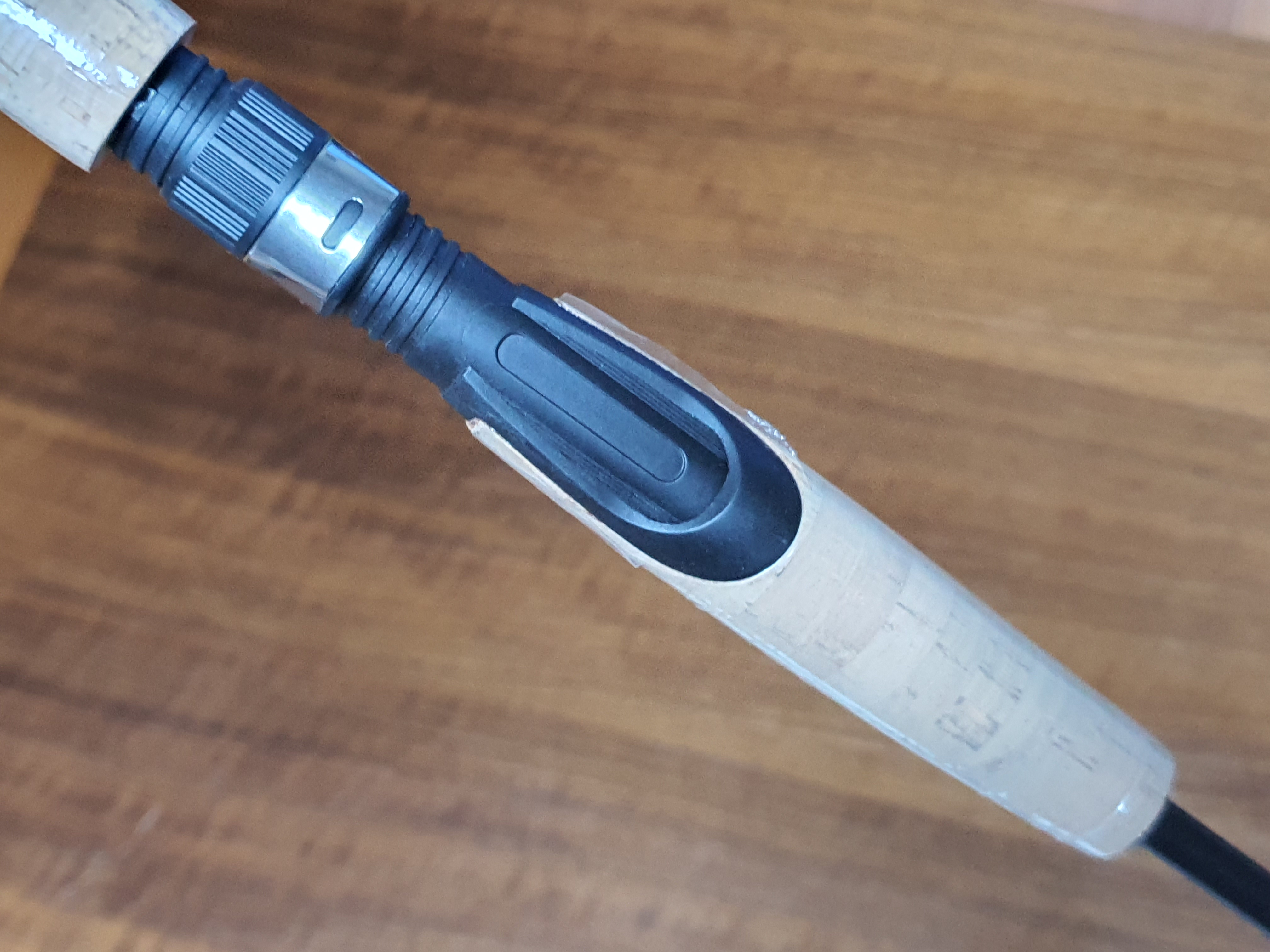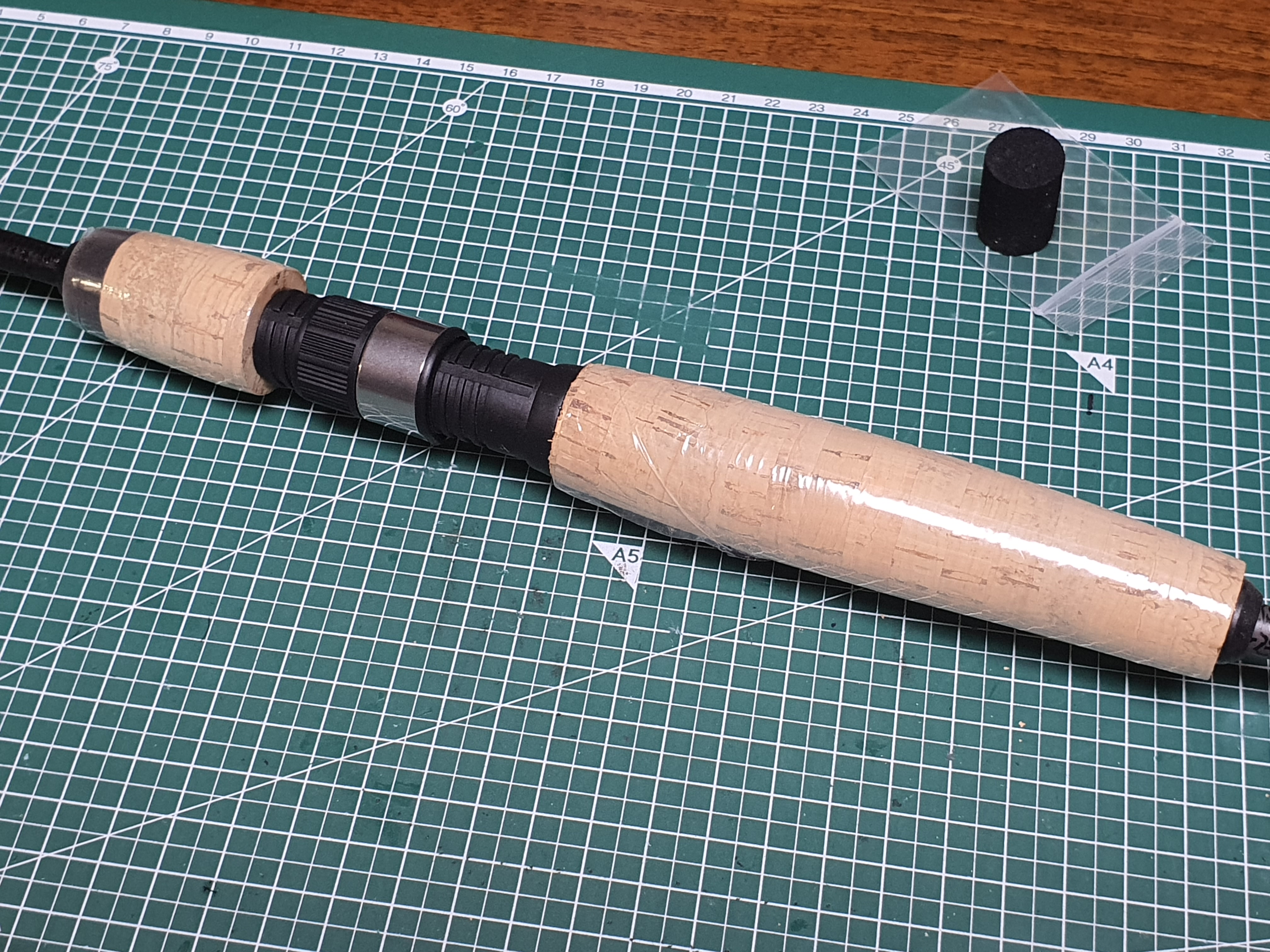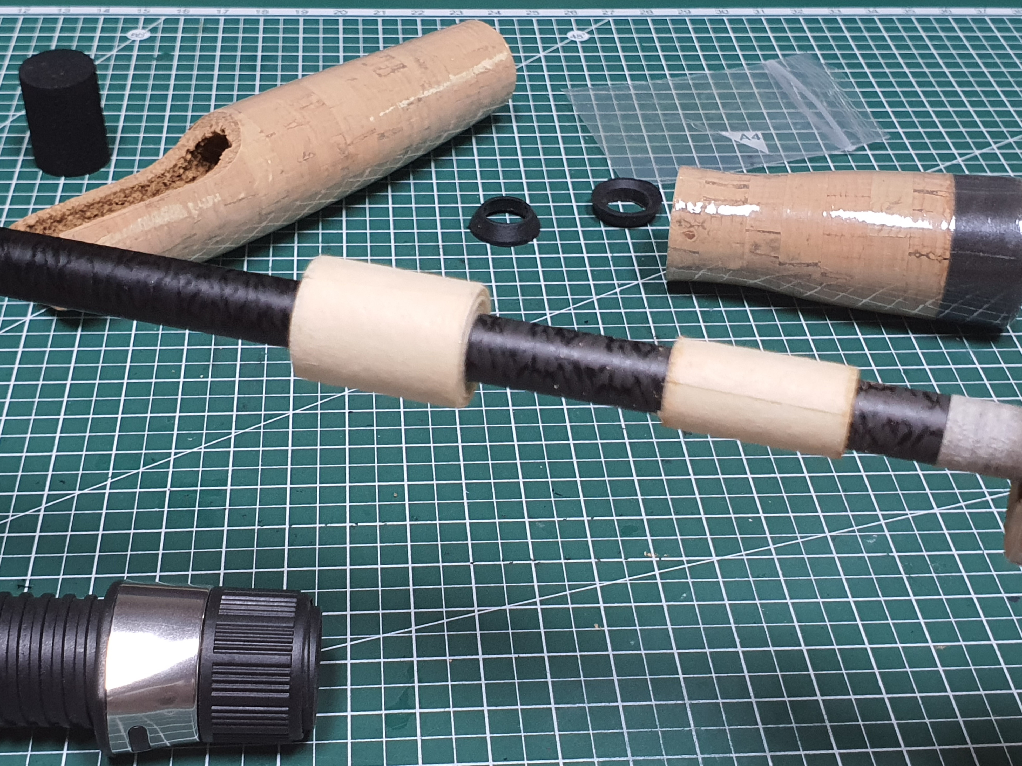 에폭시 접착제 작업할 때 에폭시를 감았던 마스킹테이프에 바르고, 그립과 릴시트를 밀어넣은 방식이기 때문에 마스킹테이프를 그립과 릴시트 내경만큼 감으면 에폭시가 밀려나는 불상사가 생기니 약간의 유격을 두고 감도록 하세요. 필자는 대략 1mm정도 유격을 두었습니다.