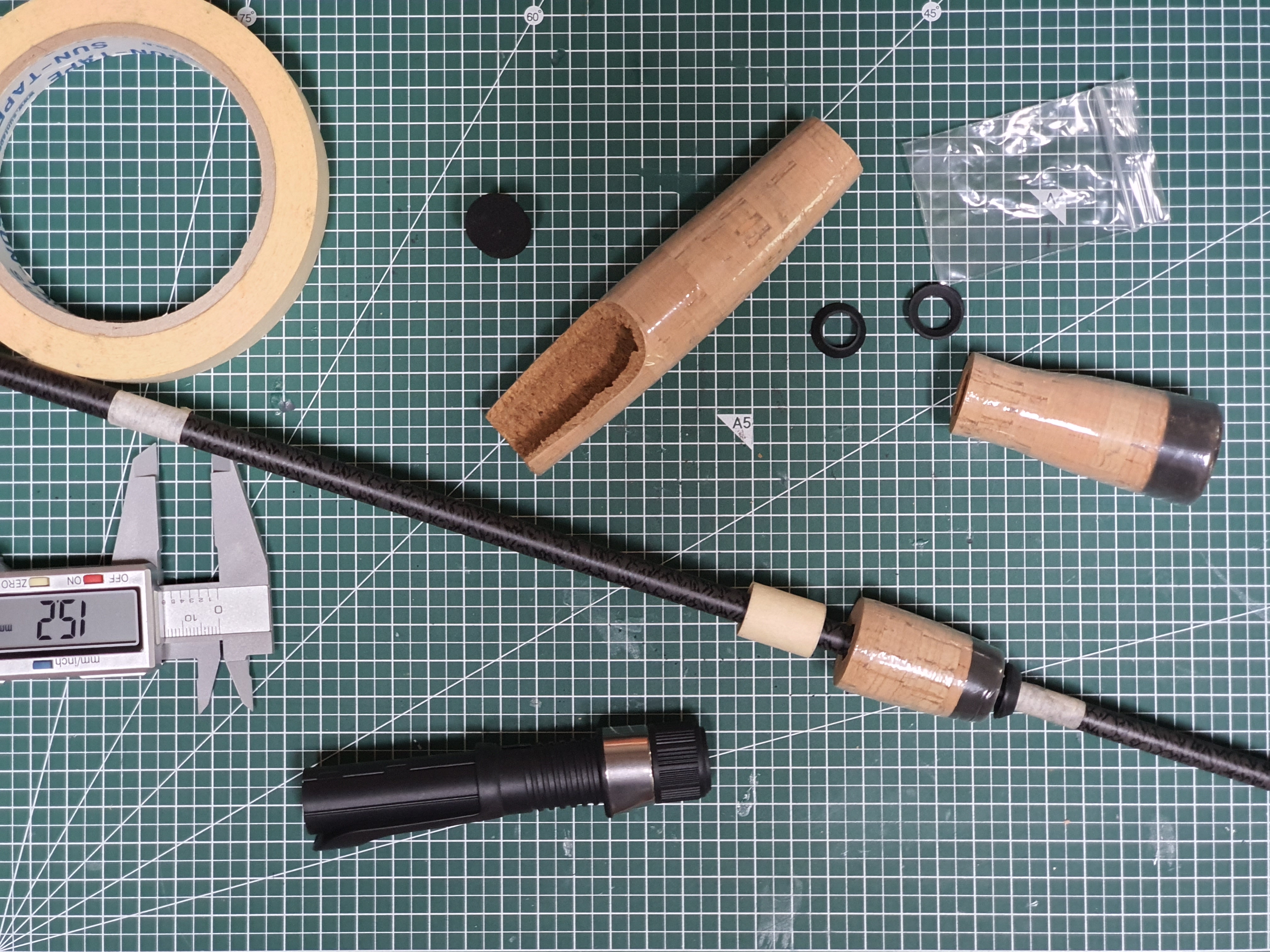 그리고, 블랭크 외경보다 훨씬 큰 릴시트와 그립의 내경이라 최대한 빈공간을 채워주는 역할을 하는 마스킹테이프도 준비하고, 치수를 측정하게 위해 알리에서 구매했던 버니어켈리퍼스도 준비했습니다.