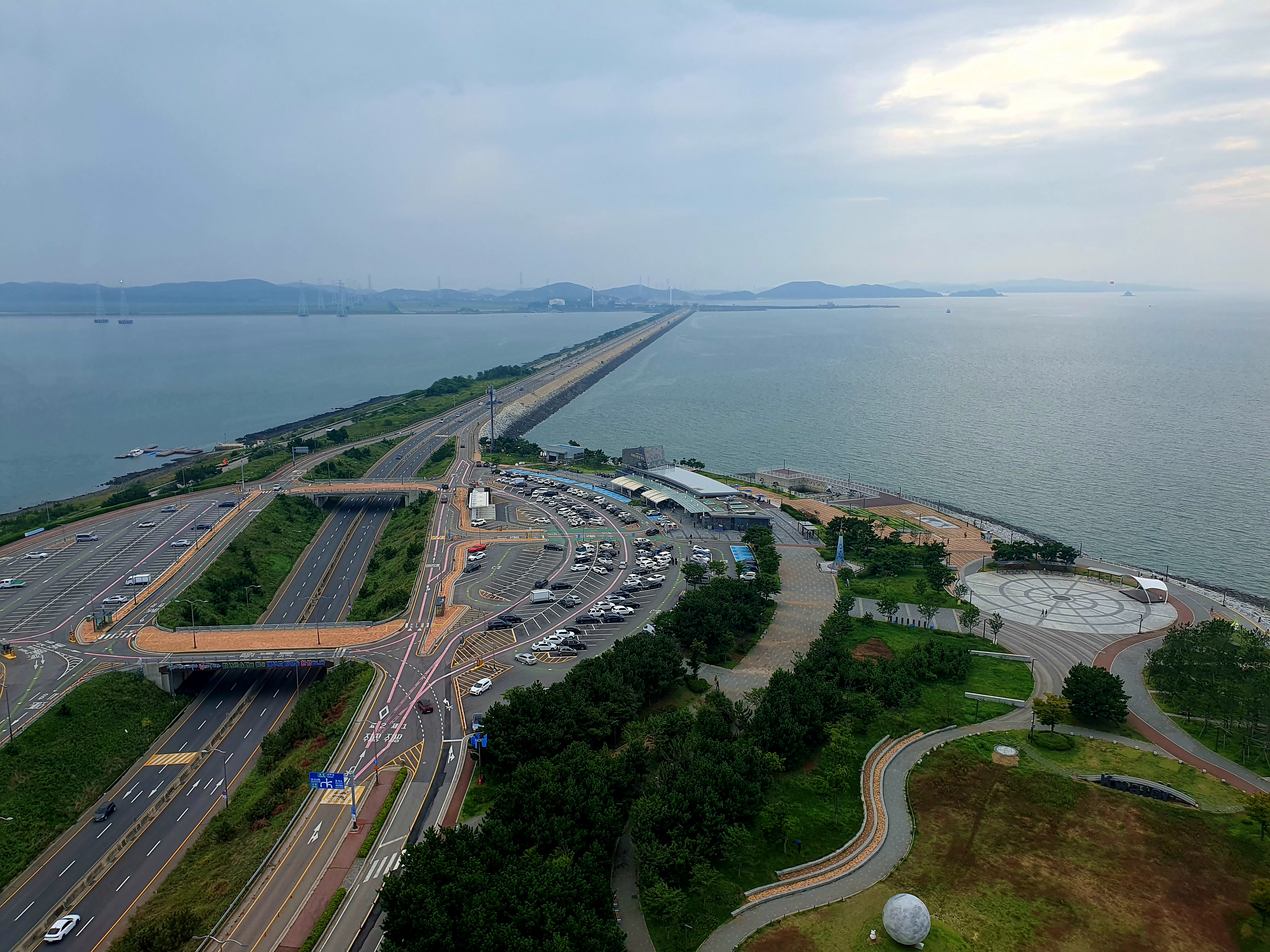 시화이루나타워 달전망대에 올라서 찍은 시화나래휴게소 전경으로 시화나래휴게소를 잠시 알아보면 안산 시화공단과 대부도를 잇는 시화방조제에 있는 휴게소인데요.