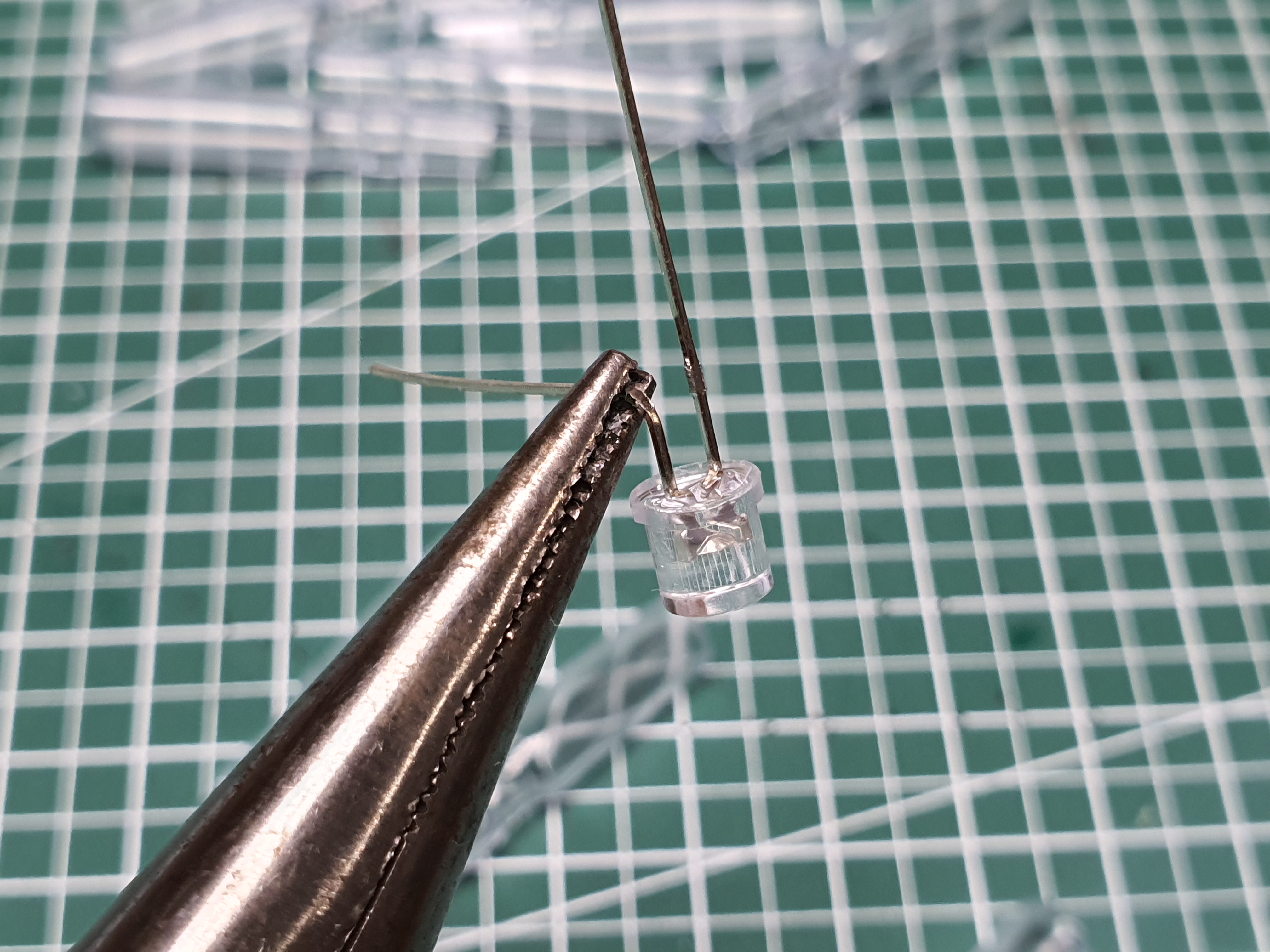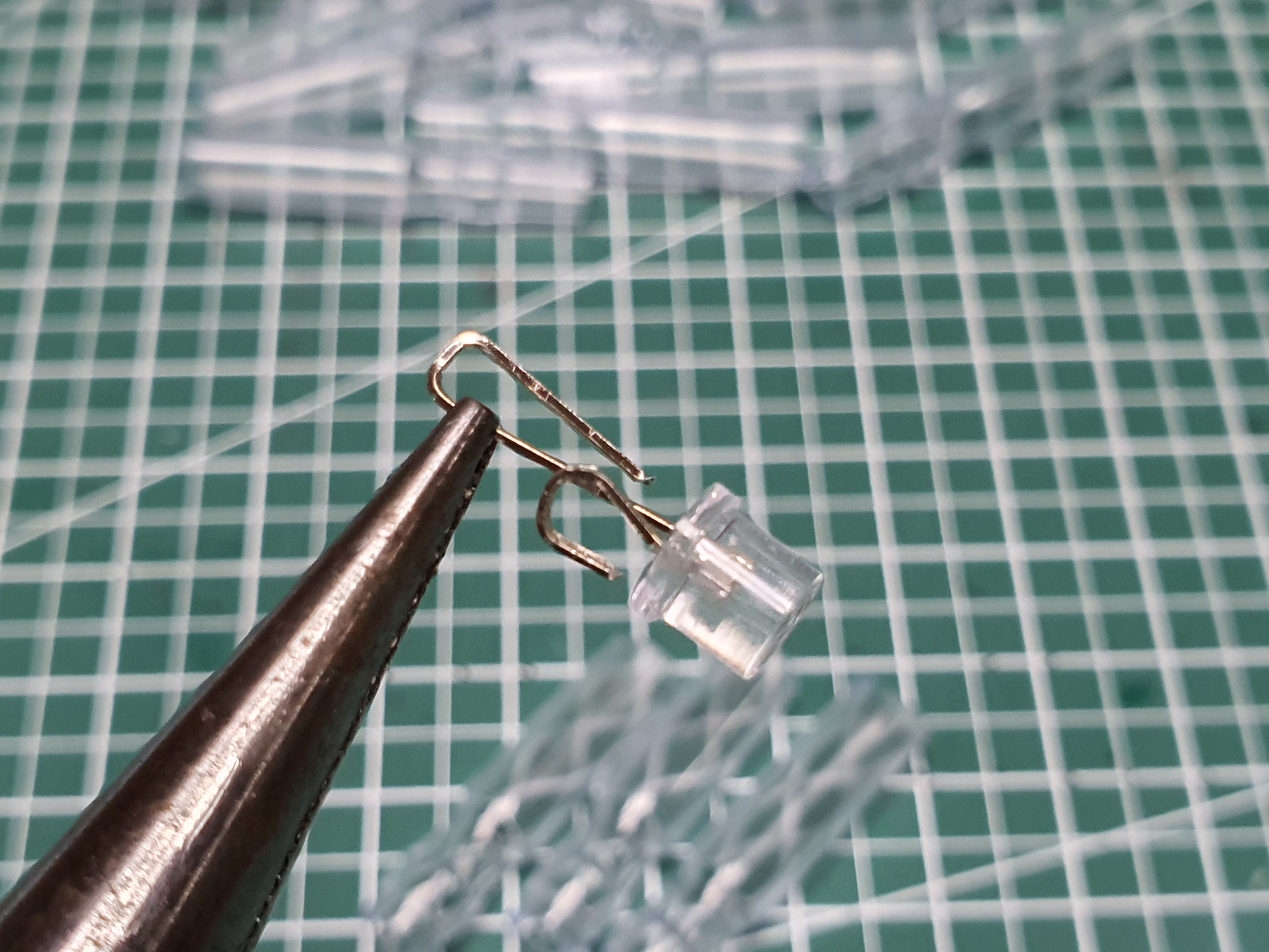 LED 다리 중 긴것은 +, 짧은 것은 - 로 알고 있는데, CR435 배터리에서 몸통은 +, 바늘처럼 나온 것이 - 이라고 생각하시면 됩니다. 먼저 짧은 다리를 약 0.5cm높이 정도로 만들기 위해 꺽어줍니다. 물론 남는 다리는 잘라내면 됩니다.