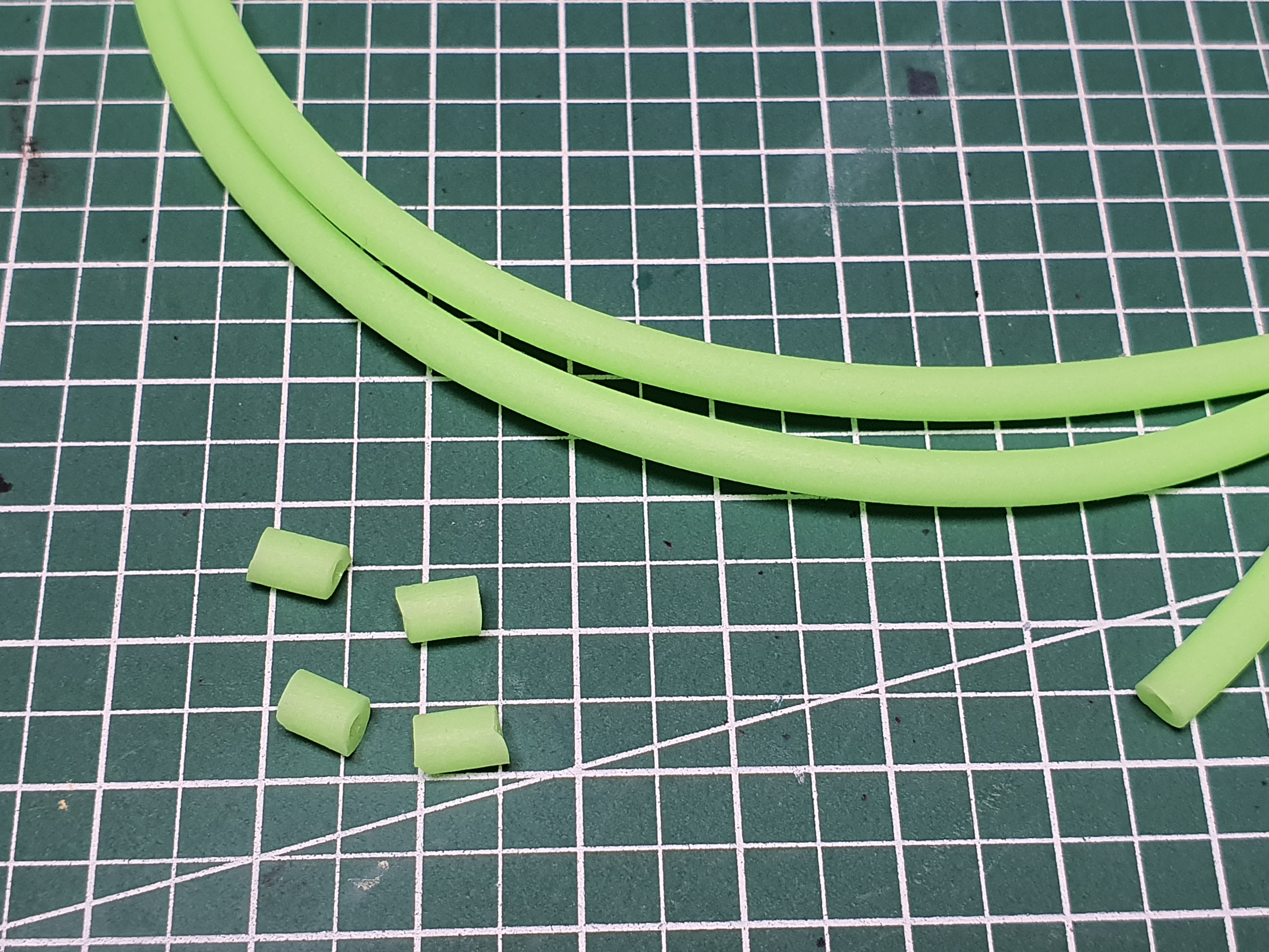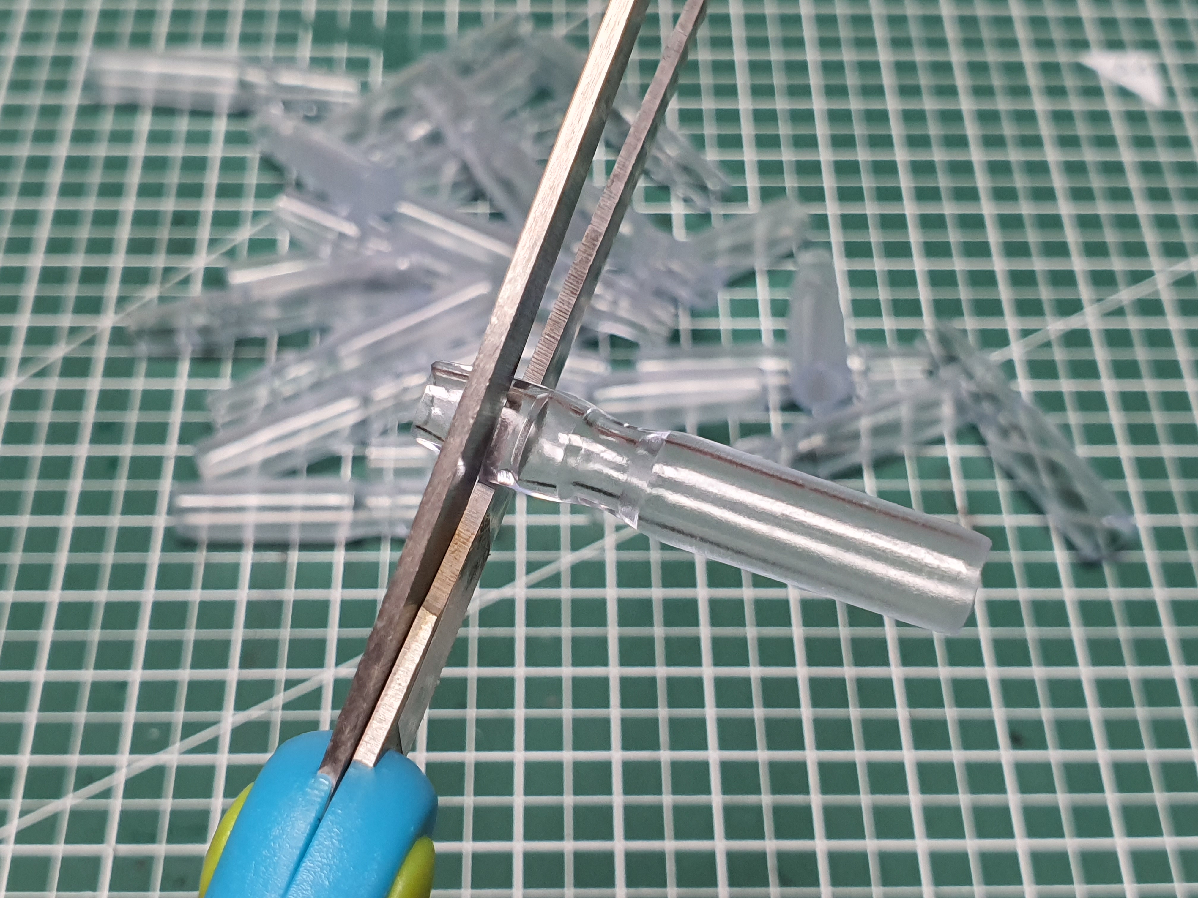 다음은 축광튜브를 LED - 다리를 감싸서 합선이 일어나지 않도록 해 줍니다. 축광튜브는 가능한 LED와 같은 색을 넣으면 보다 효과적이겠지요. 투명한 것을 사용해도 문제는 없습니다. +, - 다리가 만나지 않게 하는게 가장 큰 목적이니까요. 미리 0.5cm 정도로 잘라서 준비를 해 둡니다.