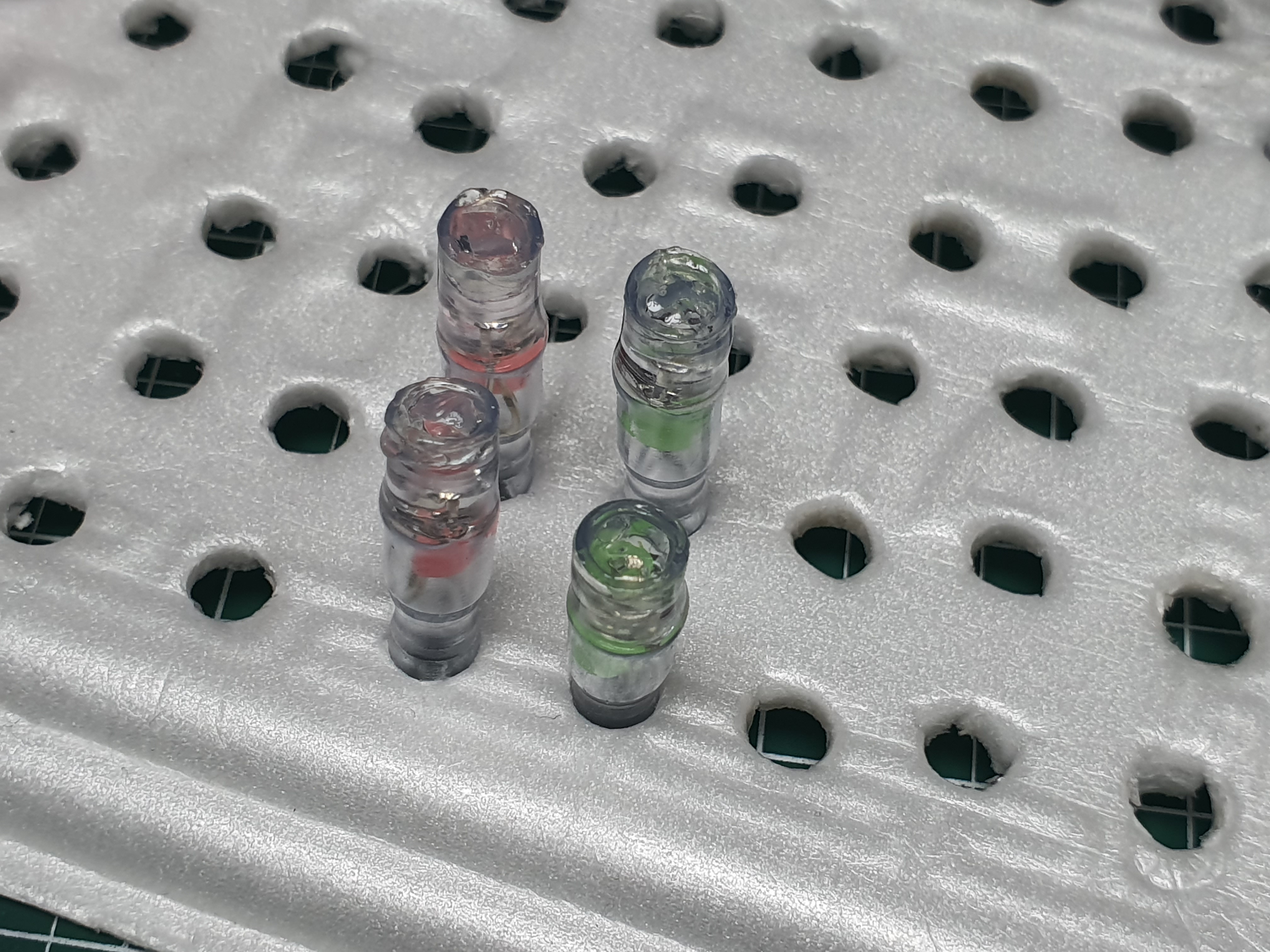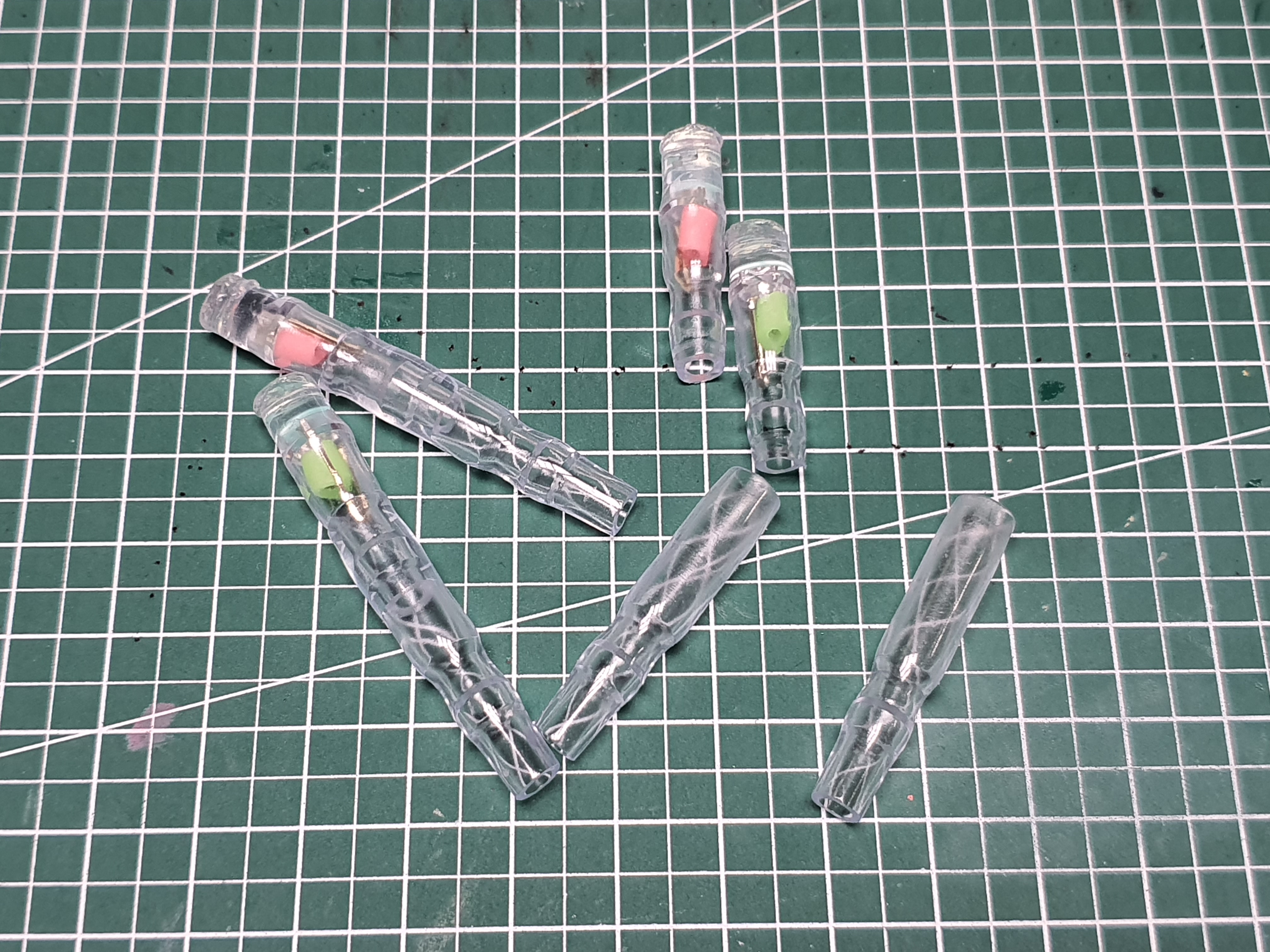 실리콘 접착제가 말랑말랑하게 굳으면 재단하지 않은 절연캡을 끼워 하나의 완성된 자작 줄보기캐미를 완성시킵니다. 이로써 자작줄보기캐미 제작방법이 끝났네요.