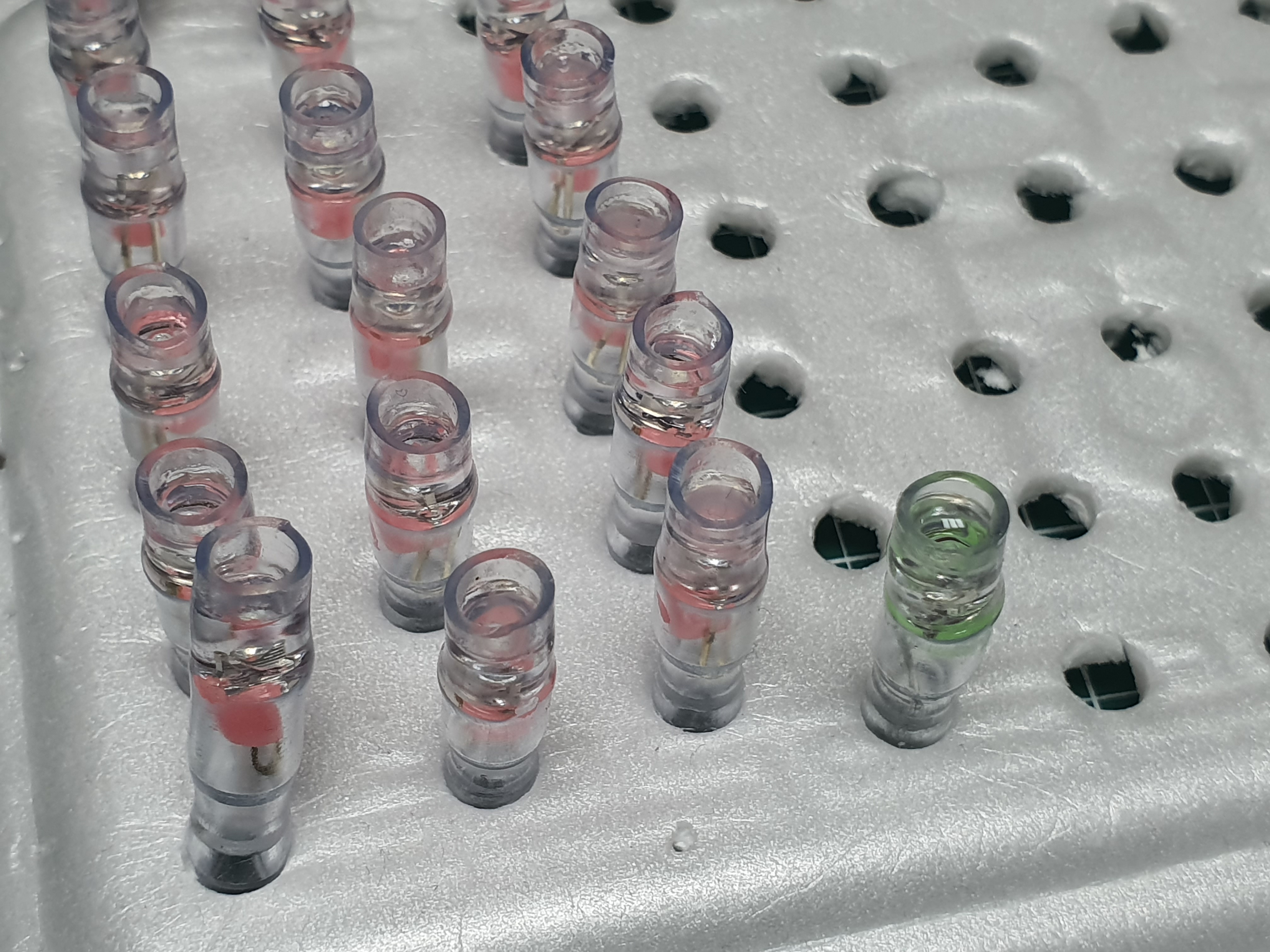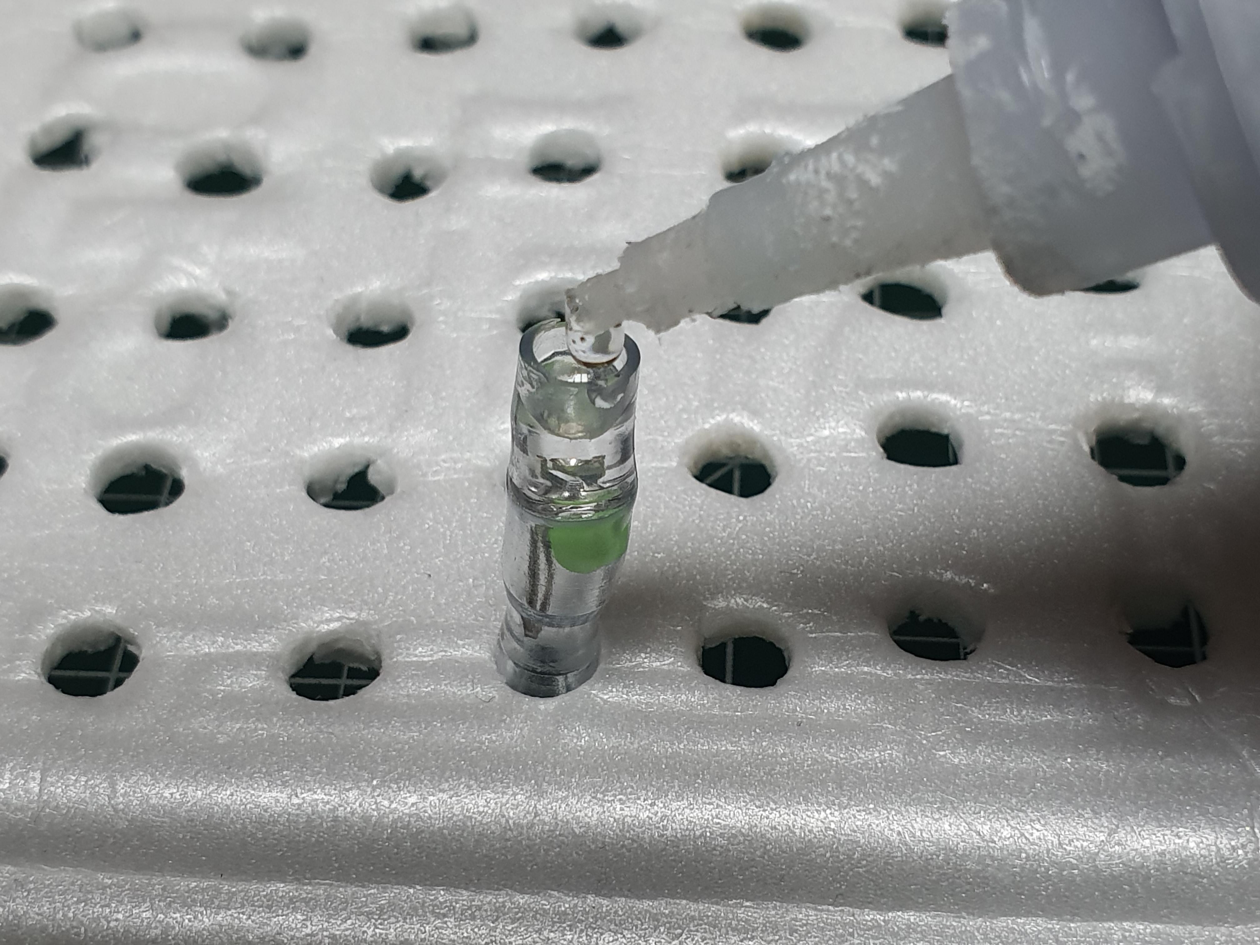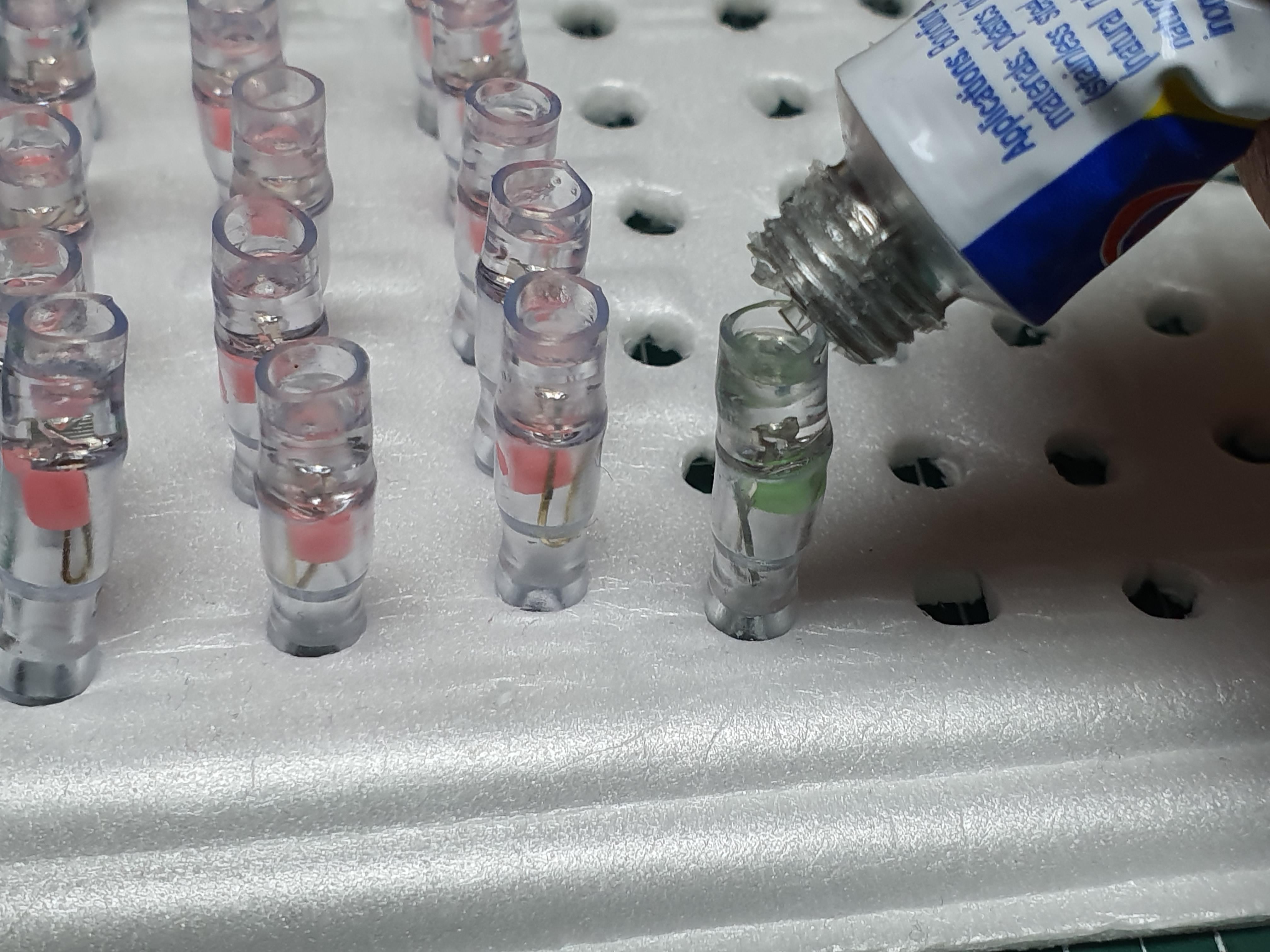 실리콘 접착제를 채우는 작업도 앞서 순간접착제 작업과 마찬가지로 여러개를 한번에 하는것이 좋습니다. 실리콘 접착제는 바로 굳는 것이 아니기 때문에 최소 하루가 지나야 합니다. 사용 후 남은 실리콘 접착제도 사용하지 않고 놔두면 천천히 굳기 때문에 비닐에 습기제거제와 함께 포장해 두면 좀 더 굳는 것을 방지 할 수 있습니다.