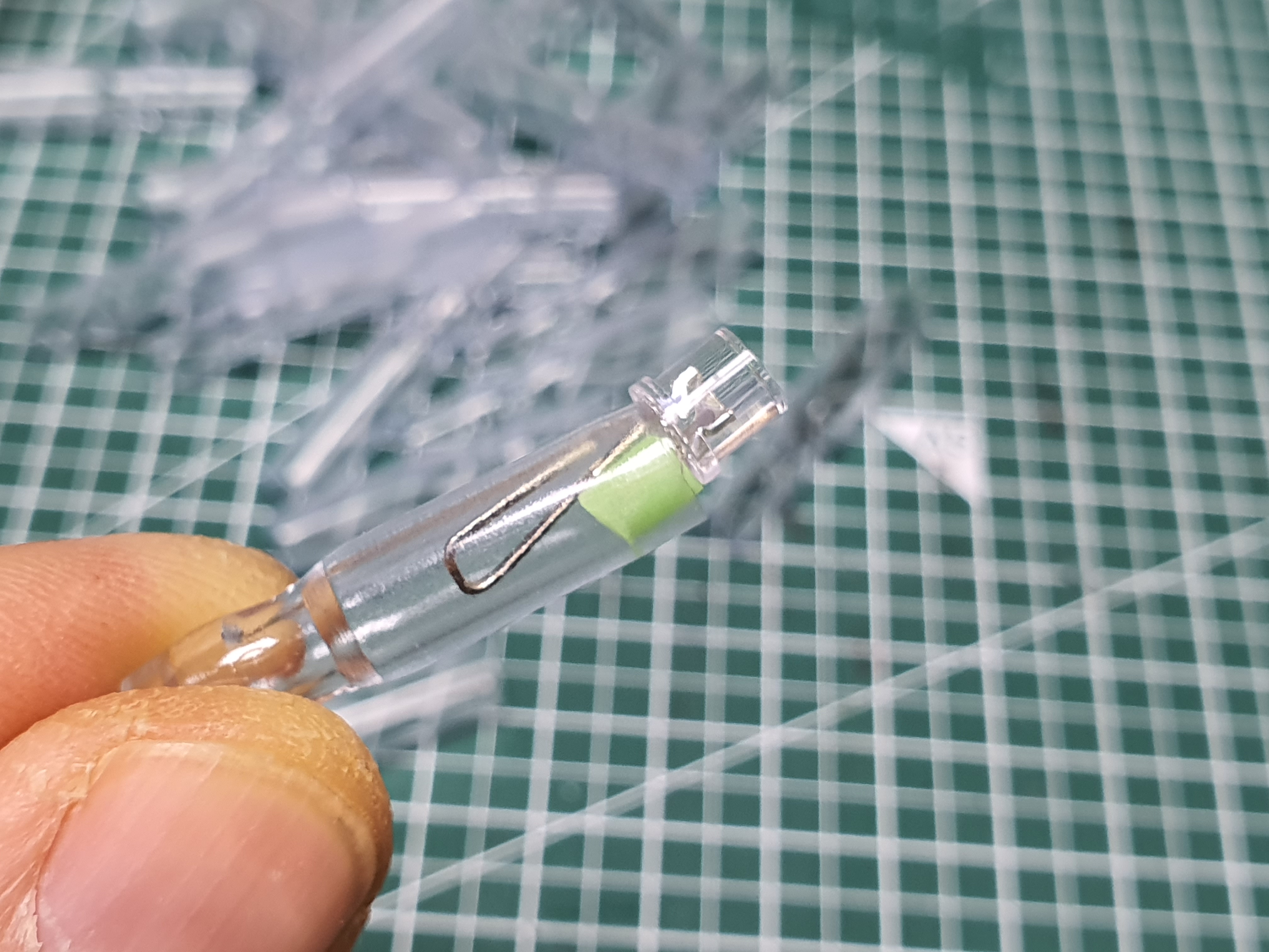 이때 주의 할 것은 축광튜브보다 LED - 다리가 길어서 축광튜브 밖으로 튀어나오지 않도록 해야 합니다. 그럴경우 캐미 완성후 배터리를 끼우면 배터리 + 단자(몸통)와 만나 불이 들어오지 않더군요.