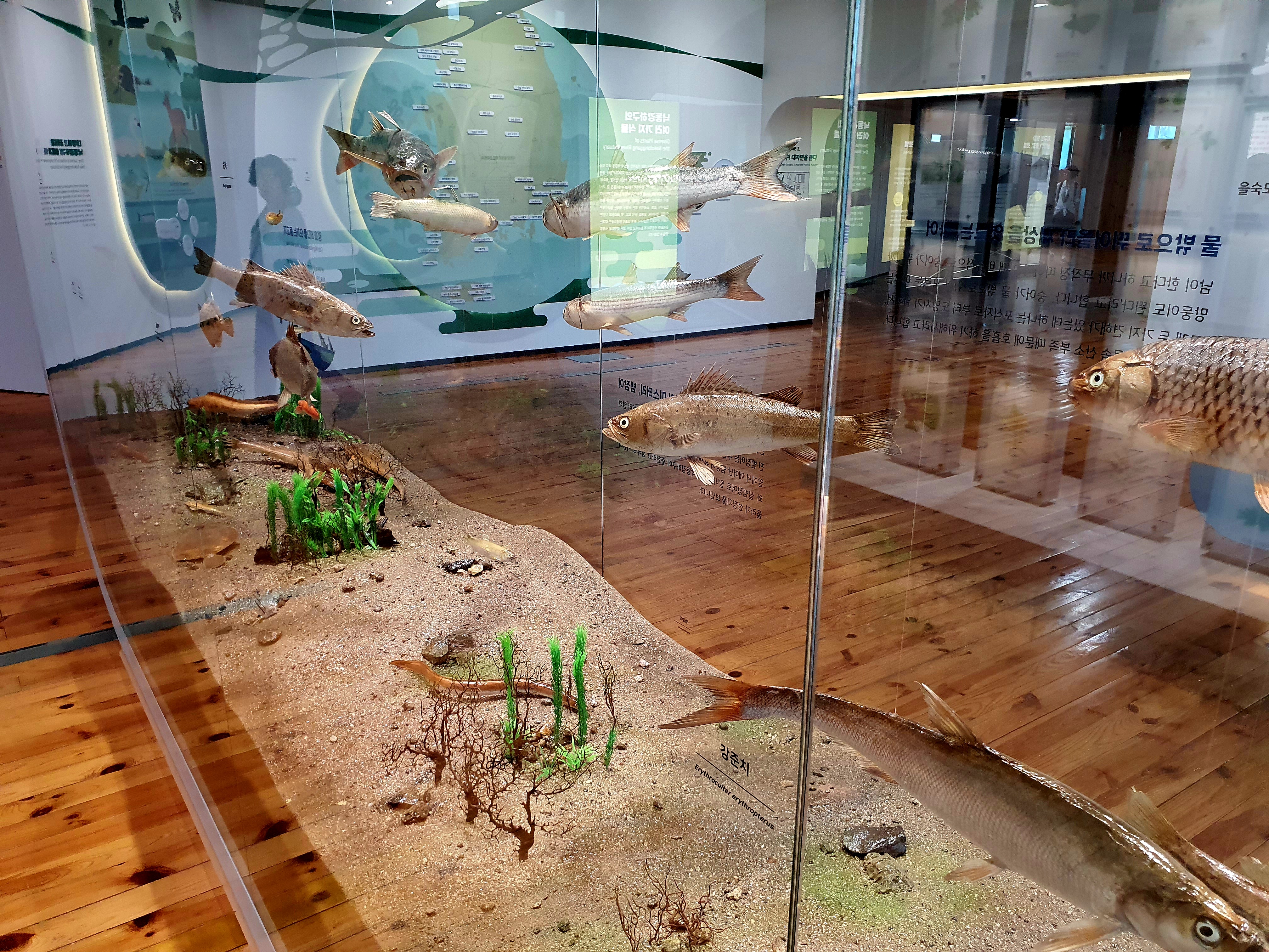 을숙도를 비롯해 낙동강하구에 서식하는 각종 동식물 모형들이 전시되어 있는데요. 바다와 민물에 서식하는 고기들도 있구요. 그 옆에는 식물들도 설명되어 있습니다.