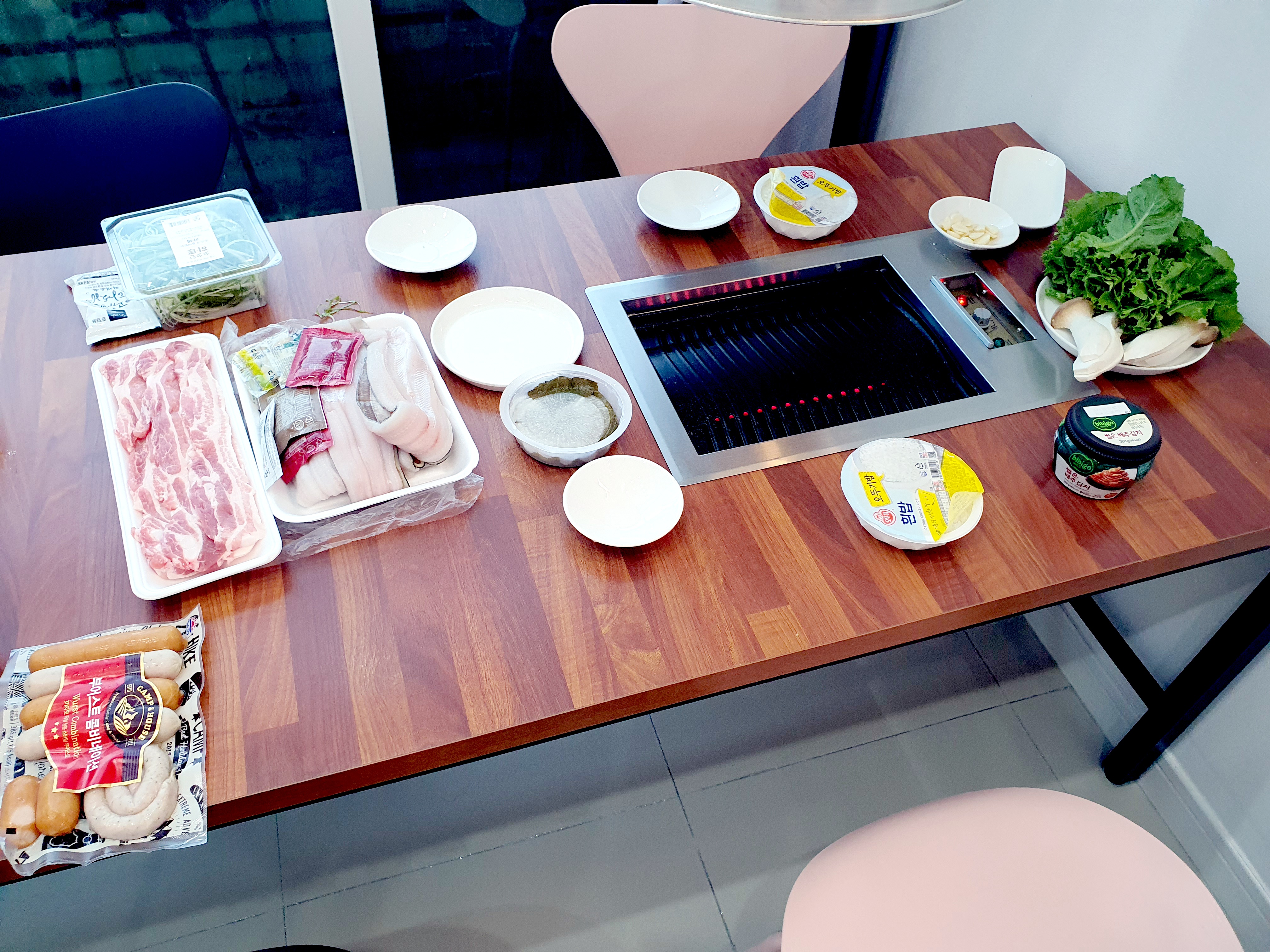 저녁식사는 마트에서 미리 장을 봐온 삼겹살과 장어를 굽기로 합니다. 전기 BBQ를 사전에 이야기하면 2만원 추가비용으로 이용할 수 있더군요. 숯불이 아니고, 덕트가 있어서 숙소 안에서도 구이가 가능합니다.