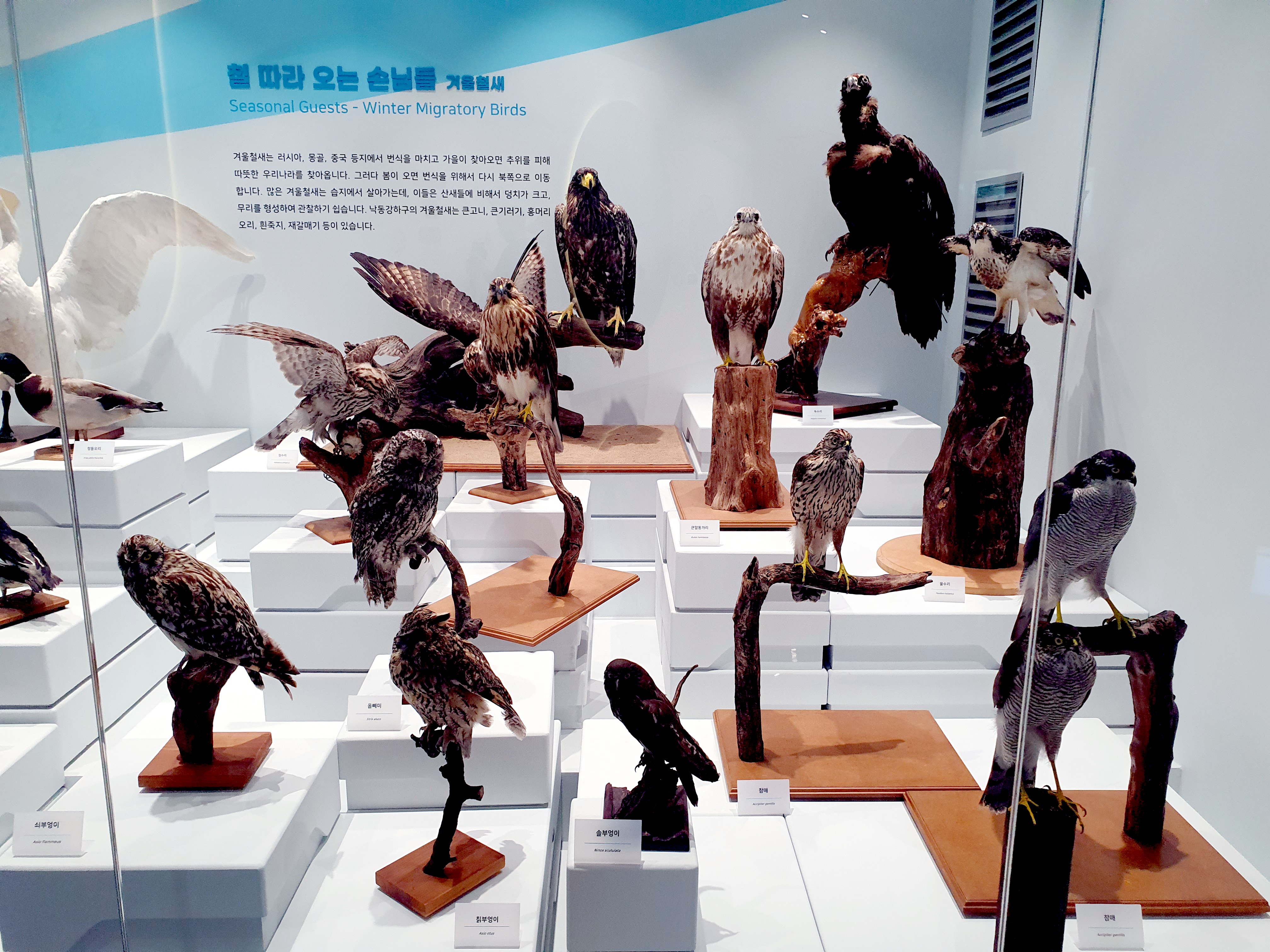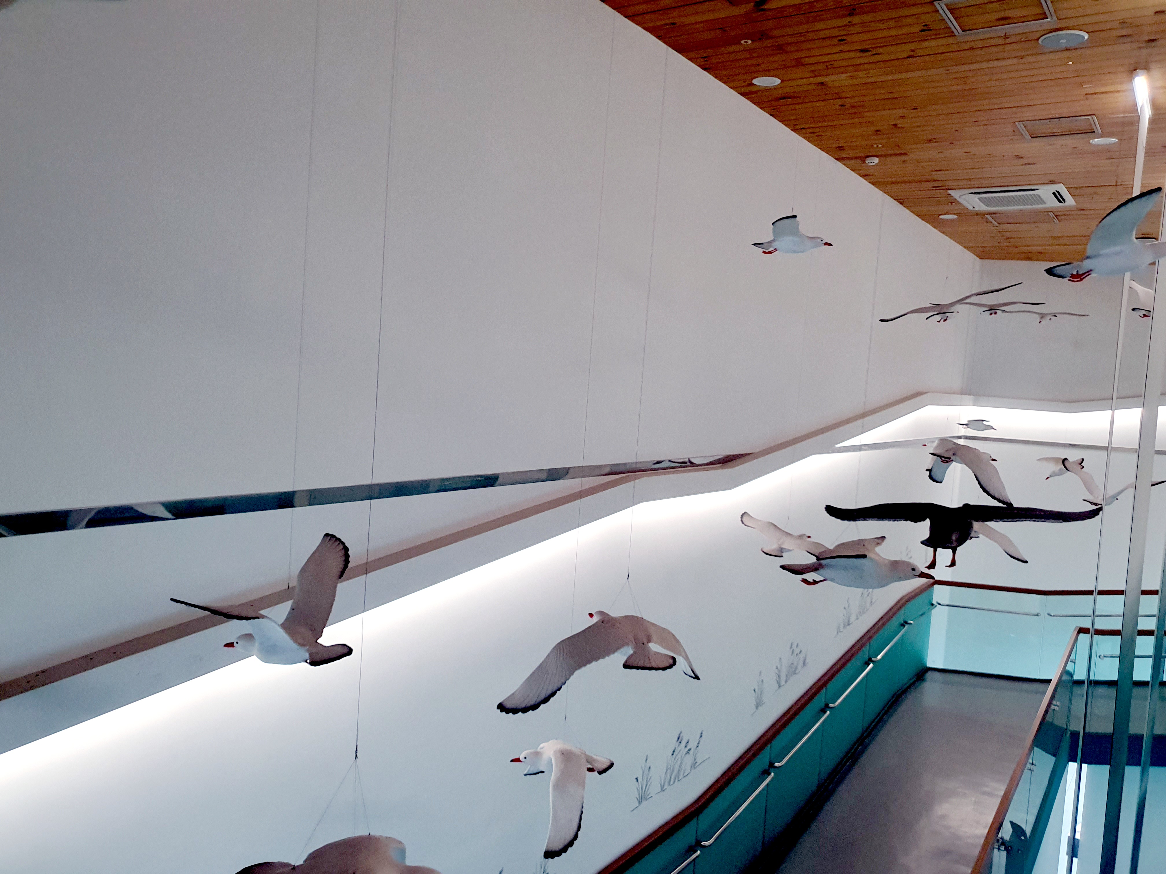 1층에는 안내센터, 기념품샵과 화장실이 있고 2층에 볼거리가 많습니다. 2층으로 갈 때 철새도래지인만큼 새들이 무리 지어 날아가는 것을 전시해 두었더군요