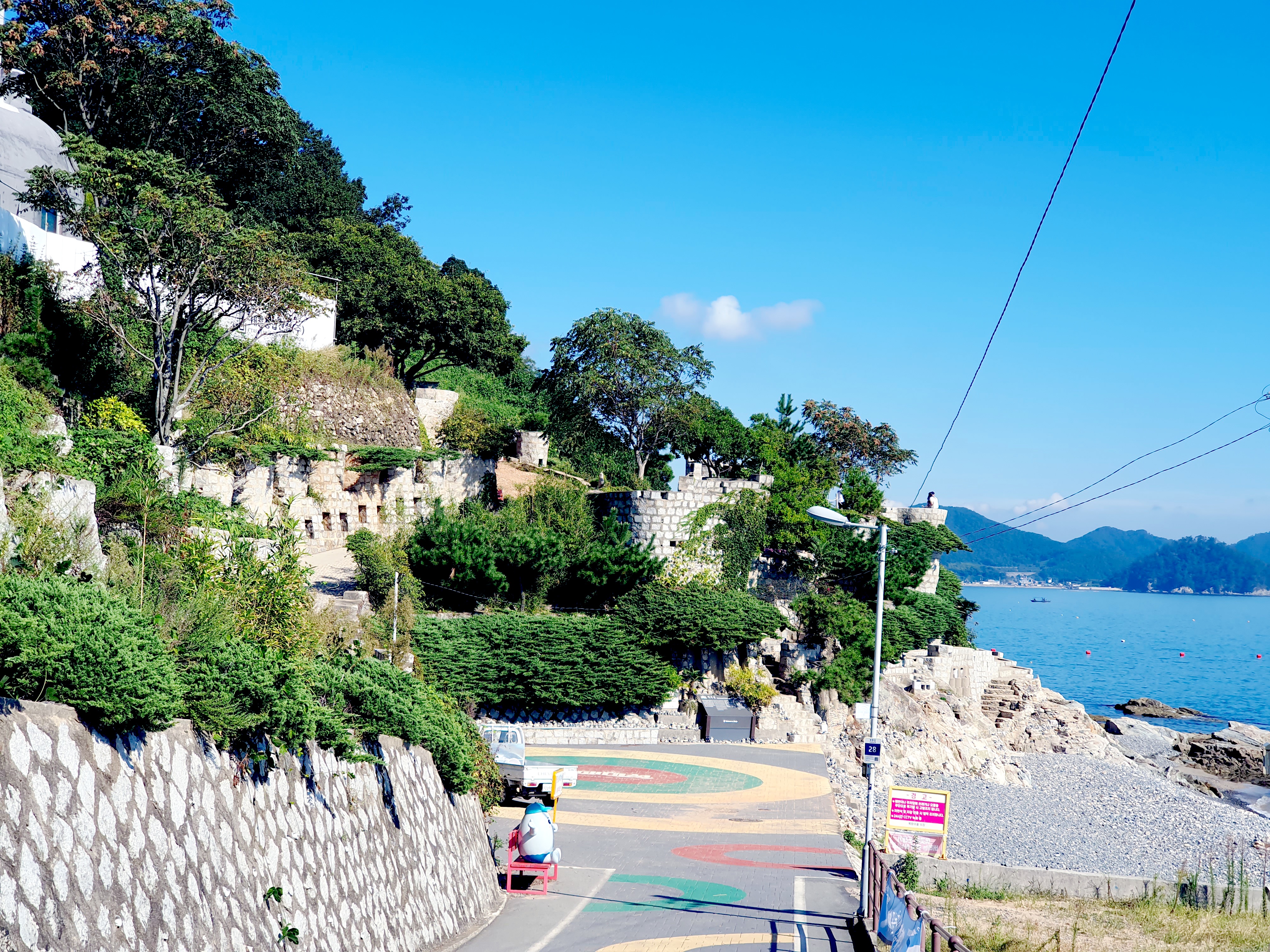 생각보다 큰 규모로 성벽을 쌓았고, 방문 당일에도 무언가 작업을 하고 있더군요. 주차장에 주차 후, 매미성 가는 길목에 여러 가게들이 있어서 꽤나 유명한 거제도 명소인 듯하네요.