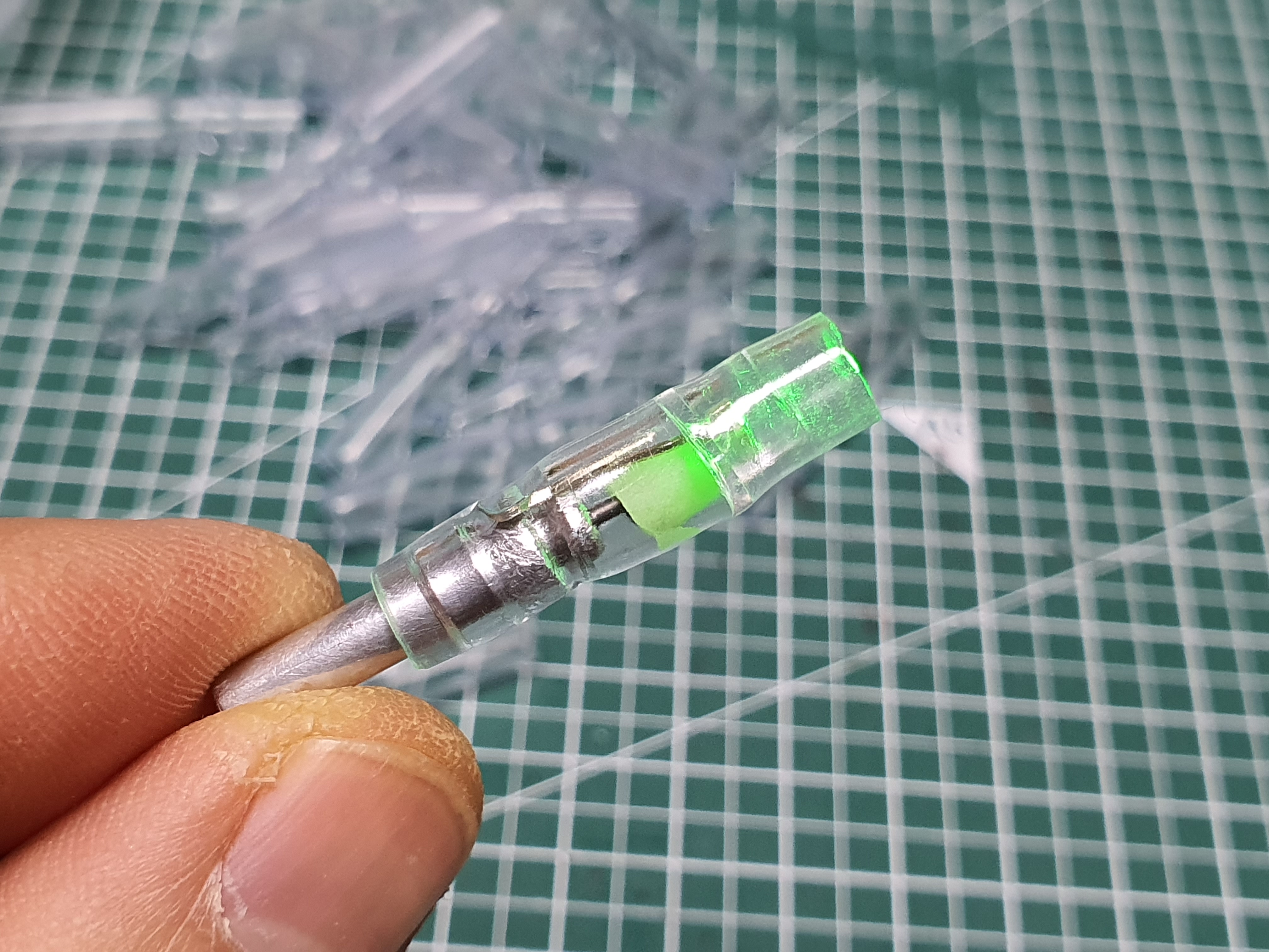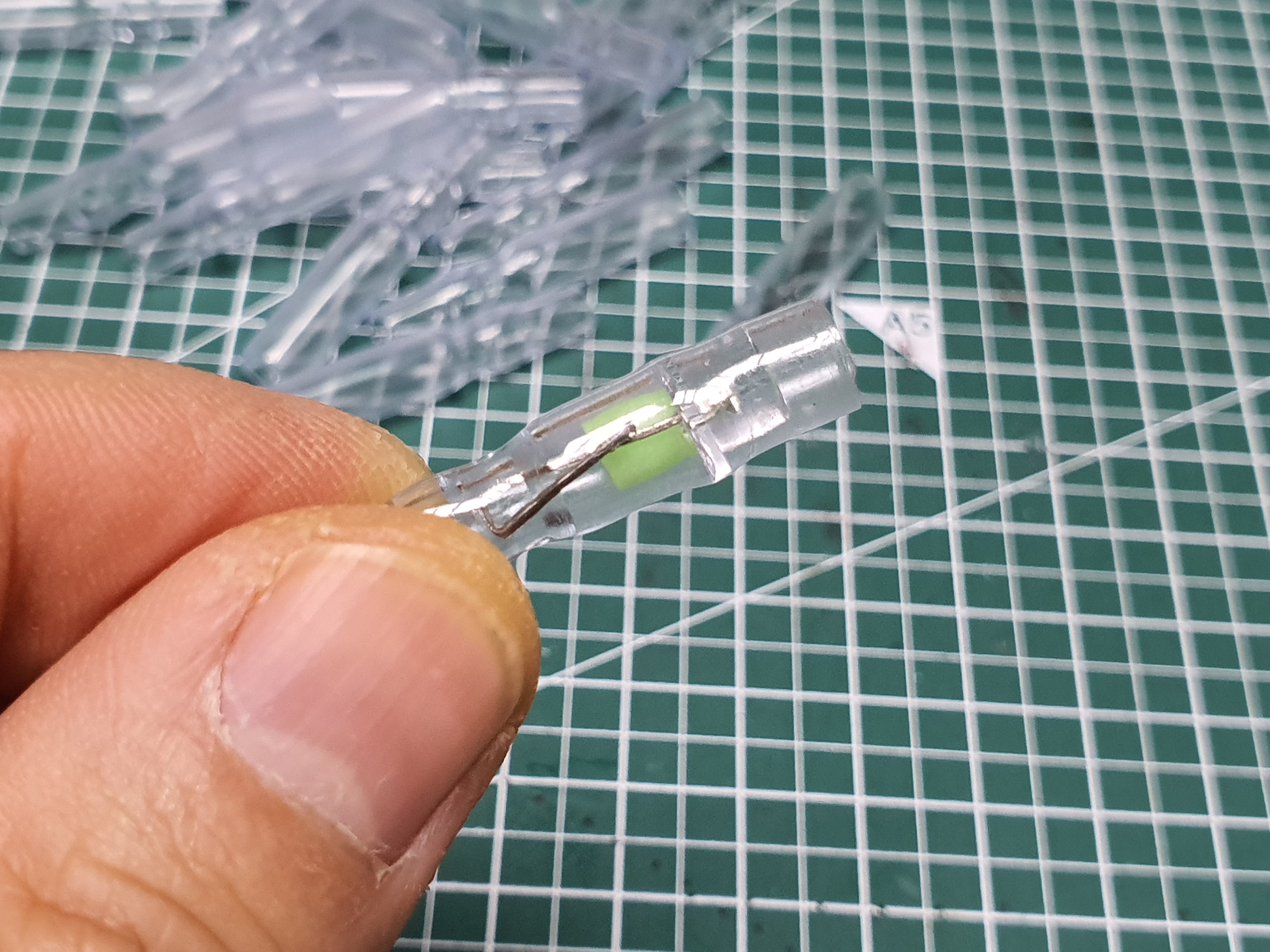 다음은 축광튜브를 LED - 다리를 감싸서 합선이 일어나지 않도록 해 줍니다. 축광튜브는 가능한 LED와 같은 색을 넣으면 보다 효과적이겠지요. 투명한 것을 사용해도 문제는 없습니다. +, - 다리가 만나지 않게 하는게 가장 큰 목적이니까요. 미리 0.5cm 정도로 잘라서 준비를 해 둡니다.
