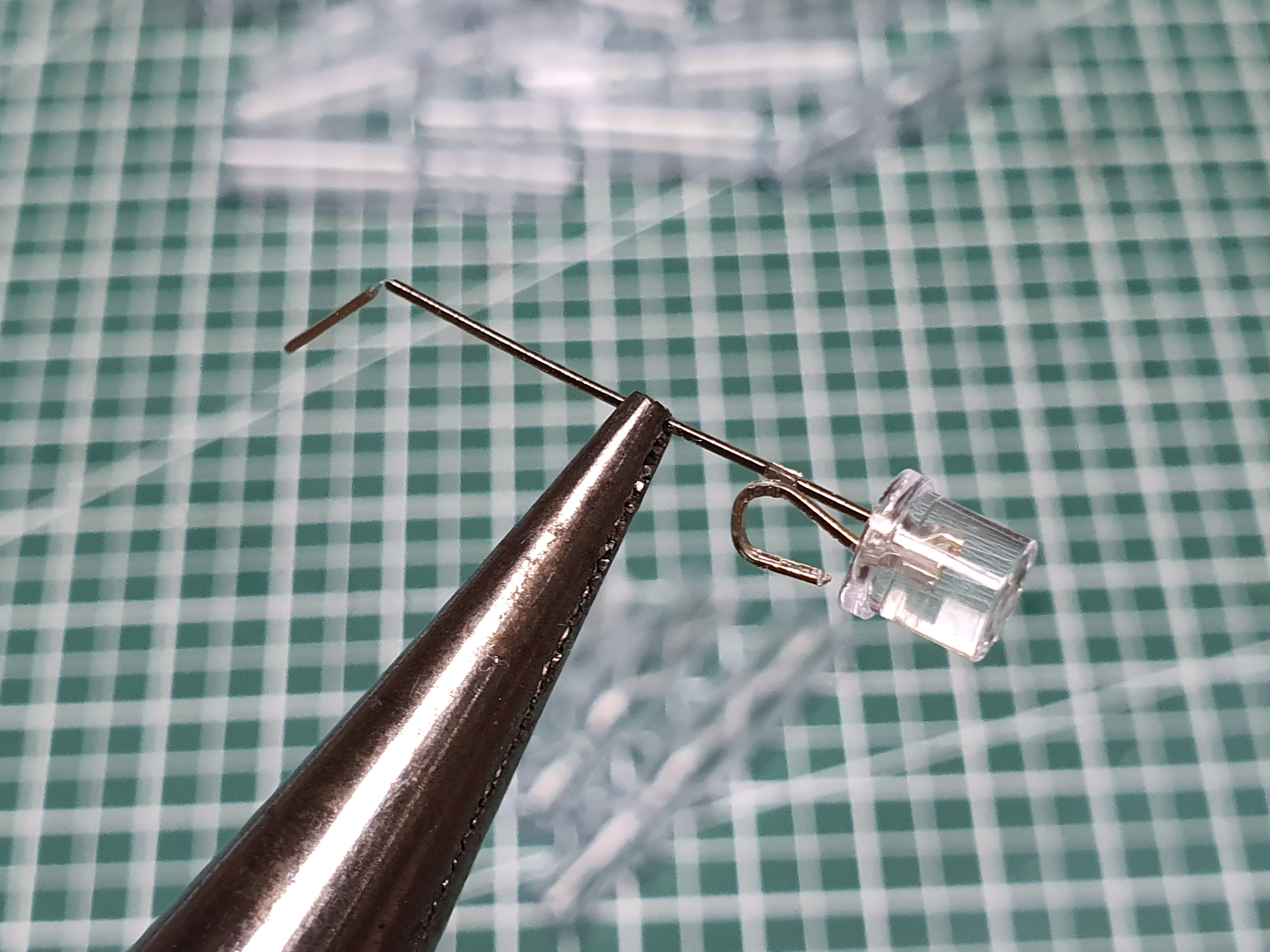 LED 다리 중 긴것은 +, 짧은 것은 - 로 알고 있는데, CR435 배터리에서 몸통은 +, 바늘처럼 나온 것이 - 이라고 생각하시면 됩니다. 먼저 짧은 다리를 약 0.5cm높이 정도로 만들기 위해 꺽어줍니다. 물론 남는 다리는 잘라내면 됩니다.