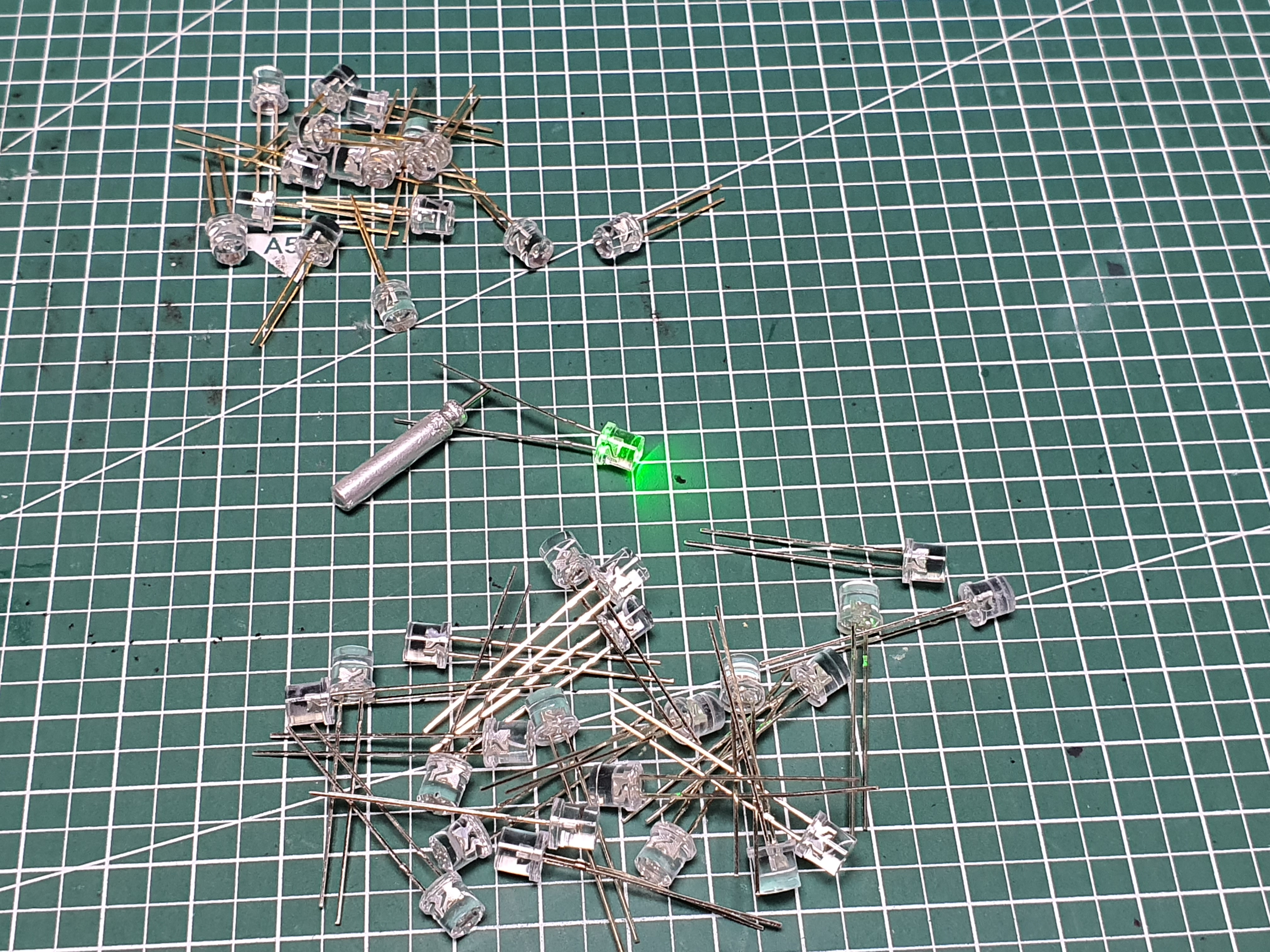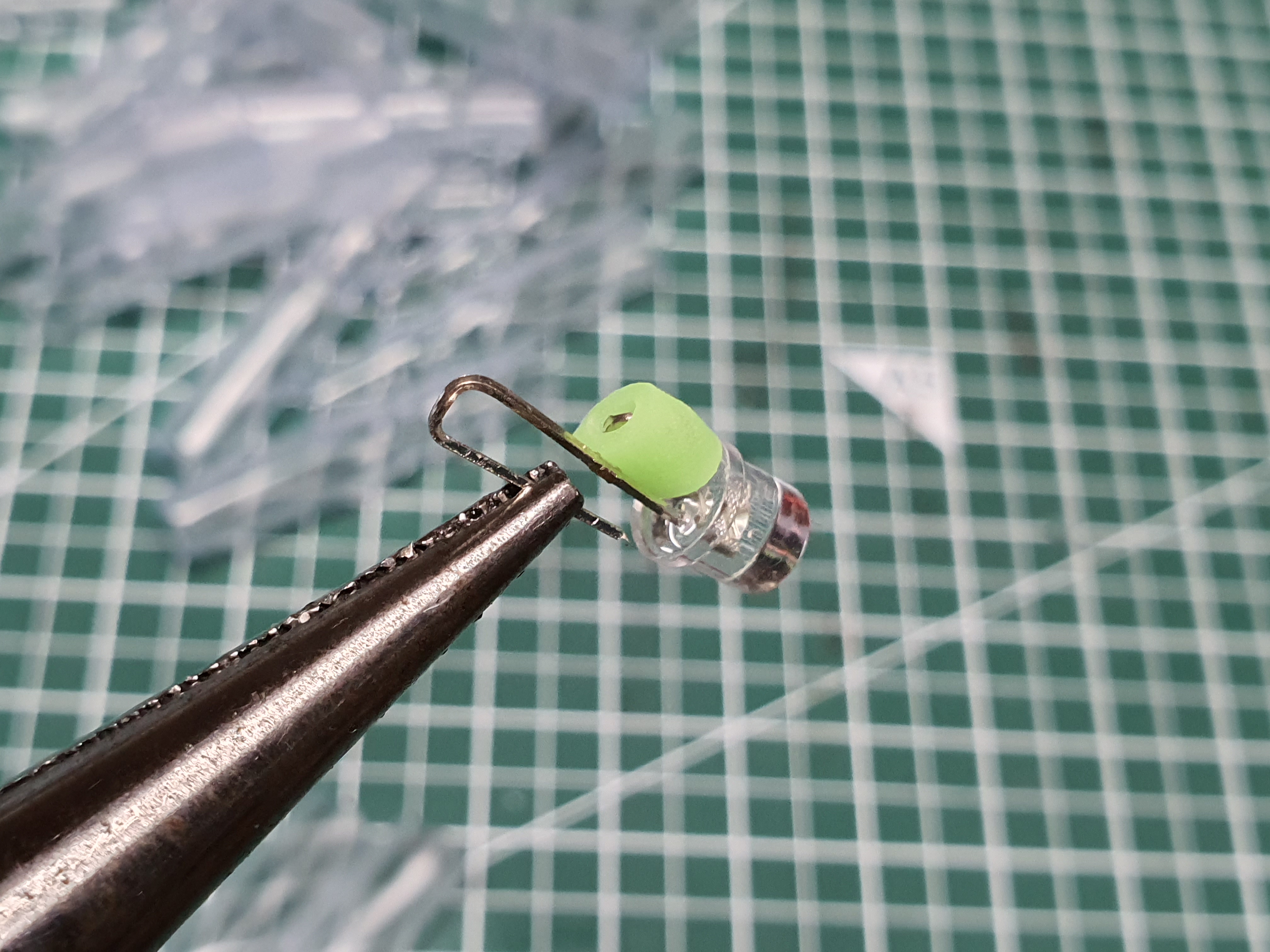 다음은 LED를 절연캡에 넣기 전에 LED 다리를 수정해 줍니다.가능하면 먼저 배터리를 이용해서 어떤 색의 LED인지 확인헤 주면 좋습니다. 축광튜브 색상을 맞춰야 하니까요.