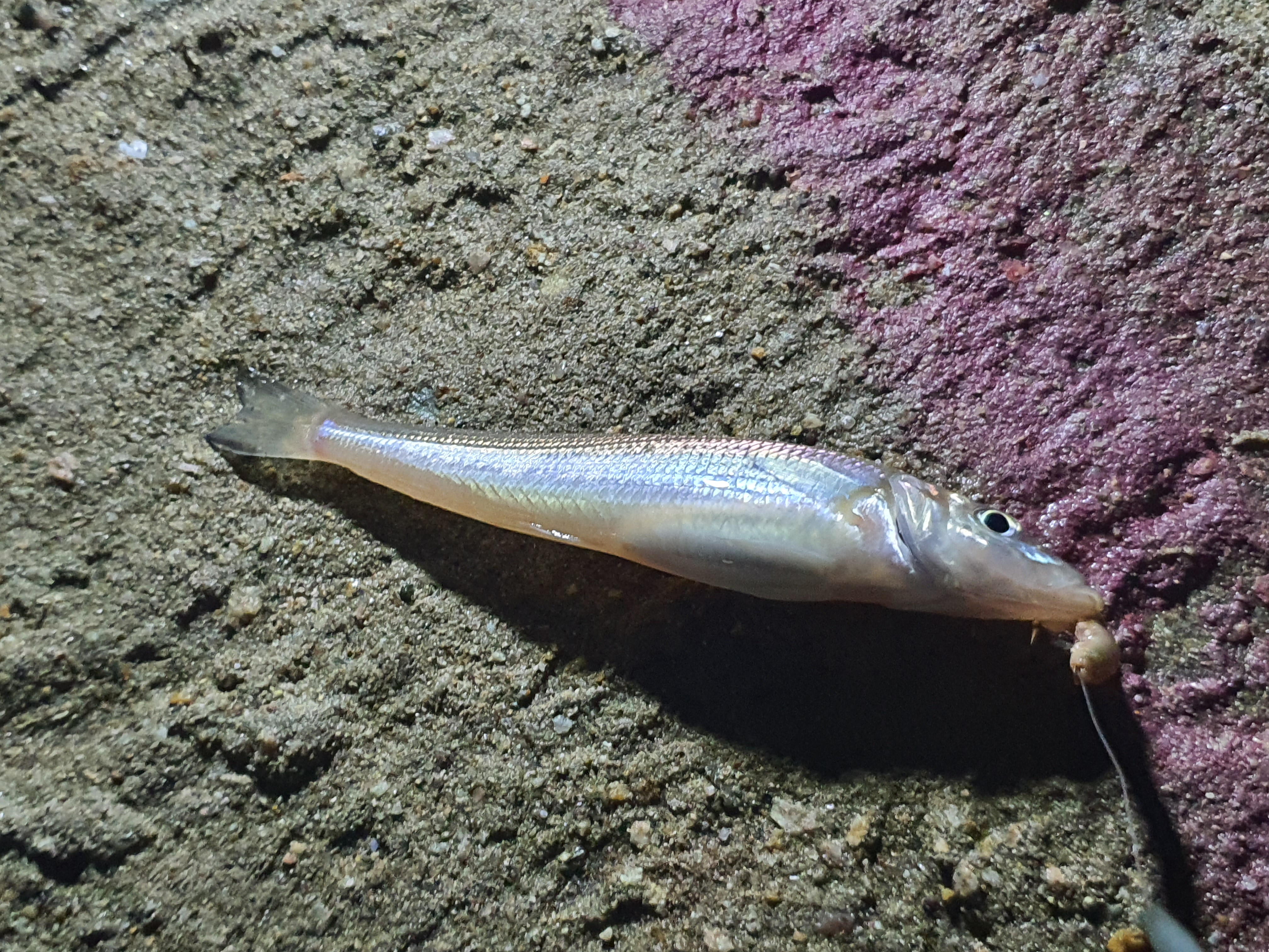 잠시 시간이 흐르고, 낚시 시작한지 40여분이 경과했을 뿐인데, 약한 입질이 오네요. 로드를 살짝 들어 봤으나 느낌이 없어 내려 놓았지만, 계속 톡톡 칩니다. 혹시나해서 채비를 회수하니 보리멸이 걸려 있네요.