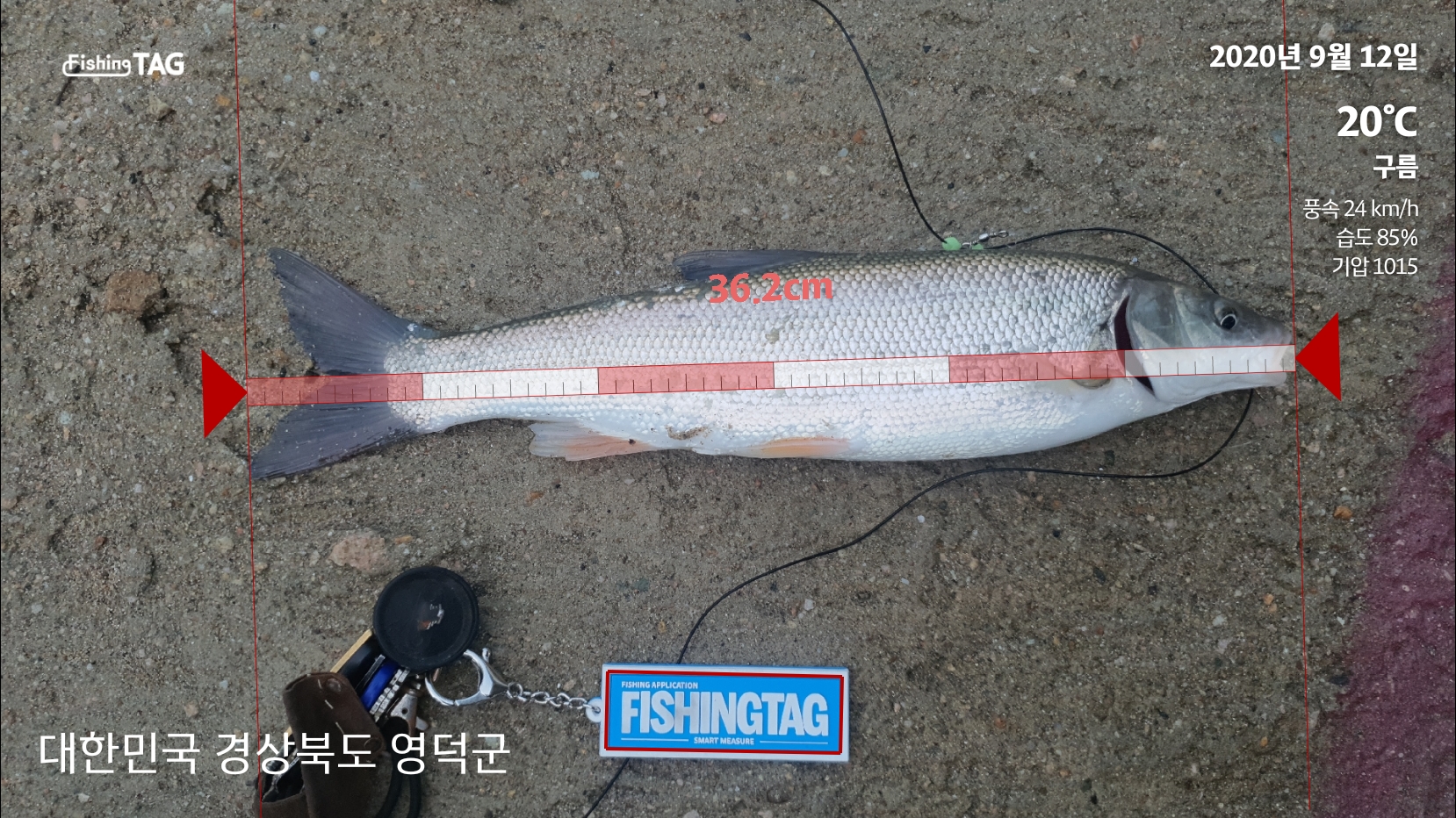 던지고 나서 그리 시간이 지나지 않아, GT30-425에 강한 입질이 옵니다. 로드를 들고 있다가 또다시 큰 입질이 왔을 때, 챔질을 하니 히트!! 생애 첫 황어(황선생)가 올라옵니다. 사이즈도 준수하게 36.2cm 3짜입니다.