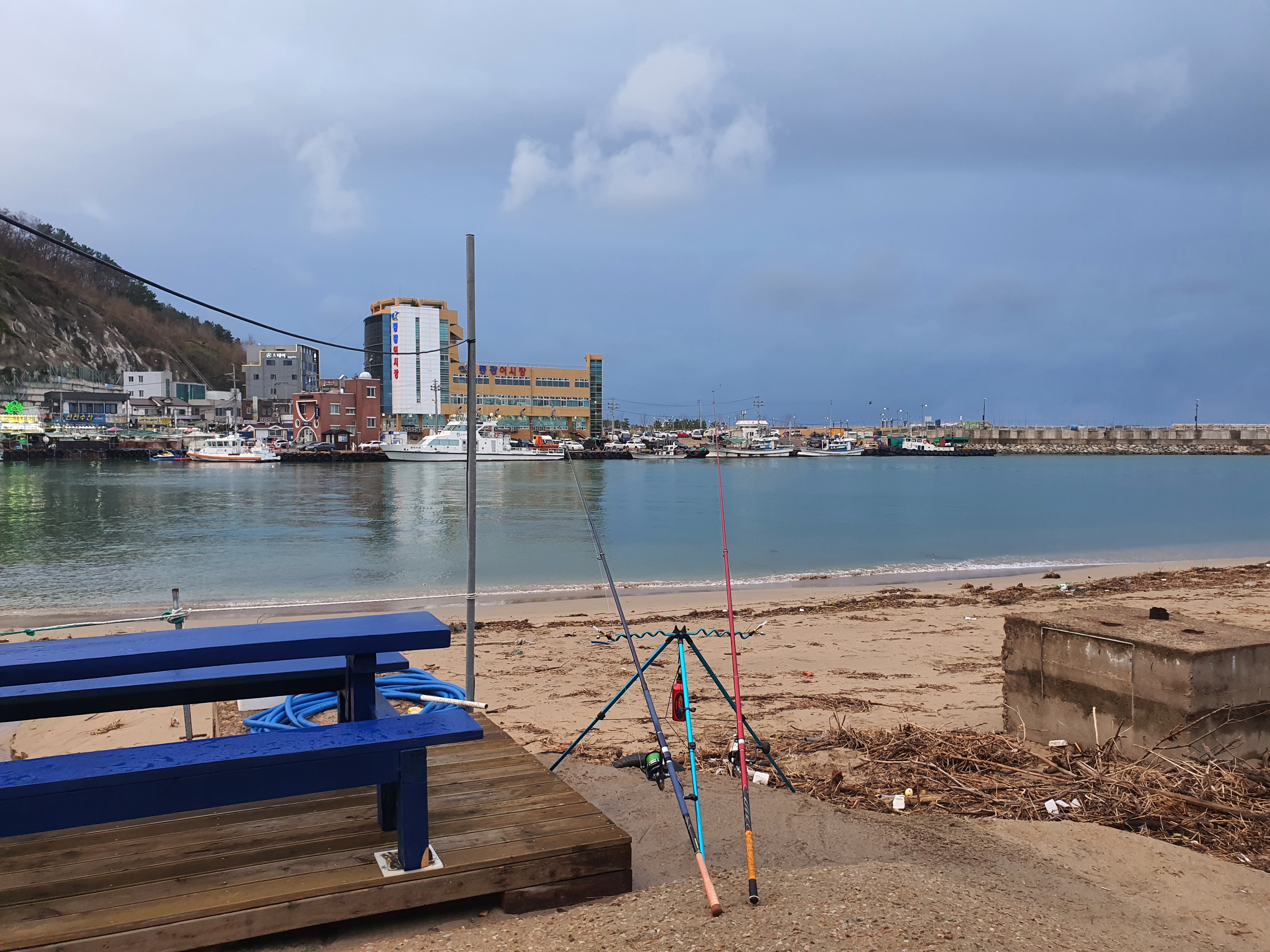 외항은 높은 파도로 강구항 방파제를 넘을 정도인데, 내항쪽이라 파도가 거의 없어서, 낚시대는 모래밭으로 내려가지 않고, 위쪽 발판 좋은 곳에 쌍포로 폈네요.