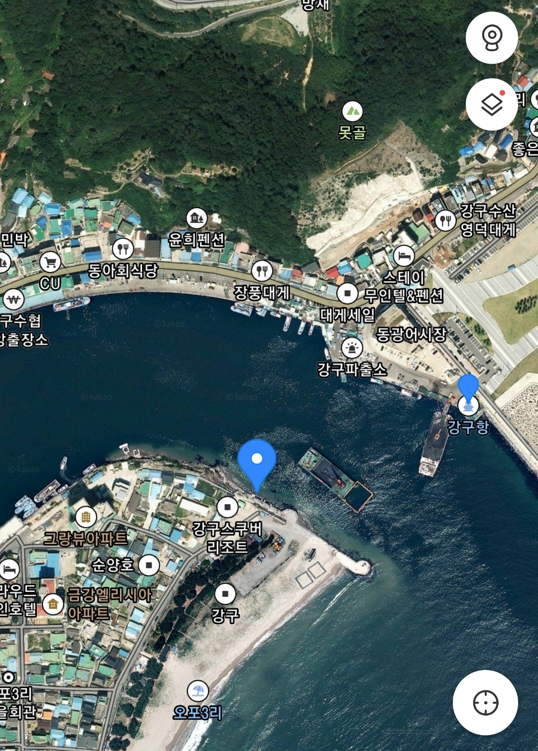 도착 후, 에이스형님을 만나서 미리 배를 채우기 위해서 근처 중국집으로 가 짬뽕을 맛나게 먹고, 간조타이밍에 낚시를 시작해 봅니다. 위치는 아래 큰 파란색으로 표시된 곳입니다.