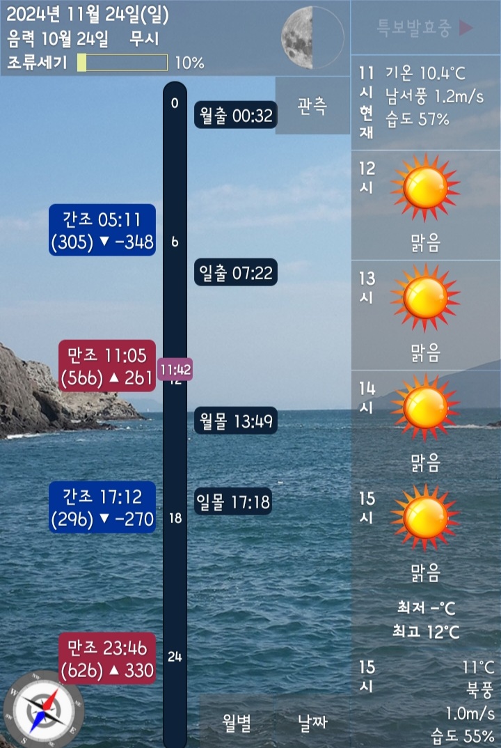 바람은 거의 없고, 파도도 잔잔해 낚시하기에는 딱 좋고, 봄날씨처럼 추위보다 따뜻함이 느껴지는 날씨였는데 물때가 마침 무시더군요. 뭐 무시하고 채비를 던져봤습니다.
