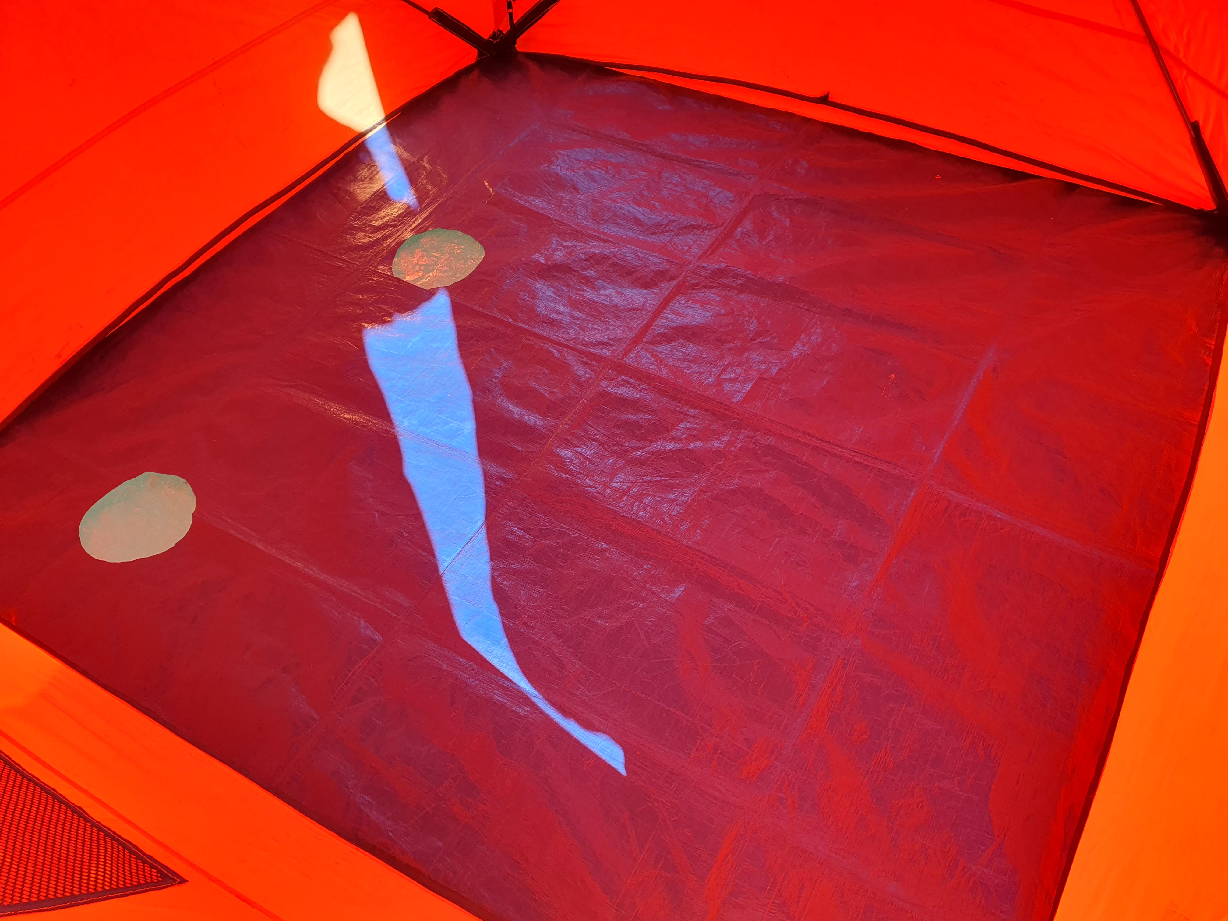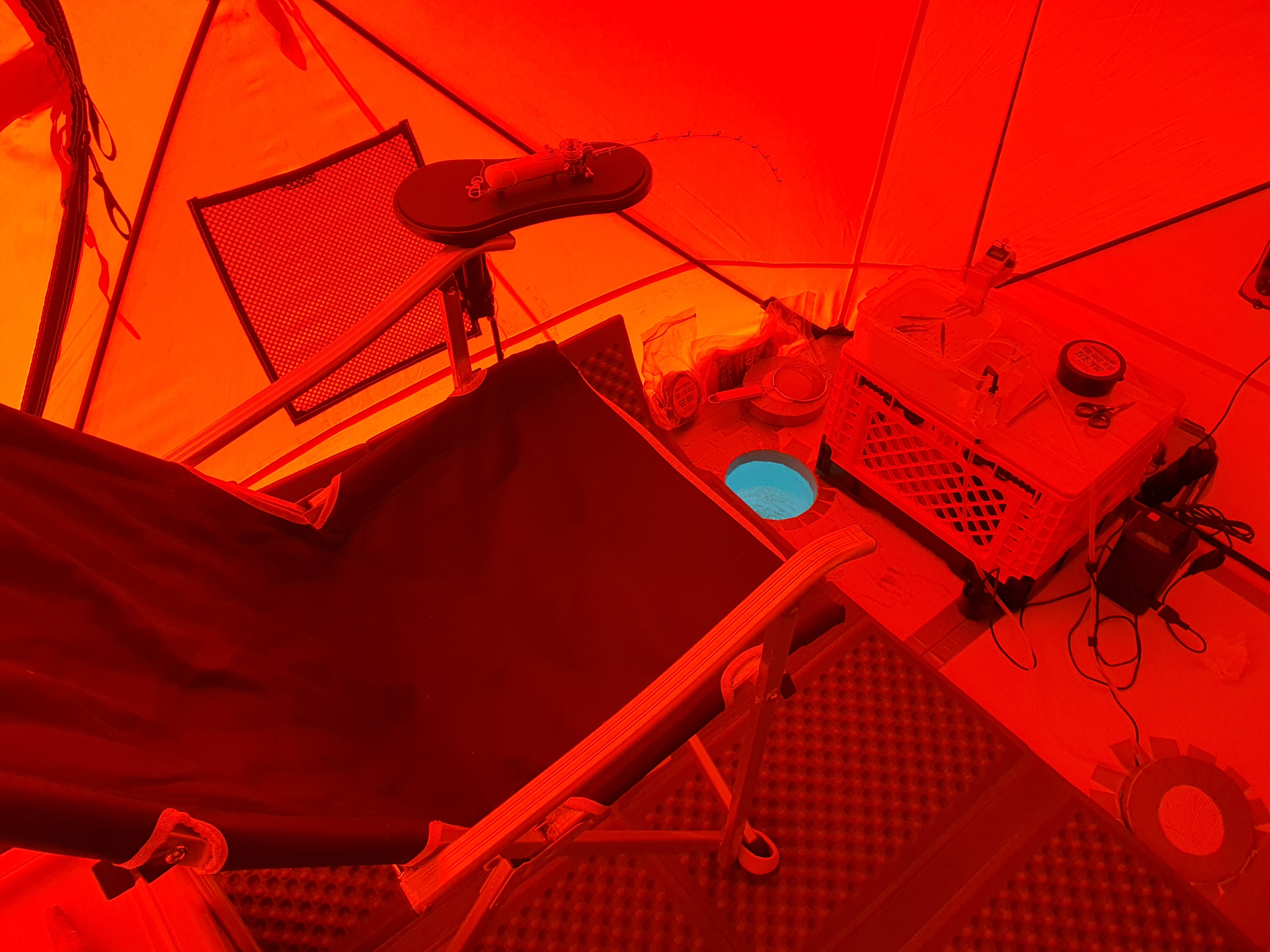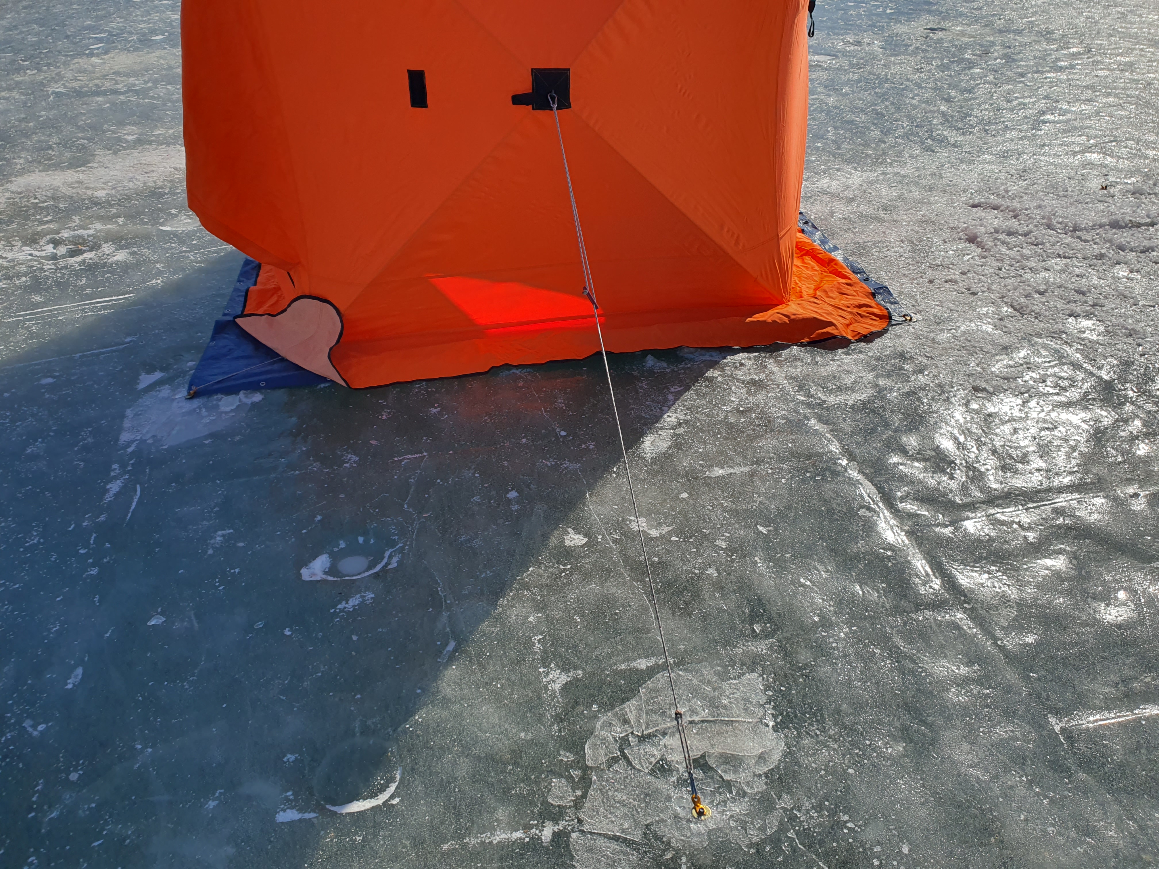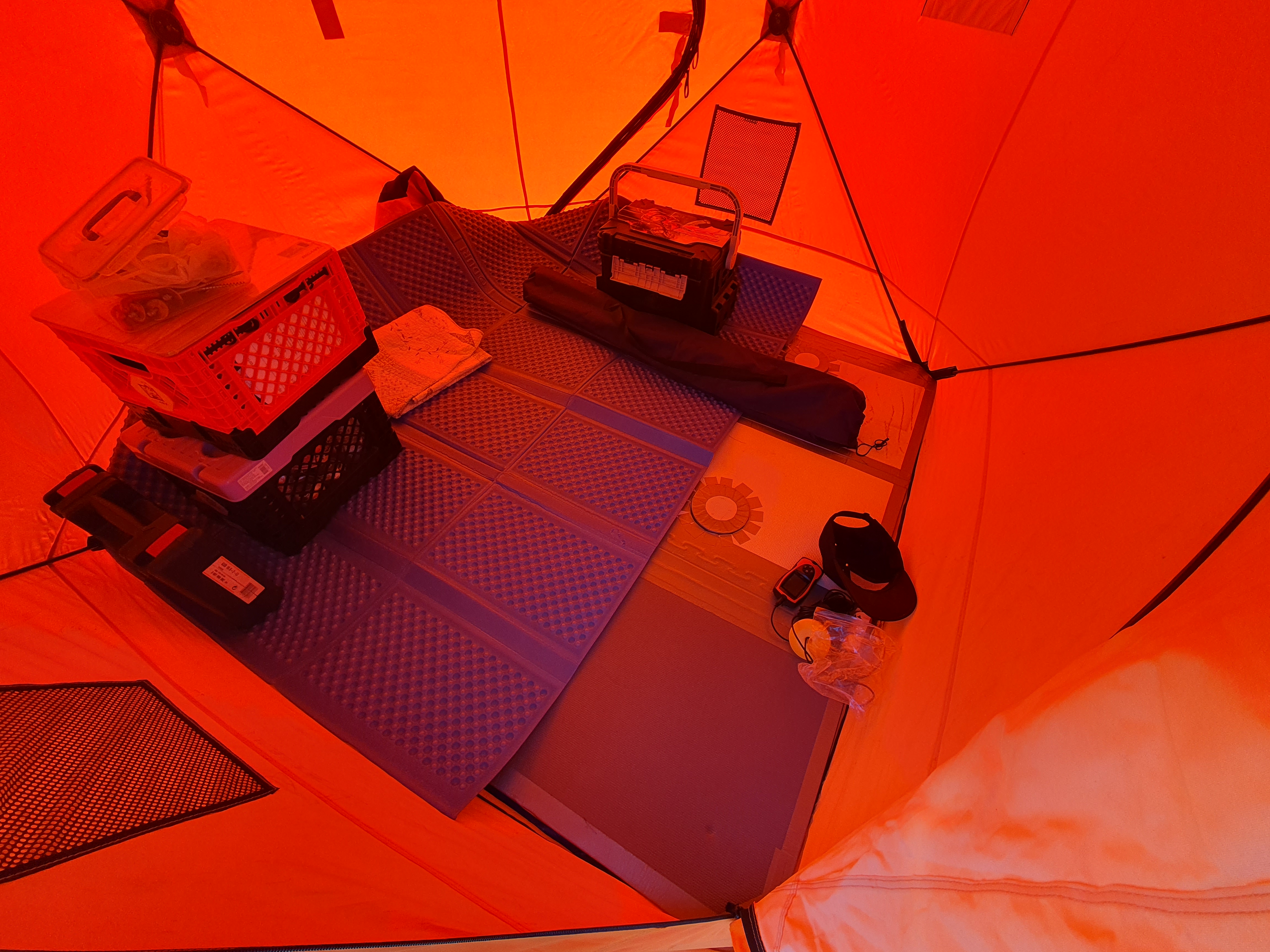 텐트 내부는 자작한 매트바닥을 빙판 구멍과 맞추어 깔아주고, 캠핑 매트를 하나 더 깔아주니 빙판에서 오는 냉기가 어느 정도 차단되더군요.